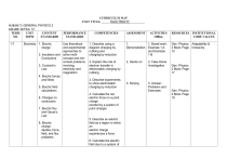 CURRICULUM MAP UNIT TITLE: ______ ELECTRICITY __________ SUBJECT: GENERAL PHYSICS 2 GRADE LEVEL: 12 TERM UNIT CONTENT NO. TOPIC STANDARDS 1-7 Electricity 1. Electric charge PERFORMANCE STANDARDS Use theoretical and experimental approaches to 2. Insulators and solve multiConductors concept and richcontext problems 3. Coulomb’s involving Law electricity and magnetism 4. Electric forces and fields 5. Electric field calculations 6. Charges on conductors 7. Electric flux and Gauss’s Law 8. Electric charge, dipoles, force, field, and flux problems COMPETENCIES ASSESSMENT ACTIVITIES Offline RESOURCES INSTITUTIONAL CORE VALUES 1. Describe using a diagram charging by rubbing and charging by induction 1. Demonstration 1. Board-work: Example 1.A and Example 1.B Gen. Physics 2 Book: Page 12 Adaptability & Inclusivity 2. Explain the role of electron transfer in electrostatic charging by rubbing 2. Hands on 2. Take-Home Investigation 3. Describe experiments to show electrostatic charging by induction 4. Calculate the net electric force on a point charge exerted by a system of point charges 5. Describe an electric field as a region in which an electric charge experiences a force 6. Calculate the electric field due to a system of 3. Solving 3. Answer: Problems and Exercises Gen. Physics 2 Book: Page 17 Gen. Physics 2 Book: Page 19 point charges using Coulomb’s law and the superposition principle 7. Calculate electric flux 8. Use Gauss’s law to infer electric field due to uniformly distributed charges on long wires, spheres, and large plates 1. Electric potential energy 2. Electric potential 3. Equipotential surfaces 4. Electric field as a potential gradient 5. Electric potential 9. Solve problems involving electric charges, dipoles, forces, fields, and flux in contexts such as, but not limited to, systems of point charges, electrical breakdown of air, charged pendulums, electrostatic ink -jet printers 1. Relate the electric 1. potential with work, Demonstration potential energy, and electric field 2. Determine the electric potential function at any point due to highly symmetric continuous - charge Distributions 3. infer the direction and strength of electric field vector, nature of the electric field sources, and 2. Essay 1. Board-work: Workout and solve Example 2.A, 2.B, 2.C, 2.D, and 2.E Gen. Physics Adaptability 2 Book: Page Inclusivity 22-25, and 27 2. Answer: Problems and Exercises Item No. 1 & No. 2 Gen. Physics 2 Book: Page 29 & electrostatic potential surfaces given the equipotential lines 4. Calculate the electric field in the region given a mathematical function describing its potential in a region of space 1. Capacitance and capacitors a. Capacitors in series and parallel b. Energy stored and electric-field energy in capacitors 2. Dielectrics 5. Solve problems involving electric potential energy and electric potentials in contexts such as, but not limited to, electron guns in CRT TV picture tubes and Van de Graaff generators 1. Deduce the effects of simple capacitors (e.g., parallel -plate, spherical, cylindrical) on the capacitance, charge, and potential difference when the size, potential difference, or charge is changed 2. Calculate the equivalent capacitance of a network of capacitors connected in series/parallel 3. Determine the total charge, the charge on, and the potential difference 1. Demonstration 1. Board-work: Workout and solve Example 3.A, 3.B, 3.C, and 3.D 2. Conceptual Mapping 2. Answer: Problems and Exercises Gen. Physics Adaptability 2 Book: Page Inclusivity 33, 35, 37, and 39 Gen. Physics 2 Book: Page 39 & across each capacitor in the network given the capacitors connected in series/parallel 4. Determine the potential energy stored inside the capacitor given the geometry and the potential difference across the capacitor 5. Describe the effects of inserting dielectric materials on the capacitance, charge, and electric field of a capacitor 1. Current, resistivity, and resistance 2. Ohm’s law 3. Energy and power in electric circuits 4. Electrical safety 6. Solve problems involving capacitors and dielectrics in contexts such as, but not limited to, charged plates, batteries, and camera flashlamps. 1. Distinguish between conventional current and electron flow 2. Apply the relationship charge = current x time to new situations or to solve related problems 1. Demonstration 1. Boardwork: Example 4.A 2. Hands on 2. Take-Home Investigation 3. Describe the effect of temperature increase on the resistance of a metallic 3. Solving conductor Gen. Physics 2 Book: Page 41 Gen. Physics 2 Book: Page 42 3. Answer: Example 4.B Gen. Physics Adaptability Inclusivity & 4. Describe the ability of a material to conduct current in terms of resistivity and conductivity 5. Apply the relationship of the proportionality Between resistance and the length and cross -sectional area of a wire to solve problems 6. Differentiate ohmic and non -ohmic materials in terms of their I-V curves 7. Differentiate emf of a source and potential difference (PD) across a circuit 8. Given an emf source connected to a resistor, determine the power supplied or dissipated by each element in a circuit 9. Solve problems involving current, resistivity, resistance, and Ohm’s law in contexts such as, but not limited to, batteries and bulbs, household wiring, and selection of fuses. 2 Book: Page 46 Devices for = measuring Currents and voltages 1. Operate devices for measuring currents and Voltages Identification and Essay Answer: Problems Exercises Gen. Physics and 2 Book: Page 53 Adaptability Inclusivity & Integrity 2. Draw circuit diagrams with power sources (cell or battery), switches, lamps, resistors (fixed and variable) fuses, ammeters and voltmeters 1. Resistors in series and parallel 2. Kirchhoff’s rules 3. R-C circuits 1. Evaluate the equivalent resistance, current, and voltage in a given network of resistors connected in series and/or parallel 1. Solving 1. Answer: Gen. Physics Solve example 2 Book: Page 5.A 