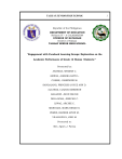 TALISAY SENIOR HIGH SCHOOL Republic of the Philippines DEPARTMENT OF EDUCATION Rehiyon IV – A CALABARZON DIVISION OF BATANGAS District of Talisay TALISAY SENIOR HIGH SCHOOL "Engagement with Facebook Learning Groups: Exploration on the Academic Performance of Grade 12 Humss Students.” Presented by: ARANDIA, WHIENN C. ASINAS, JAMAIKA KATE L. COSME, JOSEPHINE M. SANGALANG, PRINCESS JOYCE ANN D. ALCARAZ, CLARCK EMERSON BALAZON. JHON DHAVE DELA ROSA, JERICHO C. LIWAG, ARCHIE C. MENDOZA, MARK RENZO S. PEREZ, RAINIER ARVIN M. VILLANUEVA, JIRO M. Presented to: Mrs. Agnes J. Parma 1 TALISAY SENIOR HIGH SCHOOL 2 CHAPTER I The Problem and Its Background This chapter introduces the problem at hand and the background that led to researcher to conduct a study. It likewise presents the framework to which the study anchored and the researcher paradigm. Moreover it presents the statement of the problem, hypotheses, scope and limitation and definition of terms. Introduction In recent years, Facebook Learning Groups have gained immense popularity among Grade 12 students as a platform for collaborative learning and academic support (Zhang et al., 2020). These online communities provide students with the opportunity to engage in discussions, share resources, and seek assistance from their peers, thereby enhancing their overall academic experience. However, despite the widespread use of Facebook Learning Groups, there is a lack of understanding regarding the impact of student engagement with these groups on their academic performance. The level of engagement with Facebook Learning Groups is a crucial variable to consider when examining its relationship with academic performance. Engagement can be measured by various factors, including the frequency and quality of interactions within the group, active participation in TALISAY SENIOR HIGH SCHOOL 3 discussions, utilization of shared resources, and the extent to which students seek and provide academic assistance (Kabilan et al., 2020). By exploring the relationship between engagement with Facebook Learning Groups and academic performance, educators and policymakers can gain valuable insights into the effectiveness of these online communities as a supplementary educational tool. Academic performance, another key variable in this study, encompasses various aspects such as grades, test scores, and overall academic achievement (Sari et al., 2019). It serves as a tangible measure of a student's understanding and mastery of the subject matter. By examining how engagement with Facebook Learning Groups influences academic performance, researchers can determine whether these online communities have a significant impact on students' learning outcomes. Background of the Study The use of social media platforms, such as Facebook, has become increasingly prevalent in educational settings. Facebook Learning Groups, in particular, have emerged as a popular platform for students to engage in collaborative learning and academic discussions. This study aims to explore the impact of engagement with Facebook Learning Groups on the academic performance of Grade 12 students. TALISAY SENIOR HIGH SCHOOL 4 Numerous studies have examined the effects of social media on student learning outcomes. For example, a study by Junco and colleagues (2011) found that students who actively engaged with social media platforms for educational purposes demonstrated higher levels of academic engagement and improved grades. Similarly, Kirschner and Karpinski (2010) found a positive correlation between Facebook use and academic performance among college students. While there is a growing body of research on the use of social media in education, limited studies have specifically focused on the impact of engagement with FLGs on academic performance, particularly among Grade 12 students. Grade 12 is a critical stage in a student's academic journey as it marks the culmination of their secondary education and preparation for higher education or the workforce. Understanding the relationship between engagement with FLGs and academic performance is crucial for educators, policymakers, and students themselves. It can provide insights into how these virtual communities can enhance learning outcomes and contribute to students' overall academic achievements. Furthermore, identifying the factors that contribute to effective engagement within FLGs can inform the development of strategies to optimize the use of these platforms in supporting student learning. By conducting this research study, researchers aim to fill this gap in the literature and contribute to the ongoing conversation on the integration of social media platforms in education. The findings from this study will not only TALISAY SENIOR HIGH SCHOOL 5 provide valuable insights for educators and policymakers but also empower students to make informed decisions about their engagement with FLGs. Overall, this research seeks to explore the impact of engagement with Facebook Learning Groups on the academic performance of Grade 12 students. By examining the relationship between FLG engagement and academic performance indicators, this study aims to provide evidence-based recommendations for optimizing the use of social media platforms in education. Through a comprehensive analysis of the benefits and challenges associated with FLG engagement, this research will contribute to the existing knowledge base and inform future practices in educational settings. Statement of the Problem This study intends to find out the Relationship between Facebook Learning Groups and Academic Performance. The following questions were sought to be answered: 1. What is the perception of the students on their engagement in Facebook Learning Groups? 2. Is there a significant relationship between engagement with Facebook Learning Groups and the Academic Performance of Grade 12 Students? TALISAY SENIOR HIGH SCHOOL 6 3. What strategies can be proposed to enhance the engagement, duration, an