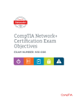 CompTIA Network+ Certification Exam Objectives EXAM NUMBER: N10-008 About the Exam Candidates are encouraged to use this document to help prepare for the CompTIA Network+ (N10-008) certification exam. The CompTIA Network+ certification exam will verify the successful candidate has the knowledge and skills required to: • Establish network connectivity by deploying wired and wireless devices • Understand and maintain network documentation • Understand the purpose of network services • Understand basic datacenter, cloud, and virtual networking concepts • Monitor network activity, identifying performance and availability issues • Implement network hardening techniques • Manage, configure, and troubleshoot network infrastructure This is equivalent to 9–12 months of hands-on experience working in a junior network administrator/ network support technician job role. These content examples are meant to clarify the test objectives and should not be construed as a comprehensive listing of all the content of this examination. EXAM ACCREDITATION The CompTIA Network+ (N10-008) exam is accredited by ANSI to show compliance with the ISO 17024 standard and, as such, undergoes regular reviews and updates to the exam objectives. EXAM DEVELOPMENT CompTIA exams result from subject matter expert workshops and industry-wide survey results regarding the skills and knowledge required of an entry-level IT professional. CompTIA AUTHORIZED MATERIALS USE POLICY CompTIA Certifications, LLC is not affiliated with and does not authorize, endorse, or condone utilizing any content provided by unauthorized third-party training sites (aka “brain dumps”). Individuals who utilize such materials in preparation for any CompTIA examination will have their certifications revoked and be suspended from future testing in accordance with the CompTIA Candidate Agreement. In an effort to more clearly communicate CompTIA’s exam policies on use of unauthorized study materials, CompTIA directs all certification candidates to the CompTIA Certification Exam Policies. Please review all CompTIA policies before beginning the study process for any CompTIA exam. Candidates will be required to abide by the CompTIA Candidate Agreement. If a candidate has a question as to whether study materials are considered unauthorized (aka “brain dumps”), they should contact CompTIA at examsecurity@comptia.org to confirm. PLEASE NOTE The lists of examples provided in bulleted format are not exhaustive lists. Other examples of technologies, processes, or tasks pertaining to each objective may also be included on the exam although not listed or covered in this objectives document. CompTIA is constantly reviewing the content of our exams and updating test questions to be sure our exams are current, and the security of the questions is protected. When necessary, we will publish updated exams based on existing exam objectives. Please know that all related exam preparation materials will still be valid. CompTIA Network+ N10-008 Certification Exam: Exam Objectives 6.0 Copyright © 2020 CompTIA, Inc. All rights reserved. TEST DETAILS Required exam N10-008 Number of questions Maximum of 90 Types of questions Multiple-choice and performance-based Length of test 90 minutes Recommended experience • CompTIA A+ certified, or equivalent • Minimum of 9–12 months of hands-on experience working in a junior network administrator/ network support technician job role Passing score 720 (on a scale of 100-900) EXAM OBJECTIVES (DOMAINS) The table below lists the domains measured by this examination and the extent to which they are represented. DOMAIN PERCENTAGE OF EXAMINATION 1.0 Networking Fundamentals 2.0 Network Implementations 3.0 Network Operations 4.0 Network Security 5.0 Network Troubleshooting Total CompTIA Network+ N10-008 Certification Exam: Exam Objectives 6.0 Copyright © 2020 CompTIA, Inc. All rights reserved. 24% 19% 16% 19% 22% 100% 1.0 Networking Fundamentals 1.1 Compare and contrast the Open Systems Interconnection (OSI) model layers and encapsulation concepts. • OSI model - Layer 1 – Physical - Layer 2 – Data link - Layer 3 – Network - Layer 4 – Transport - Layer 5 – Session - Layer 6 – Presentation - Layer 7 – Application 1.2 • Data encapsulation and decapsulation within the OSI model context - Ethernet header - Internet Protocol (IP) header - Transmission Control Protocol (TCP)/ User Datagram Protocol (UDP) headers - TCP flags - Payload - Maximum transmission unit (MTU) Explain the characteristics of network topologies and network types. • Mesh • Star/hub-and-spoke • Bus • Ring • Hybrid • Network types and characteristics - Peer-to-peer - Client-server - Local area network (LAN) - Metropolitan area network (MAN) - Wide area network (WAN) - Wireless local area network (WLAN) - Personal area network (PAN) - Campus area network (CAN) - Storage area network (SAN) - Software-defined wide area network (SDWAN) - Multiprotocol label switching (MPLS) - Multipoint generic routing encapsulation (mGRE) • Service-related entry point - Demarcation point - Smartjack • Virtual network concepts - vSwitch - Virtual network interface card (vNIC) CompTIA Network+ N10-008 Certification Exam: Exam Objectives 6.0 Copyright © 2020 CompTIA, Inc. All rights reserved. - Network function virtualization (NFV) - Hypervisor • Provider links - Satellite - Digital subscriber line (DSL) - Cable - Leased line - Metro-optical 1.0 Networking Fundamentals 1.3 Summarize the types of cables and connectors and explain which is the appropriate type for a solution. • Copper - Twisted pair - Cat 5 - Cat 5e - Cat 6 - Cat 6a - Cat 7 - Cat 8 - Coaxial/RG-6 - Twinaxial - Termination standards - TIA/EIA-568A - TIA/EIA-568B • Fiber - Single-mode - Multimode • Connector types - Local connector (LC), straight tip (ST), subscriber connector (SC), mechanical transfer (MT), registered jack (RJ) - Angled physical contact (APC) - Ultra-physical 