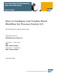 SAP SOLUTIONS FOR GOVERNANCE, RISK, AND COMPLIANCE How-To Guide How to Configure and Trouble Shoot Workflow for Process Control 2.5 SAP GRC Regional Implementation Group Applicable Releases: SAP GRC Process Control 2.5 IT Practice / Topic Area: GRC GRC / Process Control IT Scenario / Capability: GRC / Process Control September 2008 © Copyright 2008 SAP AG. All rights reserved. No part of this publication may be reproduced or transmitted in any form or for any purpose without the express permission of SAP AG. The information contained herein may be changed without prior notice. Some software products marketed by SAP AG and its distributors contain proprietary software components of other software vendors. Microsoft, Windows, Outlook, and PowerPoint are registered trademarks of Microsoft Corporation. IBM, DB2, DB2 Universal Database, OS/2, Parallel Sysplex, MVS/ESA, AIX, S/390, AS/400, OS/390, OS/400, iSeries, pSeries, xSeries, zSeries, z/OS, AFP, Intelligent Miner, WebSphere, Netfinity, Tivoli, Informix, i5/OS, POWER, POWER5, OpenPower and PowerPC are trademarks or registered trademarks of IBM Corporation. Adobe, the Adobe logo, Acrobat, PostScript, and Reader are either trademarks or registered trademarks of Adobe Systems Incorporated in the United States and/or other countries. Oracle is a registered trademark of Oracle Corporation. UNIX, X/Open, OSF/1, and Motif are registered trademarks of the Open Group. Citrix, ICA, Program Neighborhood, MetaFrame, WinFrame, VideoFrame, and MultiWin are trademarks or registered trademarks of Citrix Systems, Inc. HTML, XML, XHTML and W3C are trademarks or registered trademarks of W3C®, World Wide Web Consortium, Massachusetts Institute of Technology. Java is a registered trademark of Sun Microsystems, Inc. JavaScript is a registered trademark of Sun Microsystems, Inc., used under license for technology invented and implemented by Netscape. MaxDB is a trademark of MySQL AB, Sweden. SAP, R/3, mySAP, mySAP.com, xApps, xApp, SAP NetWeaver, and other SAP products and services mentioned herein as well as their respective logos are trademarks or registered trademarks of SAP AG in Germany and in several other countries all over the world. All other product and service names mentioned are the trademarks of their respective companies. Data contained in this document serves informational purposes only. National product specifications may vary. These materials are subject to change without notice. These materials are provided by SAP AG and its affiliated companies ("SAP Group") for informational purposes only, without representation or warranty of any kind, and SAP Group shall not be liable for errors or omissions with respect to the materials. The only warranties for SAP Group products and services are those that are set forth in the express warranty statements accompanying such products and services, if any. Nothing herein should be construed as constituting an additional warranty. These materials are provided “as is” without a warranty of any kind, either express or implied, including but not limited to, the implied warranties of merchantability, fitness for a particular purpose, or non-infringement. SAP shall not be liable for damages of any kind including without limitation direct, special, indirect, or consequential damages that may result from the use of these materials. SAP does not warrant the accuracy or completeness of the information, text, graphics, links or other items contained within these materials. SAP has no control over the information that you may access through the use of hot links contained in these materials and does not endorse your use of third party web pages nor provide any warranty whatsoever relating to third party web pages. SAP NetWeaver “How-to” Guides are intended to simplify the product implementation. While specific product features and procedures typically are explained in a practical business context, it is not implied that those features and procedures are the only approach in solving a specific business problem using SAP NetWeaver. Should you wish to receive additional information, clarification or support, please refer to SAP Consulting. Any software coding and/or code lines / strings (“Code”) included in this documentation are only examples and are not intended to be used in a productive system environment. The Code is only intended better explain and visualize the syntax and phrasing rules of certain coding. SAP does not warrant the correctness and completeness of the Code given herein, and SAP shall not be liable for errors or damages caused by the usage of the Code, except if such damages were caused by SAP intentionally or grossly negligent. Disclaimer Some components of this product are based on Java™. Any code change in these components may cause unpredictable and severe malfunctions and is therefore expressively prohibited, as is any decompilation of these components. Any Java™ Source Code delivered with this product is only to be used by SAP’s Support Services and may not be modified or altered in any way. Document History Document Version Description 1.10 Update to use the template 1.00 Document created Typographic Conventions Icons Type Style Description Icon Example Text Words or characters quoted from the screen. These include field names, screen titles, pushbuttons labels, menu names, menu paths, and menu options. Cross-references to other documentation Example text Emphasized words or phrases in body text, graphic titles, and table titles Example text File and directory names and their paths, messages, names of variables and parameters, source text, and names of installation, upgrade and database tools. Example text User entry texts. These are words or characters that you enter in the system exactly as they appear in the documentation. <Example text> Variable user entry. Angle brackets indicate that you replace these words and characters with appropriate entries to make entries in the sy
