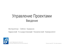Управление Проектами Введение Инструктор: Сейтек Курманов Кырызский Государственный Технический Университет Факультет Информационных Технологий Кыргызский Государственный Технический Университет Авторское право 2017 – Все права защищены Введение в Управление Проектами • История управления проектами • Управление проектами и ИТ • Проекты в ИТ • Отчет The Standish Group • Успешность проекта • Стандарты руководства проектами • Определение проекта • Портфели, программы, проекты Факультет Информационных Технологий Кыргызский Государственный Технический Университет • PMO • Бизнес ценности • Влияние организации • Свод знаний • Жизненный цикл организации • Области знаний Авторское право 2017 – Все права защищены Начало… • Будем опираться на книгу Марчевки: «Information Technology Project Management» Факультет Информационных Технологий Кыргызский Государственный Технический Университет Авторское право 2017 – Все права защищены История УП • Управление проектами существует с древних времен. • Трансконтинентальная железная дорога была первой настоящей компанией по управлению проектами в наше время. • Промышленная революция конца 19го века и связанные с ней трудовые изменения привели к необходимости совершенствования тактики управления проектами. • Генри Гант использовал диаграммы для мониторинга и управления проектами. • Фредерик Тейлор создал публикацию о лучшей стратегии управления проектами для повышения эффективности квалифицированных рабочих. Многие успешные организации по-прежнему используют эту тактику сегодня. • Компьютеры дали руководителям проектов новые способы расчета рисков и управления проектами. • Интернет породил массовую коммуникацию и эффективность во всех проектах и более подробно на устройствах сегодняшнего дня. Факультет Информационных Технологий Кыргызский Государственный Технический Университет Авторское право 2017 – Все права защищены Управление проектами и ИТ • 1940ые – изобретение первого компьютера • 1960ые – начало эры цифровой обработки данных • Закуп больших централизованных мейнфреймов крупными организациями • Проекты в ИТ фокусировались на автоматизации ключевых организационных функций: бухгалтерия, инвентаризация, автоматизация расписаний • Увеличение эффективности и уменьшение стоимости ручной работы • Структурированный подход, используемый для управления этими проектами, поскольку требования были стабильными и хорошо понятными • Обычно менеджер обработки данных был подотчетен бухгалтерии или финансовому управлению Факультет Информационных Технологий Кыргызский Государственный Технический Университет Авторское право 2017 – Все права защищены Управление проектами и ИТ • 1980ые – начало микро эры • Резкий скачок количества компьютеров бросила вызов централизованному управлению • Привело к разработанным пользователем, децентрализованным, независимым системам, которые реплицировали данные по всей организации и затрудняли жинь ИТ-поддержке • Роль ИТ-директора создается для обеспечения стратегического использования ИТ • Он становится подотчетным генеральному директору, чтобы показать важность позиции ИТ-директора и важную роль, которую должны играть ИТ-специалисты • ПК должны сосуществовать и интегрироваться с мейнфреймами • ИТ-проекты теперь пересекались с функц