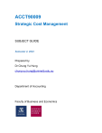 ACCT90009 Strategic Cost Management SUBJECT GUIDE Semester 2, 2023 Prepared by Dr Chung Yu Hung chung-yu.hung@unimelb.edu.au Department of Accounting Faculty of Business and Economics Subject Outline Introduction Welcome to ACCT90009 Strategic Cost Management! In this subject, we will examine topics at the interface of cost accounting and managerial decision making. You will be introduced to the concepts and processes that underpin the development of cost accounting systems and gain familiarisation with a range of techniques for the analysis and evaluation of cost information captured by these systems. In this subject, you will also investigate the role of cost accounting information in managerial decisions that relate to the efficient and effective management of organisational resources and the creation of customer and shareholder value. This guide details a range of information you will require to support your learning in this subject. The administration and assessment requirements of each subject within the business school can differ in important ways. Please ensure that you read the guide carefully and are familiar with the requirements of this subject, as well as the broader business school and University policies with which you must comply. We look forward to working with you and hope that you enjoy this subject! Subject Overview and Aims The overall aim of this subject is to highlight the relevance and limitations of cost accounting information in managerial decisions. You will also learn how cost information can be collected and aggregated to improve its decision-relevance. You will master the analysis skill and critical thinking through various case studies. See also the Subject Overview in the University Handbook (https://handbook.unimelb.edu.au/view/2023/ACCT90009). Learning Outcomes Learning Outcomes and Generic Skills To view the subject objectives and the generic skills you will develop through successful completion of this subject, please see the University Handbook: https://handbook.unimelb.edu.au/view/2023/ACCT90009 Awareness Issues At a broader level, studying this subject will increase your awareness of issues such as: • • • Measurement challenges faced by management accountants and managers in organizations; The importance of resource management in organizations and its links to business processes; The challenge of managing resources in a constrained and changing environment. 2 Eligibility and Requirements To view the eligibility and requirements, including prerequisites, corequisites, recommended background knowledge and core participation requirements for this subject, please see the University Handbook: https://handbook.unimelb.edu.au/2023/subjects/ACCT90009/eligibility-and-requirements Academic Staff Contact Details Please see the subject LMS site for full contact details of the teaching staff in this subject. Subject Coordinator Contact Details Name: Dr. Chung-Yu Hung Email: chung-yu.hung@unimelb.edu.au Consultation Hours: Please refer to LMS for the information Seminar Leader Contact Details Name: Dr. Sarah Young Spencer Email: s.yangspencer@unimelb.edu.au Name: Dr. Michael Taouk Email: michael.taouk@unimelb.edu.au Consultation Hours: Please refer to LMS for the information Email Protocol Please note that we are only able to respond to student emails coming from a University email address. Please do not use personal email addresses such as Yahoo, Hotmail or even business email addresses. Emails from non-University email addresses may be filtered by the University’s spam filter, which means that we may not receive your email. All correspondence relating to this subject will only be sent to your University email address. Note that you must first activate your University email address before you can send or receive emails at that address. You can activate your email account at this link: http://accounts.unimelb.edu.au/. While academic staff endeavor to address queries received via email, it is more appropriate to resolve substantive questions during lectures and tutorials and/or during normal consultation hours. With this in mind, we encourage students to attend all lectures and 3 tutorials and to familiarize themselves with the consultation hours offered by the lecturer(s) in this subject. Lectures and Workshops Lecture and Workshop Times This subject is composed of two teaching activities: lectures and workshops. For lectures, lectures in Week 1 and Week 12 will take 3 hours (180 minutes) and the lectures over week 2-11 will take 1.5 hours (90 minutes. The lecture capture will be available on the assigned time. For workshops, they take place from Week 3 to Week 12. Students are only expected to attend one workshop each week. Note that all teaching activities will take place on campus. You can find the detailed information on LMS about the timetable and the venue. Venue (on campus) Activity Lecture (long) Day of week Wednesday Lecture (short) Law Building David P. Derham Theatre (GM15) Workshop (Wed) The Spot 4014 Wednesday Workshop (Thu1) The Spot 4014 Thursday Workshop (Thu2) The Spot 4014 Thursday Wednesday Start time (Duration) 17:15 (180 mins) 18:15 (90 mins) 15:45 (90 mins) 11:00 (90 mins) 12:30 (90 mins) Dates Week 1 & Week 12 (26/7 & 18/10) Week 2 - Week 11 (2/8 - 11/10) Week 3 - Week 12 (9/8 - 18/10) Week 3 - Week 12 (10/8 - 19/10) Week 3 - Week 12 (10/8 - 19/10) Lecture and Workshop Participation Requirements Students will learn new materials in lectures and then apply the knowledge to problem solving in workshops. Most of workshop discussions will be based on cases. You should note that the ‘workshop’ section is not a traditional lecture where lecturers speak and students listen. Rather, the classroom environment is highly participative and will be interspersed with interactive sessions designed to reinforce the lecture objectives. Interactive sessions throughout the lecture/workshop will vary in nature and format (e.g., discussion boards). 