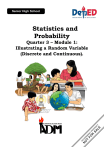 Statistics and Probability Quarter 3 – Module 1: Illustrating a Random Variable (Discrete and Continuous). Statistics and Probability – Grade 11 Alternative Delivery Mode Quarter 3 – Module 1: Illustrating a Random Variable (Discrete and Continuous) First Edition, 2020 Republic Act 8293, section 176 states that: No copyright shall subsist in any work of the Government of the Philippines. However, prior approval of the government agency or office wherein the work is created shall be necessary for exploitation of such work for profit. Such agency or office may, among other things, impose as a condition the payment of royalties. Borrowed materials (i.e., songs, stories, poems, pictures, photos, brand names, trademarks, etc.) included in this module are owned by their respective copyright holders. Every eff ort has been exerted to locate and seek permission to use these materials from their respective copyright owners. The publisher and authors do not represent nor claim ownership over them. Published by the Department of Education Secretary: Leonor Magtolis Briones Undersecretary: Diosdado M. San Antonio Development Team of the Module Writer: Roland V. Magsino Editors: Jerome A. Chavez, Celestina M. Alba and Nestor Sandoval Reviewers: Irlo L. Dumo, Nenita N. De Leon and Ma. Theresa B. Yanto Illustrator: Dhojie N. Yanto Layout Artist: Edna E. Eclavea Management Team: Wilfredo E. Cabral Job S. Zape Jr. Eugenio S. Adrao Elaine T. Balaogan Fe M. Ong-ongowan Catherine P. Talavera Gerlie M. Ilagan Buddy Chester M. Repia Herbert D. Perez Lorena S. Walangsumbat Jee-Ann O. Borines Celestina M. Alba Asuncion C. Ilao Printed in the Philippines by ________________________ Department of Education – Region IV-A CALABARZON Office Address: Telefax: E-mail Address: Gate 2 Karangalan Village, Barangay San Isidro Cainta, Rizal 1800 02-8682-5773/8684-4914/8647-7487 region4a@deped.gov.ph Statistics and Probability Quarter 3 – Module 1: Illustrating a Random Variable (Discrete and Continuous) Introductory Message For the facilitator: Welcome to the Statistics and Probability for Senior High School Alternative Delivery Mode (ADM) Module on Illustrating a Random Variable (Discrete and Continuous)! This module was collaboratively designed, developed and reviewed by educators both from public and private institutions to assist you, the teacher or facilitator in helping the learners meet the standards set by the K to 12 Curriculum while overcoming their personal, social, and economic constraints in schooling. This learning resource hopes to engage the learners into guided and independent learning activities at their own pace and time. Furthermore, this also aims to help learners acquire the needed 21st century skills while taking into consideration their needs and circumstances. In addition to the material in the main text, you will also see this box in the body of the module: Notes to the Teacher This contains helpful tips or strategies that will help you in guiding the learners. As a facilitator you are expected to orient the learners on how to use this module. You also need to keep track of the learners' progress while allowing them to manage their own learning. Furthermore, you are expected to encourage and assist the learners as they do the tasks included in the module. ii For the learner: Welcome to the Statistics and Probability for Senior High School Alternative Delivery Mode (ADM) Module on Illustrating a Random Variable (Discrete and Continuous)! The hand is one of the most symbolized part of the human body. It is often used to depict skill, action, and purpose. Through our hands, we may learn, create, and accomplish. Hence, the hand in this learning resource signifies that you as a learner is capable and empowered to successfully achieve the relevant competencies and skills at your own pace and time. Your academic success lies in your own hands! This module was designed to provide you with fun and meaningful opportunities for guided and independent learning at your own pace and time. You will be enabled to process the contents of the learning resource while being an active learner. This module has the following parts and corresponding icons: What I Need to Know This will give you an idea of the skills or competencies you are expected to learn in the module. What I Know This part includes an activity that aims to check what you already know about the lesson to take. If you get all the answers correct (100%), you may decide to skip this module. What’s In This is a brief drill or review to help you link the current lesson with the previous one. What’s New In this portion, the new lesson will be introduced to you in various ways such as a story, a song, a poem, a problem opener, an activity or a situation. What is It This section provides a brief discussion of the lesson. This aims to help you discover and understand new concepts and skills. What’s More This comprises activities for independent practice to solidify your understanding and skills of the topic. You may check the answers to the exercises using the Answer Key at the end of the module. iii What I Have Learned This includes questions or blank sentence/paragraph to be filled in to process what you learned from the lesson. What I Can Do This section provides an activity which will help you transfer your new knowledge or skill into real life situations or concerns. Assessment This is a task which aims to evaluate your level of mastery in achieving the learning competency. Additional Activities In this portion, another activity will be given to you to enrich your knowledge or skill of the lesson learned. This also tends retention of learned concepts. Answer Key This contains answers to all activities in the module. At the end of this module you will also find: References This is a list of all sources used in developing this module. The following are some reminders in using this module: 1. Use the module with care. Do not put unnecessary m