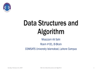 Data Structures and Algorithm Moazzam Ali Sahi Room # B1, B-Block COMSATS University Islamabad, Lahore Campus Sunday, February 25, 2024 CSC 211 Data Structures and Algorithm 1 Agenda • Introduction to the course • What is CDF? • C-Programing Language (Recap) Sunday, February 25, 2024 CSC 211 Data Structures and Algorithm 2 Course Description File (CDF) 1 Course Title Data Structure and Algorithm 2 Course Code CSC 211 3 Credit Hours 4 (3,1) 4 Prerequisites CSC 103 5 Semester 4th 6 Resource Person/Lab Engineer Moazzam Ali Sahi 7 Contact Hours (Theory) 3 hours per week 8 Contact Hours (Lab) 3 hours per week 9 Office Hours 2:00 PM to 4:00 PM (weekdays) Sunday, February 25, 2024 CSC 211 Data Structures and Algorithm 3 Course Description • This course includes the basic foundations in of data structures and algorithms. This course covers concepts of various data structures like stack, queue, list, tree and graph. Additionally, the course includes idea of sorting and searching Sunday, February 25, 2024 CSC 211 Data Structures and Algorithm 4 Course Objective • To introduce data abstraction and data representation in memory • To describe, design and use of elementary data structures such as • • • • • Stack Queue linked list Tree Graph • To discuss decomposition of complex programming problems into manageable sub- problems • To introduce algorithms and their complexity Sunday, February 25, 2024 CSC 211 Data Structures and Algorithm 5 Course Learning Outcomes (CLO) Theory • CLO-1: Employ linear data structures to solve computing problems. (Applying) • CLO-2: Use non-linear data structures to solve computing problems. (Applying) • CLO-3: Analyze the time complexity of various algorithms. (Analyzing) Lab • CLO-4: Implement data structures and algorithms. (Applying) • CLO-5: Develop a project using appropriate data structures in a team environment. (Creating) Sunday, February 25, 2024 CSC 211 Data Structures and Algorithm 6 Syllabus / Theory Course Outline • 1. Data Structure: • • • • • Overview, Importance Classification Operations and Abstract Data Types. • 2. Static List; Dynamic List: • Single Linked Lists • Circular Linked List • Doubly Linked List • 3. Stack: • Concept • Applications. • 4. Queue: • Concept • Types • Applications. Sunday, February 25, 2024 • 5. Tree: • 7. Sorting algorithms: • Concept & Terminology • Traversal Algorithms; • • Binary Search Trees & its Various Operations; AVL Tree and Min & Max Heaps. • 6. Graph: • • • • Basic Concepts & Terminology; Representation, Types; Graph Traversal Techniques: • • • • • • • Breadth First Search, Depth First Search; Minimum Spanning Trees: Kruskal Algorithm, Prims Algorithm; Shortest Path Problem: Dijkstra’s Algorithm. CSC 211 Data Structures and Algorithm • Bubble, • Selection, • Insertion & Merge Sort, • Searching Algorithms: • • • • Linear & Binary Search; Hashing: Hash Functions, Hash Tables Strategies for Avoiding & Resolving Collisions. • 8. Complexity Analysis: • Growth Rate of Function; • Asymptotic Notation; • Time Complexity of Searching and Sorting Algorithms 7 Abstract Data Types and Data Structures • “A data structure is a way of organizing, storing, and performing operations on data.” • “An abstract data type (ADT) is a data type described by predefined user operations, such as "insert data at rear," without indicating how each operation is implemented. • An ADT can be implemented using different underlying data structures.” Sunday, February 25, 2024 CSC 211 Data Structures and Algorithm 8 Key Goals For This Course • Selecting appropriate ADT’s – Based on the logical requirements of the problem: How will we need to interact with our data • Selecting appropriate Data Structures – How can we organize our data so that we can interact with it efficiently in both time and space. • Algorithm Analysis – How can we determine the performance characteristics of our code before we write it Sunday, February 25, 2024 CSC 211 Data Structures and Algorithm 9 Basic Definitions [Abstract Data Type] • When an application requires a special kind of data which is not available as built-in data type then it is the responsibility of the programmer to implement his own kind of data. • The programmer has to give more effort regarding how to store value for that data • Amount of memory require to store for a variable • The programmer has to decide all these things and accordingly implement it. • Programmer own data type is termed as abstract data type aka user-defined data type Sunday, February 25, 2024 CSC 211 Data Structures and Algorithm 10 Basic Definitions [Abstract Data Type] For example • To process dates of the form dd/mm/yy (No built-in data types in C) • Define an ADT, say Date with various operations like • Add few days to a date to obtain another date • Find days between two dates • Find day for a given date, etc. • Besides this, programmer has to decide how to store the data • What amount of memory will be needed to represent a value of Date, etc. • An ADT can be built using built-in data types and other ADTs already built by the programmer. Like using struct/class in C/C++ Sunday, February 25, 2024 CSC 211 Data Structures and Algorithm 11 Overview of Data Structures • Many data structures are known depending on area of application • Few data structures are there which are frequently used almost in all application areas and with the help of which almost all complex data structures can be constructed -> fundamental data structures or classic data structures Sunday, February 25, 2024 CSC 211 Data Structures and Algorithm 12 Classification of all classic data structures Sunday, February 25, 2024 CSC 211 Data Structures and Algorithm 13 Classification of all classic data structures Sunday, February 25, 2024 CSC 211 Data Structures and Algorithm 14 Classifi