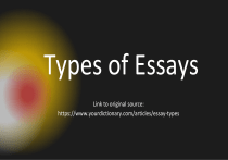 Types of Essays Link to original source: https://www.yourdictionary.com/articles/essay-types 1. Narrative Essays Narrative essays tell stories from your life or the lives of others. They’re told just like fictional short stories, with all the story elements characters, a setting, a compelling plot, a climax, and a resolution. Narrative essays use the third-person perspective (it happened to someone else) or the first-person perspective (it happened to the writer). Narrative essays should be entertaining and engaging to read, so choose a narrative writing topic that speaks to you. Narrative Essay Example Structure When writing a narrative essay, a possible structure could include: • Introduction - Hint at what you or the character learned • Body - Tell the story from beginning to end, finishing in an exciting or compelling climax in the last body paragraph • Conclusion - Reflect on what you or the character learned from the experience in the story 2. Argumentative Essays Argumentative essays (also called argument essays) investigate topics fairly and thoroughly to present the writer’s argument to the reader. The writer makes a claim and argues why evidence and logic support that claim in a well-structured essay. Strong argumentative essays use rhetorical devices to strengthen their arguments, and they address the opposing argument (known as a counterclaim) as well. When choosing an argumentative essay topic, select an issue that you care about (or a topic you’d like to learn more about), and begin researching your position with reliable sources. Argumentative Essay Structure Example You can structure an argumentative essay like this: • Introduction - Introduce the topic and your claim in a thesis statement • Body - Support your position with evidence (and bring up counterclaims) • Conclusion - Restate your claim and summarize how you proved it 3. Expository Essays Expository essays use research and critical thinking to explain more about a topic. Newspaper articles are a type of expository essay — they provide information to the reader in a concise, factual way. Writing expository essays requires a straightforward outline, evidence-based conclusions, and a strong thesis statement. Though expository writing reveals information, it’s not the same as technical writing. Expository essays “expose” the truth about a selected topic, not just the information about it. Expository Essay Structure Example Most expository essays follow a structure similar to this: • Introduction - Introduce the topic and hint at a deeper truth • Body - Explain more about the topic with evidence; expose the truth and/or implications of the topic in a final body paragraph • Conclusion - Summarize the information and its larger meaning 4. Descriptive Essays Like narrative essays, descriptive essays use narration to set a scene for the reader. But unlike narrative essays, descriptive essays don’t tell a story from beginning to end. If a painting could be an essay, it would be a descriptive essay — a written experience that you can almost see. Descriptive essays use lots of sensory details to describe the way something looks, sounds, smells, tastes, or feels. Well-written descriptive essays also use similes, metaphors, hyperboles, or other types of figurative language to pull their readers into the experience. Descriptive Essay Structure Example When writing a descriptive essay, you can follow this outline: • Introduction - Introduce the topic you’re going to describe with an engaging, sensory hook sentence • Body - Describe the topic with rich sensory detail and figurative language • Conclusion - Summarize your essay and conclude with a memorable descriptive sentence 5. Persuasive Essays Persuasive essay writers try to convince their readers to agree with them. You’ll find examples of persuasive writing in both essays and speeches when a speaker, writer, or politician wants the audience on their side. When you write a persuasive essay, you use similar strategies as you would in an argumentative essay. But persuasive essays use personal anecdotes (stories about yourself or others) and emotional appeals rather than the logic and evidence you’ll find in an argumentative essay. They also include a call to action at the end that inspires their audience to act. Persuasive Essay Structure Example You can structure your persuasive essay in a similar way as your argumentative essay, with a few key differences. • Introduction - Use an emotional evocative hook to get the reader interested in your position right away • Body - Use personal anecdotes, dramatic language, and emotional appeals to get the reader on your side • Conclusion - Finish with a call to action for your reader — what should they do now? 6. Informative Essays Like expository essays, informative essays (also called informational essays) inform their readers about a topic. But the main purpose of an informative essay is to educate the audience rather than to expose them to the truth. Informative essays require lots of evidence and strong research. Be sure to choose an informative essay topic that interests you, since you’re going to learn a lot about it during the course of your writing. Informative Essay Structure Example Outline your informative essay structure in a straightforward, nononsense way. • Introduction - Introduce the topic with a strong hook (such as an interesting fact or statistic) • Body - Explain more about the topic with evidence • Conclusion - Restate your thesis and conclude with a general statement about the topic 7. Personal Narrative Essays Personal narrative essays (also called personal narratives) are a form of narrative writing in which the writer explores how an experience affected or shaped them. They focus on a single event or theme in one’s life, and unlike narrative essays, personal narratives are always true (and always autobiographical). College entrance essays are a t