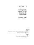 NFPA 13 Norma para la Instalación de Sistemas de Rociadores Edición 1996 National Fire Protection Association, 1 Batterymarch Park, PO Box 9101, Quincy, MA 02269-9101 Una Organización Internacional de Códigos y Normas Traducido y editado en español bajo licencia de la NFPA, por el Instituto Argentino de Normalización OBSERVACIÓN Todas las preguntas o comunicaciones relativas a este documento deben ser enviadas únicamente a las oficinas principales de la NFPA, dirigidas al Comité responsable de este documento. Para información sobre los procedimientos para solicitar a los Comités Técnicos que publiquen Interpretaciones Formales, proponiendo Enmiendas Interinas Tentativas, enmiendas a las consideraciones y recursos sobre asuntos relativos al contenido del documento, escriba a: Secretary, Standards Council, National Fire Protection Association, 1 Batterymarch Park, P.O. Box 9101, Quincy, MA 02269-9101. Un informe, oral o escrito, que no sea procesado de acuerdo con la sección 5 del Reglamento de Proyectos del Comité Regulador, no debe ser considerado como la posición oficial de la NFPA o cualquiera de sus Comités, tampoco debe considerarse, ni debe tenerse en cuenta como una Interpretación Formal. Los usuarios de este documento deben consultar las leyes y regulaciones federales, estatales y locales aplicables. La NFPA no intenta, por publicación de este documento, urgir una acción que no esté de acuerdo con las leyes aplicables y este documento puede no ser interpretado para lograrlo. Política adoptada por la Junta Directiva de la NFPA el 3 de Diciembre de 1982 La Junta Directiva reafirma que la Asociación Nacional de Protección contra Incendios reconoce que la toxicidad de los productos de combustión es un factor importante en la pérdida de vidas humanas causada por los incendios. La NFPA se ha ocupado de este tema en sus documentos del comité técnico durante muchos años. Existe la inquietud de que el creciente uso de materiales sintéticos puede producir más cantidad y nuevos productos de combustión tóxica, en las inmediaciones del fuego. Sin embargo, la Junta Directiva pidió a todos sus Comités Técnicos de la NFPA que revisen los documentos de los cuales sean responsables, para verificar que responden a esta inquietud general. Para ayudar a los comités a satisfacer esta petición, la dirección ha designado un comité asesor que proporcione una guía específica a los comités sobre cuestiones concernientes a estimar los riesgos de los productos de combustión. Estipulación de las Licencias - Este Documento es propiedad de la Asociación Nacional de Protección contra Incendios (NFPA). 1. Adopción por Referencia. - Las autoridades públicas y otras autoridades están obligadas a hacer referencia a este documento en las leyes, estatutos, disposiciones, decretos administrativos o instrumentos similares. Cualquier eliminación, adición y cambio deseado por la autoridad de adopción, deben ser anotados separadamente. A quienes utilizan este método se les solicita notificar a la NFPA (Atención: Secretaría, Consejo de Normas), por escrito, acerca de tal uso. El término “adopción por referencia” significa la mención de título e información de la publicación solamente. 2. Adopción por Transcripción -A. Las autoridades públicas con poderes legislativos o reguladores solamente, al notificar por escrito a la NFPA (Atención: Secretaría, Consejo de Normas), recibirán una licencia libre de derechos de autor para imprimir y reeditar este documento en su totalidad o en parte, con cambios o adiciones, en cuyo caso estarán anotadas separadamente en leyes, estatutos, disposiciones, decretos administrativos o instrumentos similares que tengan poder legal, siempre que: (1) la debida notificación de los derechos de la NFPA esté contenida en cada ley y en cada copia de ésta; y, (2) que el tiraje y publicación sea limitado al número de ejemplares suficientes para satisfacer el proceso legislativo o regulador de la jurisdicción. B. Una vez que el presente Código o Norma fue adoptado en la ley, a todas las impresiones de este documento realizadas por la autoridad pública con poder de legislar o cualquier persona que desee reproducir este documento o sus contenidos, adoptados por la jurisdicción en su totalidad o en parte, en cualquier forma, a la solicitud escrita a la NFPA (atención: Secretaría, Consejo de Normas), les será concedida una licencia sin exclusividad para la impresión, reimpresión y venta de este documento completo o una parte de él, los cambios y adiciones en cuyo caso se anotarán separadamente, siempre que la debida notificación de los derechos de la NFPA esté contenida en cada copia. Esta licencia debe ser otorgada solamente sobre un convenio para lograr regalías a la NFPA. Estas regalías se requieren con el fin de proveer fondos para la investigación y desarrollo necesarios para continuar el trabajo de la NFPA y sus voluntarios que continuamente actualizan y revisan las normas de la NFPA. Bajo ciertas circunstancias, las autoridades públicas con poderes legislativos y regulativos pueden recibir una regalía especial cuando el interés público se beneficie con esto. (Para mayores explicaciones, ver Póliza Concerniente la Adopción, Impresión y Publicación de los documentos de la NFPA que está disponible a solicitud en la NFPA.) Información sobre los Procedimientos de la NFPA Este material ha sido desarrollado con los procedimientos publicados por la Asociación Nacional de Protección contra Incendios, los cuales están diseñados para asegurar el nombramiento de Comités Técnicamente competentes que tengan una representación equilibrada. Mientras estos procedimientos aseguran el más alto grado de atención, ni la Asociación Nacional de Protección contra Incendios, ni sus miembros, ni tampoco quienes participan en sus actividades aceptan ningún riesgo que resulte del acatamiento o no acatamiento de las dis