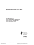Specification for Line Pipe API SPECIFICATION 5L FORTY-THIRD EDITION, MARCH 2004 EFFECTIVE DATE: OCTOBER 2004 ERRATA DECEMBER 2004 --`,,`,,,,`,,,`,,`,,,`,`,,`,,``-`-`,,`,,`,`,,`--- Copyright American Petroleum Institute Reproduced by IHS under license with API Document provided by IHS Licensee=Modec International/5928096100, 01/26/2005 19:04:50 MST Questions or comments about this message: please call the Document Policy Group at 303-397-2295. --`,,`,,,,`,,,`,,`,,,`,`,,`,,``-`-`,,`,,`,`,,`--- Copyright American Petroleum Institute Reproduced by IHS under license with API Document provided by IHS Licensee=Modec International/5928096100, 01/26/2005 19:04:50 MST Questions or comments about this message: please call the Document Policy Group at 303-397-2295. Upstream Segment API SPECIFICATION 5L FORTY-THIRD EDITION, MARCH 2004 EFFECTIVE DATE: OCTOBER 2004 ERRATA DECEMBER 2004 Copyright American Petroleum Institute Reproduced by IHS under license with API Document provided by IHS Licensee=Modec International/5928096100, 01/26/2005 19:04:50 MST Questions or comments about this message: please call the Document Policy Group at 303-397-2295. --`,,`,,,,`,,,`,,`,,,`,`,,`,,``-`-`,,`,,`,`,,`--- Specification for Line Pipe API publications necessarily address problems of a general nature. With respect to particular circumstances, local, state, and federal laws and regulations should be reviewed. API is not undertaking to meet the duties of employers, manufacturers, or suppliers to warn and properly train and equip their employees, and others exposed, concerning health and safety risks and precautions, nor undertaking their obligations under local, state, or federal laws. Information concerning safety and health risks and proper precautions with respect to particular materials and conditions should be obtained from the employer, the manufacturer or supplier of that material, or the material safety data sheet. Nothing contained in any API publication is to be construed as granting any right, by implication or otherwise, for the manufacture, sale, or use of any method, apparatus, or product covered by letters patent. Neither should anything contained in the publication be construed as insuring anyone against liability for infringement of letters patent. Generally, API standards are reviewed and revised, reafÞrmed, or withdrawn at least every Þve years. Sometimes a one-time extension of up to two years will be added to this review cycle. This publication will no longer be in effect Þve years after its publication date as an operative API standard or, where an extension has been granted, upon republication. Status of the publication can be ascertained from the API Standards department telephone (202) 682-8000. A catalog of API publications, programs and services is published annually and updated biannually by API, and available through Global Engineering Documents, 15 Inverness Way East, M/S C303B, Englewood, CO 80112-5776. This document was produced under API standardization procedures that ensure appropriate notiÞcation and participation in the developmental process and is designated as an API standard. Questions concerning the interpretation of the content of this standard or comments and questions concerning the procedures under which this standard was developed should be directed in writing to the Director of the Standards department, American Petroleum Institute, 1220 L Street, N.W., Washington, D.C. 20005. Requests for permission to reproduce or translate all or any part of the material published herein should be addressed to the Director, Business Services. API standards are published to facilitate the broad availability of proven, sound engineering and operating practices. These standards are not intended to obviate the need for applying sound engineering judgment regarding when and where these standards should be utilized. The formulation and publication of API standards is not intended in any way to inhibit anyone from using any other practices. Any manufacturer marking equipment or materials in conformance with the marking requirements of an API standard is solely responsible for complying with all the applicable requirements of that standard. API does not represent, warrant, or guarantee that such products do in fact conform to the applicable API standard. All rights reserved. No part of this work may be reproduced, stored in a retrieval system, or transmitted by any means, electronic, mechanical, photocopying, recording, or otherwise, without prior written permission from the publisher. Contact the Publisher, API Publishing Services, 1220 L Street, N.W., Washington, D.C. 20005. Copyright © 2004 American Petroleum Institute Copyright American Petroleum Institute Reproduced by IHS under license with API Document provided by IHS Licensee=Modec International/5928096100, 01/26/2005 19:04:50 MST Questions or comments about this message: please call the Document Policy Group at 303-397-2295. --`,,`,,,,`,,,`,,`,,,`,`,,`,,``-`-`,,`,,`,`,,`--- SPECIAL NOTES FOREWORD API publications may be used by anyone desiring to do so. Every effort has been made by the Institute to assure the accuracy and reliability of the data contained in them; however, the Institute makes no representation, warranty, or guarantee in connection with this publication and hereby expressly disclaims any liability or responsibility for loss or damage resulting from its use or for the violation of any federal, state, or municipal regulation with which this publication may conßict. Suggested revisions are invited and should be submitted to API, Standards department, 1220 L Street, NW, Washington, DC 20005. --`,,`,,,,`,,,`,,`,,,`,`,,`,,``-`-`,,`,,`,`,,`--- Copyright American Petroleum Institute Reproduced by IHS under license with API iii Document provided by IHS Licensee=Modec International/5928096100, 01/26/2005 19:04:50 MST Questions or comments about this message: please call the Document Policy Group at 303-397-2295. --`,,`
