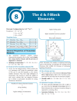 Electronic Configurations/(n–1) d1–10 ns1–2. Exceptions: 1. Cr = 4s1 3d5 2. Cu = 4s1 3d10 3. Pd = 5s04d10 Transition Series 1st 3d series 2nd 4d series 3rd 5d series Sc21 - Zn30 Y39 - Cd48 La57, Hf72 - Hg80 4th Ac89, Unq104- Uub112 9 + 1 = 10 6d series 9 + 1 = 10 9 + 1 = 10 9 + 1 = 10 General Properties of Transition Element The transition elements exhibit typical characteristic properties due to their small atomic sizes, large nuclear charges and the presence of unpaired d - electrons. Enthalpy of atomization: V > Ti > Ni > Co > Fe > Cr > Cu > Sc > Mn > Zn (1) Trends in M.P of transition elements(TE) In any row the melting points of these metals rise to a maximum at d5 except for anomalous values of Mn and Tc and fall regularly as the atomic number increases. They have high enthalpies of atomization. The maxima at about the middle of each series indicate that one unpaired electron per d orbital is particularly favorable for strong interatomic interaction. Number of valence electrons increase ↓ strong bonding ↓ higher enthalpy of atomisation ↓ higher boiling point ↓ higher standard electronic potential ↓ More noble character 4 W Nb Hf 2 Re Ta 3 M.P./103K 8 The d & f-Block Elements Zr V Os Ru Mo Cr Tc Ti Rh Fe Mn 1 Atomic number Ir Pt Co Pd Ni Cu Au Ag Trends in melting points of transition elements After chromium, the number of unpaired electrons goes on decreasing. Accordingly, the melting points decrease after middle (Cr) because of increasing pairing of electrons. (2) Size of atoms and ions The covalent radii of the elements decreases from left to right across a row in the transition series, until near the end when the size increases slightly. Metallic radii: Sc > Ti > Mn = Zn > V > Cr > Cu> Co = Ni (3) Ionization Energies of 3d Series IP values generally increase from left to right in any series but the increase is less than that of s block elements due to increase in nuclear charge is opposed by screening effect. Ionization Enthalpy: Zn > Fe > Co > Cu > Ni > Mn > Ti > Cr > V >Sc (4) Oxidation State Transition elements exhibit variable oxidation st ate due to small energy difference of ns and (n – 1)d electrons. Sc(+3) and Zn(+2) exhibit only one oxidation state Common oxidation state is +2 3d series highest oxidation state is +7 (Mn) In d-block series highest oxidation state is +8 (Os, Ru) In carbonyl compound oxidation state of metals is zero due to synergic effects. The common examples are [Ni(CO)4], [Fe(CO)5] in which nickel and iron are in zero oxidation state. Their higher oxidation states are more stable in fluoride and oxides. SCAN (Special Cases Asked in NEET) stable than fluorides due to capability of oxygen to form multiple bonds. In terms of number of unpaired electrons (n), the magnetic moment is given by the formula. Most Wanted Higher oxidation states in oxides are normally more Some more stable oxidation states of d-block elements Cu + 2 Mn + 2 Pt + 4 Ag + 1 Cu + 3 Sc + 3 Au + 3 Ni + 2 Common oxidation states Ti (+ 4) V (+5) Fe(+2, +3) Co (+2, +3) Cr (+3, +5) Mn (+2, +4, +7) Ni (+2) Pt(+2, +4) In p-block lower oxidation states of heavier elements are more stable while in d-block heavier element, higher oxidation state are more stable. (5) Electrode potentials and chemical reactivity Trends in the M2+/M Standard electro potential S.R.P of M+2/M values increases from left to right as IP values increases. (except Zn) Cu cannot displace H2 from acids because it has highest S.R.P value which is +0.34 V. Mn, Ni and Zn have more negative S.R.P values than expected because. Reason: Mn & Zn have d5 & d10 stable electronic configuration Ni has highest hydration energy. (DHHyd Ni+2 = –2121 kJ/mole) Trends in the M3+/M2+ Standard electro potential E 0 M +3 /M +2 in the 3d series are observed for some metals are Co+3/Co+2 > Mn+3/Mn+2> Fe+3/Fe+2 > Ti+3/Ti+2 > Sc+3/Sc+2>V+3/V+2 2 (6) Magnetic Property of Transition Metals Paramagnetic substances contain unpaired electron spins or unpaired electrons. Ex : K3[Fe(CN)6], Sc2+, Cr3+ etc Diamagnetic substances exhibit decrease in weight in the presence of magnetic field. Ex.: Ti+4, V+5 , Sc3+, Zn, Hg, Cd etc Diamagnetic substances contain electron pairs with opposite spins. Ferromagnetic substances are considered as a special case of paramagnetic substances. Paramagnetism of substances (molecules, atoms or ions)is due to the spins of the unpaired electrons and also due to angular orbital momentum. = µs n ( n + 2 ) BM Q. The magnetic moment of Ni2+ ion (atomic number of Ni = 28) in BM unit is: a. 1.73 b. 4.81 c. 5.96 d. 2.84 Ans. (d) Ni28 = [Ar] 3d8 , 4s2 Ni2+ = [Ar] 3d8 ∴n=2 µ= n(n + 2) = 2(2 + 2) = 2(4) = 8 = 2.84 BM Q. The correct order of magnetic moments (spin only values in B.M.) among is a. [Fe(CN)6]4– > [MnCl4]2– > [CoCl4]2– b. [MnCl4]2– > [Fe(CN)6]4– > [CoCl4]2– c. [MnCl4]2– > [CoCl4]2– > [Fe(CN)6]4– d. [Fe(CN)6]4– > [CoCl4]2– > [MnCl4]2– Ans. (c) (7) Colours of Transition Metal Ions Colour in transition metal ions is associated with d-d transition of unpaired electron from t2g to eg set of energies. (8) Formation of complexes The great tendency of transition metal ions to form complexes is due to : small size of the atoms and ions, high nuclear charge and availability of vacant d-orbitals of suitable energy to accept lone pairs of electrons donated by ligands. (9) Catalytic properties of transition metals (11) Alloy Formation Solid mixture of metals in a definate ratio (15% difference in metallic radius) They are hard and having high melting point. eg., Brass (Cu + Zn) Bronze (Cu + Sn) etc. Hg when mix with other metals form semisolid amalgam except Fe, Co, Ni, Li. Potassium Dichromate (K2Cr2O7) Properties (a) Physical: K2Cr2O7 is preferred over Na2Cr2O7 as a primary standard in volumetric estimation because Na2Cr2O7 is hygroscopic in nature but K2Cr2O7 is not. (b) Chemical: 3 ∆ → 2K 2 CrO 4 + Cr2 O3 + O 2 ●● 2K 2 Cr2 O7 2 K2Cr2O7 + 2KOH → 2K2CrO4 + H2O 2– Cr2O2– 7 + 2
