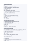 Lx disc herniation D= A = Age, activity, smoking, obesity, sedentary E = 25-45y/o P = LBP + leg pain below knee, sudden onset twist/lift. E = O/P - antalgic posture Lx ROM - lat flex aggro Neuro - SMR Ortho - Lx Screen, SLR, Slump, Kemps M = NSAIDs, opiods, diazepam, gabapentin, heat, cusion, Lumbar Facet Syndrome D= E = all P = Localised LBP w/ hip/buttock pain above knee E = O/P = hypertonicity, flat lordosis, posture assymetry Lx ROM - pain ext and rot Neuro - NAD ortho - Kemps, SLR M = Manip/mobs, correct posture, NSAIDs Sacroiliac Dysfunction D = Altered positional relationship of sacrum on an ilium E = Pts w/ Pregnant, young, degen P = Sit to stand pain SIJ, radiate post leg, pain is sharp or dull. E = O/P - PSIS tender/not level Lx ROM - pain Neuro - NAD Ortho - 5 M = Manip/mobs, NSAIDs, cold/heat, STW Piriformis Syndrome D/A = hypertrophy of the piriformis muscle, which can compress the sciatic nerve. E = Female, trauma, skier, tennis, truck driver P = Buttock/post leg pain, pain worse on squat, hip addct/int rot mvmt E = O/P - palpate tender/ short leg Hip ROM - pain flex, add, int rot neuro - NAD ortho - SLR pain M = STW, cold/heat, stretch, mobs/manip, NSAIDs Lx compression Fx D= A = severe trauma, osteoporosis E = Female 51-65 P = Asymptomatic, axial pain, no radiate, ache/stab/severe pain E = O/P - Kyphosis, tender Lx ROM - reduced Neuro - NAD Ortho - Tuning fork/percuss M = Refer imaging Cauda Equina D = Compress cauda equina A = disc herniation, tumour, trauma, infection, AS (late), spondylolisthesis, congenital cause, spinal manipulation, degeneration. E = Adults P = sudden onset, LBP w/ leg pain, S/M abnormal legs, Bladder/Bowel dysfunction, Saddle ana/parastesia, Sexual dysfunction I = A&E M = Decompress surgery, Inflam - antinflam Infect - antibiotics Cancer - Chemo/radiotherapy > lifestyle change, physio HIPPIRONEL • History (record card) • Inspection (lumbs, bumps, bruises, rash) • Palpation (warmth, sweling, tenderness, fluid) • Percussion • Instrumentation (ausculation) • Range of motion (Pain, end feel, muscle, joint) • Orthopedic tests • Neurological tests (SMR) • X-ray (cancer, trauma, scoliosis etc) • Lab tests (FBC, LFT, RA factor, U&E) Ankylosing Spondylitis (AS) D = inflam axial skeleton start SIJ. A = seronegative, idiopathic, hla b27 E = young male 20-30 P = Gardual onset pain/stiff SIJ + LB, a.m. stiff, Chronic, aggro rest/allev excercise, fatigue, weight loss, fever E = Blood test - hla b27, NY criteria, X-ray M = NSAIDs > refer RA D = autoimmune arthitis A = idiopathic E = Old female P = Symmetry hands, pain worse after rest, a.m. stiff >1hr, fatigue, weight loss E = O/P - swell, tender, warm ROM - reduce Refer blood test M = Increase activity, tens/wax bath, DMARDs, NSAIDs, surgery - Upper Cx instability Reactive Arthritis [Reiter's syndrome] D = Spondyloarthitis, oligoarthritis KNEE, 3-12 mths, Triad A = STI/GI infect E = young adult HLA-B27 gene P = weeks after infect, fever, fatigue, lower extremity arthritis, LBP Triad - urethritis, conjuctivitis, arthritis I = O/P - triad Blood test - ESR/CRP high, hla-b27, rf negative M = Rest, strengthening, physio, cold/heat, antibiotic, NSAIDs, corticosteroids, DMARDs spondylolisthesis D = forward slipping of one vertebra over another A = DIDTP E = Male, I - children, D - old, RF - scoliosis/spina bifida P = Asympto, LBP aggro rot/ext + buttock pain E = O/P - waddle gait, step deformity, tender, hypertonic Lx ROM -pain ext/rot Neuro - Dermo matching slip Ortho - Stork stand test M = grade G3-4 = Surgery AAA D = Bulge in aorta 3cm+ A = RF - Atherosclerosis, smoking, HTN E = Male, 80+ - M=F P = Asympto until rupture, pre rupture - back,flank, abdo pain, nausea/vom? Post - abdo/back pain E = O/P - pulsitile mass System - aorta palp 3cm+, ausculation - Bruit M = Searing - acute rupture – REFER Kidney stones D = Urine supersaturated with salt/mineral. Crystal formation A = RF - anatomical anomaly, FHx, HTN, gout, dehydration E = Male middle age P = Asympto/ rigor, fever, nausea/vom, haematuria/dysuria I = O - pt agony P - kidney ballottement, costovertebral angle tender/pain Vital - fever, low BP System - Abdo exam bowel sound reduced M = Refer GP > NSAIDs, antiemetics, rehydrate Cx facet syndrome D = Cx facet irri - pain head, neck, shoulder A = Cx injury, whiplash, sprain/strain, OA/RA E = all P = Dull/ache, localised, (acute - sharp) E = O/P - Head carrige, hypertonic Cx ROM - pain ext/rot N - WNL Ortho - Comp, distr M = Rest, cold/heat, manip/mob, STW, NSAIDs Whiplash D = Soft tissue damage to ligaments, muscles, discs or other connective tissue. A = Trauma, RTC, posture P = Cx pain, radiate shoulder, headache E = O/P - local tender, hypertonic Cx ROM - reduce N - NAD Ortho - Distract M = NSAIDs, PRICE, manip/mob, STW Quebec grading Cx spondylosis w/ radiculopathy D = OA in Cx, LOSS A = Injury, poor posture, Disc hernia, osteophyte E = Female >50 P = Localised or Electric/burning/Numb/Tingling pain neck > arm, weak arm E = O/P - Bakody sign, hypertonis/tender Cx ROM - Reduce ext/rot/latflex, Pain latflex N - SM depend Orth - Cx screen, valsalva, arm squeeze, shoulder depress M = NSAIDs, manip/mobs, STW, Sx should improve 6 weeks, if not refer, confirmation is MRI Torticollis D = Rot/latflex head due to Cx muscle spasm (SCM), Aquire/Congen A = Myo damage, Cx injury, CNS infection E = Female 30+ P = Head tilt, ROM not equal, neck pain? E = O/P - Asymmetry, hypertonic ROM - reduce unilateral N - NAD Ortho - Cx screen M = STW, stretch, manip/mobs, NSAIDs, excercise, heat/cold, pillow, NO Cx Collar TMJ syndrome D = Pain/tender due to dysfunction TMJ/muscle A = muscle spasm, trauma, teeth grinding, dentures, psychosocial stress E = Female 20-40 P = jaw/face pain, pain chewing, lock/catch, headache, I = O/P - jaw asymmetry, hypertrophy, tender ROM - reduced, click M = Manip/mob, STW, heat, soft diet, teeth grinding stop, NSAIDs, refer dentist Impingement RC D = mechanical impinge RC tendon beneat