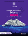 We are working with Cambridge Assessment International Education towards endorsement of this title. PL E Cambridge Lower Secondary Science LEARNER’S BOOK 8 SA M Mary Jones, Diane Fellowes-Freeman & Michael Smyth Second edition Digital access Original material © Cambridge University Press 2021. This material is not final and is subject to further changes prior to publication. ISBN_9781108742825 We are working with Cambridge Assessment International Education towards endorsement of this title. PL E Cambridge Lower Secondary Science LEARNER’S BOOK 8 SA M Mary Jones, Diane Fellowes-Freeman & Michael Smyth Original material © Cambridge University Press 2021. This material is not final and is subject to further changes prior to publication. ISBN_9781108742825 We are working with Cambridge Assessment International Education towards endorsement of this title. Contents Contents Science Strand Thinking and Working Scientifically strand Science in Context 1 Respiration 1.1 The human respiratory system 1.2 Gas exchange 1.3 Breathing 1.4 Respiration Biology: Structure and Function Biology: Life processes Models and representations Carrying out scientific enquiry Scientific enquiry: purpose and planning Scientific enquiry: analysis, evaluation and conclusions Discuss how scientific knowledge is developed through collective understanding and scrutiny over time Describe how science is applied across industries, and in research Evaluate issues which involve and / or require scientific understanding 2 Properties of materials 2.1 Dissolving 2.2 Solutions and solubility 2.3 Planning a solubility investigation 2.4 Paper chromatography Chemistry: Materials and their Structure Chemistry: Properties of materials Scientific enquiry: purpose and planning Carrying out scientific enquiry Scientific enquiry: analysis, evaluation and conclusions Describe how science is applied across industries, and in research 3 Forces and energy 3.1 Forces and motion 3.2 Speed 3.3 Describing movement 3.4 Turning forces 3.5 Pressure between solids 3.6 Pressure in liquids and gases 3.7 Particles on the move Physics: Forces and Energy Models and representations Carrying out scientific enquiry Scientific enquiry: analysis, evaluation and conclusions Scientific enquiry: purpose and planning Evaluate issues which involve and / or require scientific understanding 4 Ecosystems 4.1 The Sonoran desert 4.2 Different ecosystems 4.3 Intruders in an ecosystem 4.4 Bioaccumulation Biology: Ecosystems Carrying out scientific enquiry Discuss how scientific knowledge is developed through collective understanding and scrutiny over time Evaluate issues which involve and/or require scientific understanding Discuss how the uses of science can have a global environmental impact SA M PL E Page Unit Original material © Cambridge University Press 2021. This material is not final and is subject to further changes prior to publication. iv ISBN_9781108742825 We are working with Cambridge Assessment International Education towards endorsement of this title. Contents Science Strand Thinking and Working Scientifically strand Science in Context 5 Materials and their structure 5.1 The structure of the atom 5.2 Purity 5.3 Weather and Climate 5.4 Climate and Ice ages 5.5 Atmosphere and climate Chemistry: Materials and their structure Chemistry: Changes to materials Earth and Space: Planet Earth Earth and Space: Cycles on Earth Carrying out scientific enquiry Scientific enquiry: purpose and planning Models and representations Scientific enquiry: analysis, evaluation and conclusions Describe how people develop and use scientific understanding as individuals and through collaboration, e.g. through peer-review. Discuss how the uses of science can have a global environmental impact 6 Light 6.1 Reflection 6.2 Refraction 6.3 Making rainbows 6.4 Galaxies 6.5 Rocks in Space Physics: Light and Sound Earth and Space: Earth in Space Scientific enquiry: purpose and planning Carrying out scientific enquiry Scientific enquiry: analysis, evaluation and conclusions Models and representations Evaluate issues which involve and / or require scientific understanding 7 Diet and growth 7.1 Nutrients 7.2 A balanced diet 7.3 Growth, development and health 7.4 Moving the body Biology: Structure and Function Biology: Life processes Scientific enquiry: purpose and planning Carrying out scientific enquiry Evaluate issues which involve and/or require scientific understanding 8 Chemical reactions 8.1 Exothermic reactions 8.2 Endothermic reactions 8.3 Metals and their reactions with oxygen 8.4 Reactions of metals with water 8.5 Reactions of metals with dilute acids Chemistry: Changes to materials Scientific enquiry: purpose and planning Carrying out scientific enquiry Scientific enquiry: analysis, evaluation and conclusions Describe how science is applied across societies and industries, and in research. Evaluate issues which involve and/or require scientific understanding. 9 Magnetism 9.1 Magnetic fields 9.2 The Earth as giant magnet 9.3 Electromagnets 9.4 Investigating electromagnets Physics: Electricity and magnetism Earth and Space: Planet Earth Scientific enquiry: purpose and planning Scientific enquiry: analysis, evaluation and conclusions Models and representations Carrying out scientific enquiry Discuss how scientific knowledge is developed through collective understanding and scrutiny over time. Evaluate issues which involve and/or require scientific understanding. SA M PL E Page Unit Original material © Cambridge University Press 2021. This material is not final and is subject to further changes prior v to publication. ISBN_9781108742825 We are working with Cambridge Assessment International Education towards endorsement of this title. 1 Respiration In this topic you will: PL E 1.1 The human respiratory system • learn the names of the different parts of the human respiratory system • observe carefully, and record your observations, as the structure of lungs is demonstrated Gett