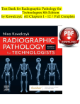 Test Bank for Radiographic Pathology for Technologists 8th Edition by Kowalczyk All Chapters 1 - 12 / Full Complete TABLE OF CONTENTS 1. Introduction to Pathology 2. The Skeletal System 3. The Respiratory System 4. The Cardiovascular System 5. The Abdomen and Gastrointestinal System 6. The Hepatobiliary System 7. The Urinary System 8. The Central Nervous System 9. The Hemopoietic System 10. The Reproductive System 11. The Endocrine System 12. Traumatic Disease Chapter 1: Introduction to Pathology Test Bank MULTIPLE CHOICE 1. The sequence of events producing cellular changes following injury best defines: a. manifestations. b. pathogenesis. c. sign. d. symptom. ANSWER: B REF: p. 2 2. An abnormal disturbance of the function and structure of the human body following injury refers to: a. disease. b. etiology. c. manifestations. d. pathogenesis. ANSWER: A REF: p. 2 3. The study of the cause of disease is termed: a. disease. b. etiology. c. pathogenesis. d. prognosis. ANSWER: B REF: p. 2 4. Common agents that cause disease include: 1. bacteria. 2. chemicals. 3. heat. a. 1 and 2 only b. 1 and 3 only c. 2 and 3 only d. 1, 2, and 3 ANSWER: D REF: p. 2 5. A syndrome is best defined as: a. a genetic abnormality of a single protein. b. an adverse response to medical treatment. c. the patient’s perception of the disease. d. signs and symptoms that characterize a specific abnormal disturbance. ANSWER: D REF: p. 2 6. An adverse response to medical treatment itself is termed: a. autoimmune. b. iatrogenic. c. idiopathic. d. nosocomial. ANSWER: B REF: p. 3 7. Prognosis refers to: a. diseases usually having a quick onset. b. the name of the particular disease. c. the predicted course and outcome of the disease. d. the structure of cells or tissue. ANSWER: C REF: p. 3 8. Diseases that generally require a decrease in the exposure technique are considered: a. destructive. b. lytic. c. subtractive. d. all of the above. ANSWER: D REF: p. 3 9. The investigation of disease occurring in large groups best defines: a. epidemiology. b. incidence. c. prevalence. d. all of the above. ANSWER: A REF: p. 3 10. Data regarding the number of deaths caused by a particular disease averaged over a population are collected and reported by the: a. American College of Radiology. b. Centers for Disease Control. c. Food and Drug Administration. d. National Center for Health Statistics. ANSWER: D REF: p. 2 11. Which of the following are leading causes of death in the United States for adults aged 45 years and greater? 1. Heart disease 2. Malignant neoplasm 3. Polycystic kidney disease a. 1 and 2 only b. 1 and 3 only c. 2 and 3 only d. 1, 2, and 3 ANSWER: A REF: p. 4 12. In 2010, health spending accounted for approximately domestic product. % of the U.S. gross a. b. c. d. 12 17 21 33 ANSWER: B REF: p. 7 13. Each cell in the human body, except the reproductive cells, contains autosomal chromosomes and chromosomes. a. 11; 1 b. 11; 2 c. 22; 1 d. 22; 2 ANSWER: D pairs of sex REF: p. 8 14. The types of gene maps that grew out of the identification of DNA sequences include maps. 1. genetic 2. SNP 3. physical a. 1 and 2 only b. 1 and 3 only c. 2 and 3 only d. 1, 2, and 3 ANSWER: B REF: p. 8 15. The identification of common DNA pattern sequences and common patterns of genetic variations of single DNA bases resulted in: the Genome Project. genetic linkage maps. haplotype mapping. physical mapping. a. b. c. d. ANSWER: C REF: p. 8 16. Diseases that are present at birth from genetic or environmental factors are classified as: a. congenital. b. degenerative. c. genetic. d. metabolic. ANSWER: A REF: p. 10 17. A genetic disorder caused by an abnormality on one of the 22 nonsex chromosomes is considered: a. autosomal. b. dominant. c. recessive. d. sex linked. ANSWER: A REF: p. 11 18. A protein coat surrounding a genome of either RNA or DNA without an organized cellular structure best describes which type of microorganism? a. Bacteria b. Fungi c. Virus d. All of the above ANSWER: C REF: p. 11 19. The ease with which a pathogenic organism can overcome the body’s defenses best describes: a. etiology. b. infection. c. pathogenesis. d. virulence. ANSWER: D REF: p. 12 20. Diseases caused by the disturbance of normal physiologic function are classified as: a. degenerative. b. metabolic. c. neoplastic. d. traumatic. ANSWER: B REF: p. 13 21. The lymph node into which the primary neoplasm drains during metastasis is termed the a. b. c. d. node. primary sentinel metastatic neoplastic ANSWER: B REF: p. 14 22. The spread of cancerous cells into surrounding tissue by virtue of the close proximity best describes: a. lymphatic spread. b. hematogenous spread. c. invasion. d. oncogenesis. ANSWER: C REF: p. 16 23. Cancer originating in epithelial tissue is termed: a. carcinoma. b. leukemia. c. lymphoma. d. sarcoma. ANSWER: A REF: p. 16 24. In classification of a tumor using the TNM system, the T refers to the: a. size of the primary tumor. b. lymph node involvement. c. distant metastasis. d. histologic grading of the primary tumor. ANSWER: A REF: p. 16 25. Which of the following imaging modalities are used in the staging of neoplastic tumors? 1. CT 2. PET 3. MRI a. 1 and 2 only b. 1 and 3 only c. 2 and 3 only d. 1, 2, and 3 ANSWER: D REF: p. 16 26. In the treatment of neoplastic disease, interferons and interleukins are associated with: a. chemotherapy. b. radiation therapy. c. hormone therapy. d. immunotherapy. ANSWER: D REF: p. 16 MATCHING Altered Cell Biology Directions: Match the type of altered cell biology with the correct description. a. A generalized decrease in cell size b. A generalized increase in cell size c. An increase in the number of cells in tissue as a result of excessive proliferation d. Conversion of one cell type into another cell type e. Abnormal changes of mature cells 1. 2. 3. 4. 5. Hypertrophy Atrophy Metaplasia Hyperplasia Dysplasia 1. 2. 3. 4. 5. ANSWER: B ANSWER: A ANSWER: D ANSWER: C ANSWER: E TRUE/FALSE REF: REF: REF: REF: REF: p. 9 p.