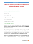 HTTPS://T.ME/IELTSW 100 IELTS Speaking Part 2 Topics in 2016, 2017 & Band 8.0+ Sample Answers Describe a time you needed to use imagination You should say: what the situation was; why you needed to use imagination; what the difficulties were; and explain how you felt about it. BAND 9.0 SAMPLE ANSWER: I would like to talk about the time I had to get out of my comfort zone to join an Innovation Challenge Contest which made me think out of the box and work flat out to become the runner-up. This annual contest is open to all undergraduates and post-graduates around the world. Each year this contest draws the attention of more than 30 000 people so it was really competitive and challenging for me. Therefore, when I was awarded the runner-up prize, I was deliriously happy and extraordinarily excited. The goal of the Challenge was to recognize individuals and organizations that were working on internet-based solutions to promote education and economic empowerment in countries throughout the world. Therefore, it really required IELTSMATERIAL.COM 1 HTTPS://T.ME/IELTSW creativity and imagination from each team joining the contest. I had to buckle down and brainstorm ideas for the challenge until I came up with the best one to be accepted for 4 consequent rounds. At the end of the day, my team and I had really gone extra miles to become the runners-up and it was really an unforgettable experience to me. After all, I can take pride in myself for all the thing I achieved with my imagination and creativity. Vocabulary: Get/Step out of the comfort zone: Do things that you wouldn’t normally do Example: If you want something you never had, I should step out of your comfort zone and work flat out to fulfil your dream. Think out of the box: Think differently, unconventionally or from a new perspective Work flat out: work very hard Runner-up: A team/player/competitor finishing in second place Deliriously happy [collocation] very happy Extraordinarily excited [collocation] very excited Empowerment: the giving of an ability, enablement or permission Example: The government believes strongly in the empowerment of women. Buckle down: to begin to work seriously at something. Example: If you don't buckle down to your job, you'll be fired. IELTSMATERIAL.COM 2 HTTPS://T.ME/IELTSW Brainstorm: a good idea; an idea that enters one’s head suddenly. Example: I had a sudden brainstorm and got out of bed to write it down. Go the extra miles: to do more than one is required to do to reach a goal Example: My teacher goes the extra mile to help us. Take pride in: to feel pleased about someone or what they have done Example: They take pride in their son's many accomplishments. He takes pride in the fact that he's never asked his parents for any money. At the end of the day: in the end Example: We interviewed many people or the job, but at the end of the day, we don’t think any of them could handle it. Describe a game or sport that you enjoy playing. You should say: - what kind of sport that is; - who you play it with; - where you play it; and explain why you think doing this is healthy. Band 9.0 Sample Answer I’m not a great swimmer in any sense but swimming is like my religion. It is truly refreshing and literally, washes away every disturbing thought I have IELTSMATERIAL.COM 3 HTTPS://T.ME/IELTSW whenever I dive into cold water. No matter how tight my schedule may get, I usually pay at least one visit to a local swimming pool to work myself up and get rejuvenated. Sometimes, I have a partner or two, who have been my best friends since high school. We live in the same neighborhood so it’s not too stressful when we have to set a schedule for our swimming session. We carpool more often than not and it takes us roughly 15 minutes to get to the local recreation center where it provides the locals with a variety of facilities for training purpose such as gym class, stadium, swimming pool, tennis court and so on, which is extremely convenient for those who practice more than one activity. The only thing better then swimming itself is swimming with your besties, which is one of hundreds of things I love about my weekly ritual. Hardly do we have time to meet each other during week days as we’re all up to our neck at work and totally stressed out. Therefore, having such a healthy way to catch up with my friends and recharge battery after an exhausting week never sounds better. Just like any other sports, swimming helps maintain your health, keep you fit as well as build your endurance. However, unlike others, it’s a very relaxing and peaceful form of exercise, you don’t even sweat for hours – a supreme advantage. Therefore, if you’re looking for a kind of sport that brings you comfort and relaxation, swimming should be your first choice. Vocabulary & Useful expression refreshing (a): making you feel less tired or hot literally (adv): in a literal manner or sense; exactly disturbing (a): making you feel anxious and upset or shocked work up: make yourself or another person excited or upset IELTSMATERIAL.COM 4 HTTPS://T.ME/IELTSW rejuvenate (v): make somebody/something look or feel younger, more lively or more modern more often than not: usually recreation center: a building that is open to the public where meetings are held, sports are played, and there are activities available for young and old people ritual (n): something that is done regularly and always in the same way be up to neck: to be very busy endurance (n): the ability to continue doing something painful or difficult for a long period of time without complaining Describe an old friend you enjoy talking with. You should say: - who this person is - how you knew him/her - what you usually talk about and explain why you want to talk to this person. Band 9.0 Sample Answer I have always been lucky enough to be surrounded by a large circle of friends who are incredibly supportive, compassionate and open-minded. And everybody knows how precious it is to have such