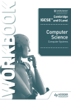 /130/HO01894/work/indd m bridge A YEARS ss es al E Ca 25 ducation king for ove or r on W 318496_FM_IGCSE_OLCSSW_001-004.indd Page 1 02/04/21 3:10 PM sw-103 i sm WITH rnat e n t In t e Cambridge IGCSE™ and O Level Computer Science Computer Systems David Watson Helen Williams 318496 IGCSE and O Level Computer Science WB CV.indd 1 22/03/2021 13:32 318496_FM_IGCSE_OLCSSW_001-004.indd Page 2 31/03/21 1:57 PM sw-103 Every effort has been made to trace all copyright holders, but if any have been inadvertently overlooked, the Publishers will be pleased to make the necessary arrangements at the first opportunity. Although every effort has been made to ensure that website addresses are correct at time of going to press, Hodder Education cannot be held responsible for the content of any website mentioned in this book. It is sometimes possible to find a relocated web page by typing in the address of the home page for a website in the URL window of your browser. Hachette UK’s policy is to use papers that are natural, renewable and recyclable products and made from wood grown in well-managed forests and other controlled sources. The logging and manufacturing processes are expected to conform to the environmental regulations of the country of origin. Orders: please contact Hachette UK Distribution, Hely Hutchinson Centre, Milton Road, Didcot, Oxfordshire, OX11 7HH. Telephone: +44 (0)1235 827827. Email education@hachette.co.uk Lines are open from 9 a.m. to 5 p.m., Monday to Friday. You can also order through our website: www.hoddereducation.com ISBN: 978 1 3983 1849 6 © David Watson and Helen Williams 2021 First published in 2021 by Hodder Education An Hachette UK Company Carmelite House 50 Victoria Embankment London EC4Y 0DZ www.hoddereducation.com Impression number Year 10 9 8 7 6 5 4 3 2 1 2025 2024 2023 2022 2021 All rights reserved. Apart from any use permitted under UK copyright law, no part of this publication may be reproduced or transmitted in any form or by any means, electronic or mechanical, including photocopying and recording, or held within any information storage and retrieval system, without permission in writing from the publisher or under licence from the Copyright Licensing Agency Limited. Further details of such licences (for reprographic reproduction) may be obtained from the Copyright Licensing Agency Limited, www.cla.co.uk Cover © phonlamaiphoto - stock.adobe.com Typeset in India by Aptara Inc. Printed in the UK A catalogue record for this title is available from the British Library. /130/HO01894/work/indd 318496_FM_IGCSE_OLCSSW_001-004.indd Page 3 31/03/21 1:57 PM sw-103 /130/HO01894/work/indd Contents Introduction 1 Data representation 2 Data transmission 3 Hardware 4 Software 5 The internet and cyber security 6 Automated and emerging technologies Cambridge IGCSE and O Level Computer Science Computer Systems Workbook 4 5 26 41 60 71 84 Photocopying prohibited 3 318496_FM_IGCSE_OLCSSW_001-004.indd Page 4 31/03/21 1:57 PM sw-103 /130/HO01894/work/indd Introduction Welcome to the Cambridge IGCSETM and O Level Computer Science Computer Systems Workbook. This and the companion Algorithms, Programming and Logic Workbook replace the previous Computer Science Workbook and are designed to complement the second edition of the Student’s Book and support the Cambridge IGCSE, IGCSE (9-1) and O Level Computer Science syllabuses (0478/0984/2210). The aim of this Workbook is to provide you with further opportunity to practise the skills and test the knowledge and understanding you have acquired through using the first six chapters of the Cambridge IGCSE and O Level Computer Science Second Edition Student’s Book. It is designed as a ‘write-in’ book to supplement your learning of different topics as you work through each chapter of the Student’s Book and can be used either for home study or in class. The Workbook is intended to be sufficiently flexible to suit whatever you feel is the best approach according to your needs. The chapters in this Workbook have the same names as those in the Student’s Book and reflect the theory topics in the Student’s Book. 4 Photocopying prohibited Cambridge IGCSE and O Level Computer Science Computer Systems Workbook 318496_01_IGCSE_OLCSSW_005-025.indd Page 5 31/03/21 2:01 PM sw-103 1 /130/HO01894/work/indd Data representation 1 Convert the denary number 165 into: a binary ............................................................................................................................................................................. ............................................................................................................................................................................. b hexadecimal ............................................................................................................................................................................. ............................................................................................................................................................................. ............................................................................................................................................................................. 2 a Convert the following binary number into denary: 01110110 ............................................................................................................................................................................. ............................................................................................................................................................................. b Convert the following hexadecimal number into denary: 5F ............................................................................................................................................................................. ..........................................................................