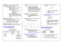 Population ­ entire collection of objects or individuals about which information is desired. ➔ easier to take a sample ◆ Sample ­ part of the population that is selected for analysis ◆ Watch out for: ● Limited sample size that might not be representative of population ◆ Simple Random Sampling­ Every possible sample of a certain size has the same chance of being selected Observational Study ­ there can always be lurking variables affecting results ➔ i.e, strong positive association between shoe size and intelligence for boys ➔ **should never show causation ➔ Mean ­ arithmetic average of data values ◆ **Highly susceptible to extreme values (outliers). Goes towards extreme values ◆ Mean could never be larger or smaller than max/min value but could be the max/min value ➔ Median ­ in an ordered array, the median is the middle number ◆ **Not affected by extreme values ➔ Quartiles ­ split the ranked data into 4 equal groups ◆ Box and Whisker Plot Experimental Study­ lurking variables can be controlled; can give good evidence for causation Descriptive Statistics Part I ➔ Summary Measures ➔ Variance ­ the average distance squared n ∑ (xi x)2 sx2 = i=1 n 1 ◆ sx2 gets rid of the negative values ◆ units are squared ➔ Standard Deviation ­ shows variation about the mean s= √ n ∑ (xi x)2 i=1 n 1 ◆ highly affected by outliers ◆ has same units as original data ◆ finance = horrible measure of risk (trampoline example) Descriptive Statistics Part II Linear Transformations ➔ Range = X maximum X minimum ◆ Disadvantages: Ignores the way in which data are distributed; sensitive to outliers ➔ Interquartile Range (IQR) = 3rd quartile ­ 1st quartile ◆ Not used that much ◆ Not affected by outliers ➔ Linear transformations change the center and spread of data ➔ V ar(a + bX) = b2 V ar(X) ➔ Average(a+bX) = a+b[Average(X)] ➔ Effects of Linear Transformations: ◆ meannew = a + b*mean ◆ mediannew = a + b*median ◆ stdev new = |b| *stdev ◆ IQRnew = |b| *IQR ➔ Z­score ­ new data set will have mean 0 and variance 1 z = XSX Empirical Rule ➔ Only for mound­shaped data Approx. 95% of data is in the interval: (x 2sx , x + 2sx ) = x + / 2sx ➔ only use if you just have mean and std. dev. Skewness ➔ measures the degree of asymmetry exhibited by data ◆ negative values= skewed left ◆ positive values= skewed right ◆ if |skewness| < 0.8 = don't need to transform data Measurements of Association ➔ Covariance ◆ Covariance > 0 = larger x, larger y ◆ Covariance < 0 = larger x, smaller y ◆ n sxy = n 1 1 ∑ (x x)(y y) i=1 Chebyshev's Rule ➔ Use for any set of data and for any number k, greater than 1 (1.2, 1.3, etc.) 1 ➔ 1 2 k ➔ (Ex) for k=2 (2 standard deviations), 75% of data falls within 2 standard deviations Detecting Outliers ➔ Classic Outlier Detection ◆ doesn't always work ◆ |z | = || X S X || ≥ 2 ➔ The Boxplot Rule ◆ Value X is an outlier if: X<Q1­1.5(Q3­Q1) or X>Q3+1.5(Q3­Q1) ◆ Units = Units of x Units of y ◆ Covariance is only +, ­, or 0 (can be any number) ◆ Correlation doesn't imply causation ◆ The correlation of a variable with itself is one Combining Data Sets ➔ Mean (Z) = Z = aX + bY ➔ Var (Z) = sz2 = a2 V ar(X) + b2 V ar(Y ) + 2abCov(X, Y ) Portfolios ➔ Return on a portfolio: Rp = w A RA + w B RB ◆ weights add up to 1 ◆ return = mean ◆ risk = std. deviation ➔ Variance of return of portfolio ➔ Correlation ­ measures strength of a linear relationship between two variables covariancexy ◆ r xy = (std.dev. )(std. dev. ) x y ◆ correlation is between ­1 and 1 ◆ Sign: direction of relationship ◆ Absolute value: strength of relationship (­0.6 is stronger relationship than +0.4) sp2 = wA2 sA2 + wB2 sB2 + 2wA wB (sA,B ) ◆ Risk(variance) is reduced when stocks are negatively correlated. (when there's a negative covariance) Probability ➔ measure of uncertainty ➔ all outcomes have to be exhaustive (all options possible) and mutually exhaustive (no 2 outcomes can occur at the same time) Probability Rules 1. Probabilities range from 0 ≤ P rob(A) ≤ 1 2. The probabilities of all outcomes must add up to 1 3. The complement rule = A happens or A doesn't happen ➔ Another way to find joint probability: P (A and B) = P (A|B) P (B) P (A and B) = P (B|A) P (A) Decision Tree Analysis ➔ square = your choice ➔ circle = uncertain events P (A and B) Contingency/Joint Table ➔ To go from contingency to joint table, divide by total # of counts ➔ everything inside table adds up to 1 Conditional Probability ➔ P (A|B) ➔ P (A|B) = P (A and B) P (B) ➔ Given event B has happened, what is the probability event A will happen? ➔ Look out for: "given", "if" Independence ➔ Independent if: P (A|B) = P (A) or P (B|A) = P (B) ➔ If probabilities change, then A and B are dependent ➔ **hard to prove independence, need to check every value Multiplication Rules ➔ If A and B are INDEPENDENT: P (A and B) = P (A) P (B) E M V = X 1 (P 1 ) + X 2 (P 2 )... + X n (P n ) 2 x 2 Table P (A) = 1 P (A) P (A) + P (A) = 1 4. Addition Rule: P (A or B) = P (A) + P (B) ➔ Expected Value Solution = Discrete Random Variables ➔ P X (x) = P (X = x) Expectation ➔ μx = E(x) = ∑ xi P (X = xi ) Decision Analysis ➔ Maximax solution = optimistic approach. Always think the best is going to happen ➔ Maximin solution = pessimistic approach. ➔ Example: (2)(0.1) + (3)(0.5) = 1.7 Variance ➔ σ 2 = E (x2 ) μx2 ➔ Example: (2)2 (0.1) + (3)2 (0.5) (1.7)2 = 2.01 Rules for Expectation and Variance ➔ μs = E (s) = a + bμx ➔ Var(s)= b2 σ 2 Jointly Distributed Discrete Random Variables ➔ Independent if: P x,y (X = x and Y = y ) = P x (x) P y (y) ➔ Combining Random Variables ◆ If X and Y are independent: E (X + Y ) = E (X) + E (Y ) V ar(X + Y ) = V ar(X) + V ar(Y ) ◆ If X and Y are dependent: E (X + Y ) = E (X) + E (Y ) V ar(X + Y ) = V ar(X) + V ar(Y ) + 2Cov(X, Y ) 2.) All Successes