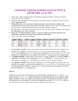 DATABASE DESIGN: NORMALIZATION NOTE & EXERCISES (Up to 3NF) Tables that contain redundant data can suffer from update anomalies, which can introduce inconsistencies into a database. The rules associated with the most commonly used normal forms, namely first (1NF), second (2NF), and third (3NF). The identification of various types of update anomalies such as insertion, deletion, and modification anomalies can be found when tables that break the rules of 1NF, 2NF, and 3NF and they are likely to contain redundant data and suffer from update anomalies. Normalization is a technique for producing a set of tables with desirable properties that support the requirements of a user or company. Major aim of relational database design is to group columns into tables to minimize data redundancy and reduce file storage space required by base tables. Take a look at the following example: StdSSN S1 S1 S2 S2 StdCity SEATTLE SEATTLE BOTHELL BOTHELL StdClass JUN JUN JUN JUN OfferNo O1 O2 O3 O2 OffTerm FALL FALL SPRING FALL OffYear 2006 2006 2007 2006 EnrGrade 3.5 3.3 3.1 3.4 CourseNo C1 C2 C3 C2 CrsDesc DB VB OO VB The insertion anomaly: Occurs when extra data beyond the desired data must be added to the database. For example, to insert a course (CourseNo), it is necessary to know a student (StdSSN) and offering (OfferNo) because the combination of StdSSN and OfferNo is the primary key. Remember that a row cannot exist with NULL values for part of its primary key. The update anomaly: Occurs when it is necessary to change multiple rows to modify ONLY a single fact. For example, if we change the StdClass of student S1 (JUN), two rows, row 1 and 2 must be changed. If S1 was enrolled in 10 classes, 10 rows must be changed. The deletion anomaly: Occurs whenever deleting a row inadvertently causes other data to be deleted. For example, if we delete the enrollment (EnrGrade) of S2 in O3 (third row), we lose the information about offering O3 and course C3 because these values are unique to the table (cell). Furthermore O3 is a primary key. RECAP Problems associated with data redundancy are illustrated by comparing the Staff and Branch tables with the StaffBranch table. Tables that have redundant data may have problems called update anomalies, which are classified as insertion, deletion, or modification anomalies. See the following Figure for an example of a table with redundant data called StaffBranch. There are two main types of insertion anomalies, which we illustrate using this table. Insertion anomalies 1. To insert the details of a new member of staff (staffNo, name, position and salary) located at a given branch into the StaffBranch table, we must also enter the correct details for that branch (branchNo, branchAddress and telNo). For example, to insert the details of a new member of staff at branch B002, we must enter the correct details of branch B002 so that the branch details are consistent with values for branch B002 in other records of the StaffBranch table. The data shown in the StaffBranch table is also shown in the Staff and Branch tables. These tables do have redundant data and do not suffer from this potential inconsistency, because for each staff member we only enter the appropriate branch number into the Staff table. In addition, the details of branch B002 are recorded only once in the database as a single record in the Branch table. 2. To insert details of a new branch that currently has no members of staff into the StaffBranch table, it’s necessary to enter NULLs into the staff-related columns, such as staffNo. However, as staffNo is the primary key for the StaffBranch table, attempting to enter nulls for staffNo violates entity integrity, and is not allowed. The design of the tables shown in Staff and Branch avoids this problem because new branch details are entered into the Branch table separately from the staff details. The details of staff ultimately located at a new branch can be entered into the Staff table at a later date. Deletion anomalies If we delete a record from the StaffBranch table that represents the last member of staff located at a branch, the details about that branch are also lost from the database. For example, if we delete the record for staff Art Peters (S0415) from the StaffBranch table, the details relating to branch B003 are lost from the database. The design of the tables that separate the Staff and Branch table avoids this problem because branch records are stored separately from staff records and only the column branchNo relates the two tables. If we delete the record for staff Art Peters (S0415) from the Staff table, the details on branch B003 in the Branch table remain unaffected. Modification anomalies If we want to change the value of one of the columns of a particular branch in the StaffBranch table, for example the telephone number for branch B001, we must update the records of all staff located at that branch (row 1 and 2). If this modification is not carried out on all the appropriate records of the StaffBranch table, the database will become inconsistent. In this example, branch B001 would have different telephone numbers in different staff records. The above examples illustrate that the Staff and Branch tables have more desirable properties than the StaffBranch table. StaffBranch Table Staff and Branch Tables StaffBranch table has redundant data; the details of a branch are repeated for every member of staff for example row 1 and 2, row 3 and 4 on branchNo, branchAddress and telNo. In contrast, the branch information appears only once for each branch in the Branch table and only the branch number (branchNo) is repeated in the Staff table, to represent where each member of staff is located. Let take a look at another example. AIRCRAFT_1 Table If we use the AIRCRAFT_1 table as shown in the above Figure, a change in hourly rental rates (AC_RENT_CHG) for the Cessna 172 Skyhawk must be made four times; if we forget to change just one of those rates, we have a 