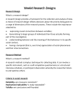 Week4 Research Designs Research Design What is a research design? A research design provides a framework for the collection and analysis of data. A choice of research design reflects decisions about the priority being given to a range of dimensions of the research process. These include the importance attached to: expressing causal connections between variables; Generalizing to larger groups of individuals than those actually forming part of the investigation; understanding behavior and the meaning of that behaviour in its specific social context; having a temporal (that is, over time) appreciation of social phenomena and their interconnections. Research Method What is a research method? A research method is simply a technique for collecting data. It can involve a specific instrument, such as a self-completion questionnaire or a structured interview schedule, or participant observation whereby the researcher listens to and watches others. Criteria in social research Reliability–are measures consistent? Replication/replicability–is study repeatable? Validity–are conclusions well-founded Types of validity Measurement (or construct) validity–do measures reflect concepts? Internal validity–are causal relations between variables real? External validity–can results be generalized beyond the research setting? Ecological validity–are findings applicable to everyday life? Alternative criteria in qualitative research Trustworthiness (Lincoln and Guba (1985): Credibility, parallels internal validity -i.e. how believable are the findings? Transferability, parallels external validity -i.e. do the findings apply to other contexts? Dependability, parallels reliability -i.e. are the findings likely to apply at other times? Confirmability, parallels objectivity -i.e. has the investigator allowed his or her values to intrude to a high degree? Variable What is a variable? A variable is simply an attribute on which cases vary. 'Cases' can obviously be people, but they can also include things such as households, cities, organizations, schools, and nations. If an attribute does not vary, it is a constant. If all manufacturing organizations had the same ratio of male to female managers, this attribute of such organizations would be a constant and not a variable. Constants are rarely of interest to social researchers. It is common to distinguish between different types of variable. The most basic distinction is between independent variables and dependent variables. The former are deemed to have a causal influence on the latter. In addition, it is important to distinguish between variables-whether independent or dependent-in terms of their measurement properties. This is an important issue in the context of quantitative data analysis Types of research design 1. Experimental 2. Cross-sectional 3. Longitudinal 4. Case study 5. Comparative Experimental design elements 1. 2. 3. 4. 5. Random assignment of subjects to experimental and control groups Pre-testing of both groups Independent variable manipulated; all other variables held constant Post-testing of both groups Computation and analysis of group differences Threats to validity 1. Other (non-experimental) events may have caused the changes observed (‘history’) 2. Subjects may become sensitized to ‘testing’ 3. People change over time in any event (‘maturation’) 4. Non-random ‘selection’ could explain differences 5. ‘Ambiguity about the direction of causal influence’ because sometimes the temporal sequence is unclear Cross-sectional design “A cross-sectional design entails the collection of data on more than one case (usually quite a lot more than one) and at a single point in time in order to collect a body of quantitative or quantifiable data in connection with two or more variables (usually many more than two), which are then examined to detect patterns of association.” A sample of cases At a single point in time Qualitative or quantitative data Patterns of association Evaluating cross-sectional research Reliability and Measurement Validity are not connected to the design as such Replicability will be high as long as the researcher specifies all the procedures Internal Validity is weak, because co-relations are much more likely to be found than causality External Validity will be strong if the sample is truly random Ecological Validity may be compromised by the instruments used Longitudinal design Survey of the same sample that is repeated on more than one occasion over time Typically used to map change in social research In panel study(e.g. TUIK IncomeandLivingConditionsPanel Survey) Or a cohort study(e.g. NCDS –National Child Development Study –sample of children born in 1958) Surveys like the Crime Survey for England and Wales, and the British Social Attitudes Survey should not be considered longitudinal as they do not involve the same people –they are better thought of as repeated cross-sectional designs Evaluating longitudinal research Attrition, because people die, or move home, or withdraw from the study. Knowing when is the right time for the next wave of data collection. The first round may have been badly thought out or not originally designed as longitudinal, which leaves the later rounds in a bit of a mess. A panel conditioning effect may creep into the research Case study design Detailed and intensive analysis of one case e.g. a single community, school, family, person, event, or organization Often involves qualitative research, but not necessarily so Approach is usually idiographic Types of case: critical, unique, exemplifying, revelatory, longitudinal e.g. Hold away(1982, 1983): an ethnography of occupational culture in a particular police force (Overall, the thesis demonstrates the continuing dominance of lower police ranks who maintain freedom from legal and organizational constraints to practice police work as they define it) Evaluating case-study research The biggest issue concerns external validit