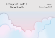 Concepts of Health & Global Health • Compare and contrast various definitions of health • Describe historical approaches to health and influence on health discourse • Define global health • Define health disparity and healthcare disparity Learning Outcomes • Understand the transition from the Millenium Development Goals to the Sustainable Development goals and describe the sustainable development goals • Identify nursing organizations with resources related to global health such as: College of Nursing website page on Global Health/Canadian Nurses Association/International Council of Nurses • Give two examples of where nurses may experience the impact of global health in their daily work • Explore the role of the registered nurse as a global citizen What is Health? Discus with your peers how you describe ‘health’. Has this definition changed during your life? What influences your concept of ‘health’? Health Meanings Vary • “from every perspective, and even for every individual, health may mean something different” (van Druten, et al, 2022, p. 1) • General Population themes: • multi-sided, self-management, participation, and subjective. • Health Care Worker themes: • multi-sided, subjective, adapting to change, satisfying life, wellbeing/complete wellbeing and functioning. (van Druten et al., 2022) Health as a Negative Construct • Health as the absence of disease • A continuum Health (Potter & Perry, 2024,7th Canadian Edition, Chapter 1) Death Health as a Positive Construct Health, Illness, Disease, & Wellness have relationships to one another • Health as Stability • Health as Actualization • Health as Stability and Actualization • Health as Resource • Health as Unity • Health as Empowerment Health is defined as the maintenance of physiological, functional, and social norms, and encompasses views of health as a state, as a process, as adaptation, and as homeostasis. Health is defined as the actualization of human potential 1986) and includes capacities to fulfill roles, meet demands, and engage in the activities of everyday living (Mikkonen & Raphael, “reflecting the whole person as process and is synonymous with self-transcendence” (Potter & Perry, 2024, 7th Canadian Edition, Chapter 1) Disease is an objective state of ill health, the pathological process of which can be detected by medical science. Illness is a subjective experience of loss of health. Health is an objective process characterized by functional stability, balance, and integrity, Wellness is a subjective experience. WHO Defintion Health is: ““the extent to which an individual or group is able, on the one hand, to realize aspirations and satisfy needs; and, on the other hand, to change or cope with the environment. Health is, therefore, seen as a resource for everyday life, not the objective of living; it is a positive concept emphasizing social and personal resources, as well as physical and psychological capacities” (p.3)” (WHO, 1984, as quoted in Potter & Perry, 2024, 7th Canadian Edition, p.3) Labonte’s Conceptualization of Health • Holistic • Multidimensional • Relational • Includes health as stability and as actualization (Potter & Perry, 2024, fig. 1.2, p. 3) A Venn diagram shows the intersection of three circles representing physical, social, and mental health. The circle at the top marked as physical represents vitality, and energy. The circle at the bottom-right marked as social represents connectedness and community. The circle at the bottom-left marked as mental represents meaning, and purpose. The intersection of the circles marked as physical and social health represents enjoyment of good social relations. The intersection of the circles marked as social and mental health represents feeling of control over life, and living conditions. The intersection of the circles marked as health of mental and physical health represents ability to do things one enjoys. The intersection of all three circles represent well-being. • Having a feeling of control over one’s life and living conditions • Being able to do things that one enjoys • Having a sense of purpose • Feeling connected to community. Defining Health for the 21st Century • Positive • Comprehensive • Includes the mental health dimension • Includes the quality of life and spiritual dimension (Potter & Perry, 2024) Historical Approaches to Health Medical Approach: focus on physiology, pathology, treating diseases Behavioral Approach: focus on lifestyle Socioenvironmental Approach: focus on the social context of health (Labonte, 1993, as cited in Potter & Perry, 2024) Health Discourse • Medical system view of health (bio-medical) • Health care system view • Lay perspectives influence health discourse • Global health perspective • “Health is political because its social determinants are amenable to political action or inaction” (Bambra et al, p. 187) (Bambra et al., 2005) Globalization • It is the increased interconnectedness and interdependence of people and countries. (Holtz, 2022) • Globalization has positive and negative impacts on global health (CNA, 2009) Global Health • “an area of study, research and practice that places a priority on improving health and achieving equity in health for all people worldwide.” (Holtz, 2022, p. 3) • “Is the optimal well-being of all humans from the individual and collective perspective” (CNA, 2009, p1). • Global health is a fundamental human right • Good health for one improves the health of all (CNA, 2009) Global Health • Global health refers to any health issue that concerns • Global health refers to any solutions (ex: polio eradication, distribution of covid vaccines) (Breakey, Corless, Meedzan & Nicholas, 2015) • Global health refers to transnational issues and local issues (Koplan et al., 2009) Major Global Health Issues • Communicable and Noncommunicable Disease • Life expectancy at birth