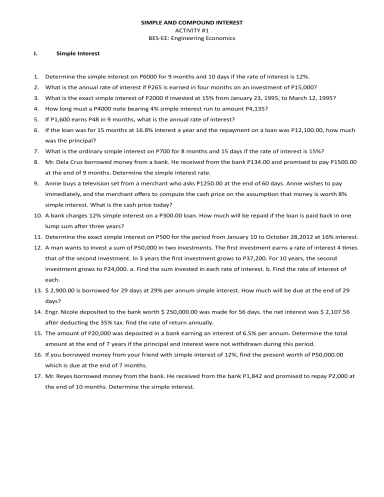 SIMPLE AND COMPOUND INTEREST ACTIVITY #1 BES-EE: Engineering Economics I. Simple Interest 1. Determine the simple interest on P6000 for 9 months and 10 days if the rate of interest is 12%. 2. What is the annual rate of interest if P265 is earned in four months on an investment of P15,000? 3. What is the exact simple interest of P2000 if invested at 15% from January 23, 1995, to March 12, 1995? 4. How long must a P4000 note bearing 4% simple interest run to amount P4,135? 5. If P1,600 earns P48 in 9 months, what is the annual rate of interest? 6. If the loan was for 15 months at 16.8% interest a year and the repayment on a loan was P12,100.00, how much was the principal? 7. What is the ordinary simple interest on P700 for 8 months and 15 days if the rate of interest is 15%? 8. Mr. Dela Cruz borrowed money from a bank. He received from the bank P134.00 and promised to pay P1500.00 at the end of 9 months. Determine the simple interest rate. 9. Annie buys a television set from a merchant who asks P1250.00 at the end of 60 days. Annie wishes to pay immediately, and the merchant offers to compute the cash price on the assumption that money is worth 8% simple interest. What is the cash price today? 10. A bank charges 12% simple interest on a P300.00 loan. How much will be repaid if the loan is paid back in one lump sum after three years? 11. Determine the exact simple interest on P500 for the period from January 10 to October 28,2012 at 16% interest. 12. A man wants to invest a sum of P50,000 in two investments. The first investment earns a rate of interest 4 times that of the second investment. In 3 years the first investment grows to P37,200. For 10 years, the second investment grows to P24,000. a. Find the sum invested in each rate of interest. b. Find the rate of interest of each. 13. $ 2,900.00 is borrowed for 29 days at 29% per annum simple interest. How much will be due at the end of 29 days? 14. Engr. Nicole deposited to the bank worth $ 250,000.00 was made for 56 days. the net interest was $ 2,107.56 after deducting the 35% tax. find the rate of return annually. 15. The amount of P20,000 was deposited in a bank earning an interest of 6.5% per annum. Determine the total amount at the end of 7 years if the principal and interest were not withdrawn during this period. 16. If you borrowed money from your friend with simple interest of 12%, find the present worth of P50,000.00 which is due at the end of 7 months. 17. Mr. Reyes borrowed money from the bank. He received from the bank P1,842 and promised to repay P2,000 at the end of 10 months. Determine the simple interest. II. Compound Interest 1. At an annual rate of 8%, what is the future worth of P100 at the end of 4 years? 2. If you borrow money from your friend with interest rate of 12%, find the present worth of P20,000, which is due at the end of nine months. 3. A person pays interest on a loan semiannually at a nominal annual interest rate of 16%. What is the effective annual interest rate? 4. A man borrowed P100,000 at the interest rate of 12% per annum compounded quarterly. What is the effective rate? 5. By condition of a will, the sum of P20,000 is left to a girl to be held in trust by her guardian until it amounts to P50,000. When will the girl receive the money if the fund is invested at 8% compounded quarterly? 6. At what rate of annual interest will an investment quadruple itself in 12 years? 7. How many months at an interest rate of 1 percent per month does money have to be invested before it will double in value? 8. A bank is advertising 9.5% accounts that yield 9.84% annually. How often is the interest compounded? 9. What is the interest rate compounded monthly is equivalent to 10% effective rate? 10. If a credit pays 4.125% interest compounded quarterly, what is the annual interest rate? 11. A nominal rate of 12% compounded semi-monthly will have an effective rate of how much? 12. At a certain interest rate compounded semi-annually, P5000 will amount to P20,000 after 10 years. What is the amount at the end of 15 years? 13. The purchase price of a car is P25,000. Mr. smith makes a down payment of P5,000 and borrows the balance from a bank at 6% interest for 5 years. Calculate the nearest value of the required monthly payments to pay-off the loan. 14. P200,000 was deposited on January 1, 1998, at an interest rate of 24% compounded semi-annually. How much would be the sum on January 1, 1993? 15. A man planned to endow P1 million to his son’s 21st birthday. How much is his semi-annual deposit in a special account that earns 5% compounded quarterly if the first deposit was made when the son was 4 ½ years old? 16. What is the present worth of P500 deposited at the end of every three months for 6 years if the interest rate is 12% compounded semi-annually? 17. What rate of interest compounded annually is the same as the rate of interest of 8% compounded quarterly? 18. A person invests P450 to be collected in eight years. Given that the interest rate on the investment is 14.5% compounded annually, what sum in pesos will be collected eight years? 19. What is the effective rate corresponding to 16% compounded daily? Take 1 year = 360 days. 20. P1500 was deposited in a bank account, 20 years ago. Today, it is worth P3000. Interest is paid semi-annually. Determine the interest rate paid on this account. 21. P5000 is put into an empty savings account with a nominal interest rate of 5%. No other contributions are made in the account. With monthly compounding, how much interest will have been earned after 5 years? 22. Determine the accumulated value of P2,000 in 5 years if invested at 11% compounded quarterly. 23. The sum of P15,000 deposited in an account earning 4% per annum compounded quarterly, will become P18,302.85. Determine the effective rate of interest per year. 24. Find the number of years when P2,500 is compounded to P5,800 if invested at 12% compounded quarterly. 25. What rate compounded quarterly is equivalent to 14% comp