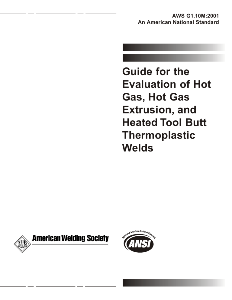 AWS G1.10M:2001 An American National Standard Guide for the Evaluation of Hot Gas, Hot Gas Extrusion, and Heated Tool Butt Thermoplastic Welds AWS G1.10M:2001 An American National Standard Key Words —Hot gas welding, thermoplastics, heated tool butt welding, joints, evaluation, testing, hot gas extrusion Approved by American National Standards Institute February 21, 2001 Guide for the Evaluation of Hot Gas, Hot Gas Extrusion, and Heated Tool Butt Thermoplastic Welds Prepared by AWS G1 Committee on Joining Plastics and Composites Under the Direction of AWS Technical Activities Committee Approved by AWS Board of Directors Abstract This standard lists and describes defects in hot gas, hot gas extrusion, and heated tool butt welded joints in thermoplastics. Its intent is to make possible a generally valid evaluation giving consideration to graded quality requirements. This standard encompasses the classification, requirements, testing, evaluation, and acceptance of the welds. Details in recording engineering data are described. Tables illustrating cracks, voids, solid inclusions, lack of fusion, defects of shape, and other defects in thermoplastic welds are included. Defect features with descriptions and illustrations are compiled into tables to aid in the evaluation of welds. 550 N.W. LeJeune Road, Miami, Florida 33126 Statement on Use of AWS American National Standards All standards (codes, specifications, recommended practices, methods, classifications, and guides) of the American Welding Society are voluntary consensus standards that have been developed in accordance with the rules of the American National Standards Institute. When AWS standards are either incorporated in, or made part of, documents that are included in federal or state laws and regulations, or the regulations of other governmental bodies, their provisions carry the full legal authority of the statute. In such cases, any changes in those AWS standards must be approved by the governmental body having statutory jurisdiction before they can become a part of those laws and regulations. In all cases, these standards carry the full legal authority of the contract or other document that invokes the AWS standards. Where this contractual relationship exists, changes in or deviations from requirements of an AWS standard must be by agreement between the contracting parties. International Standard Book Number: 0-87171-615-1 American Welding Society, 550 N.W. LeJeune Road, Miami, FL 33126 © 2001 by American Welding Society. All rights reserved Printed in the United States of America AWS American National Standards are developed through a consensus standards development process that brings together volunteers representing varied viewpoints and interests to achieve consensus. While AWS administers the process and establishes rules to promote fairness in the development of consensus, it does not independently test, evaluate, or verify the accuracy of any information or the soundness of any judgments contained in its standards. AWS disclaims liability for any injury to persons or to property, or other damages of any nature whatsoever, whether special, indirect, consequential or compensatory, directly or indirectly resulting from the publication, use of, or reliance on this standard. AWS also makes no guaranty or warranty as to the accuracy or completeness of any information published herein. In issuing and making this standard available, AWS is not undertaking to render professional or other services for or on behalf of any person or entity. Nor is AWS undertaking to perform any duty owed by any person or entity to someone else. Anyone using these documents should rely on his or her own independent judgment or, as appropriate, seek the advice of a competent professional in determining the exercise of reasonable care in any given circumstances. This standard may be superseded by the issuance of new editions. Users should ensure that they have the latest edition. Publication of this standard does not authorize infringement of any patent. AWS disclaims liability for the infringement of any patent resulting from the use or reliance on this standard. Finally, AWS does not monitor, police, or enforce compliance with this standard, nor does it have the power to do so. Official interpretations of any of the technical requirements of this standard may be obtained by sending a request, in writing, to the Managing Director Technical Services, American Welding Society, 550 N.W. LeJeune Road, Miami, FL 33126 (see Annex C). With regard to technical inquiries made concerning AWS standards, oral opinions on AWS standards may be rendered. However, such opinions represent only the personal opinions of the particular individuals giving them. These individuals do not speak on behalf of AWS, nor do these oral opinions constitute official or unofficial opinions or interpretations of AWS. In addition, oral opinions are informal and should not be used as a substitute for an official interpretation. This standard is subject to revision at any time by the AWS G1 Committee on Joining of Plastics and Composites. It must be reviewed every five years and if not revised, it must be either reapproved or withdrawn. Comments (recommendations, additions, or deletions) and any pertinent data that may be of use in improving this standard are required and should be addressed to AWS Headquarters. Such comments will receive careful consideration by the AWS G1 Committee on Joining of Plastics and Composites and the author of the comments will be informed of the Committee’s response to the comments. Guests are invited to attend all meetings of the AWS G1 Committee on Joining of Plastics and Composites to express their comments verbally. Procedures for appeal of an adverse decision concerning all such comments are provided in the Rules of Operation of the Technical Activities Committee. A copy of these Rules can be obtained from the American Welding Society, 550 N.W. LeJeune