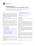 Designation: C566 − 13 Standard Test Method for Total Evaporable Moisture Content of Aggregate by Drying1 This standard is issued under the fixed designation C566; the number immediately following the designation indicates the year of original adoption or, in the case of revision, the year of last revision. A number in parentheses indicates the year of last reapproval. A superscript epsilon (´) indicates an editorial change since the last revision or reapproval. This standard has been approved for use by agencies of the U.S. Department of Defense. for Test Methods for Construction Materials D75 Practice for Sampling Aggregates E11 Specification for Woven Wire Test Sieve Cloth and Test Sieves 2.2 Other Document: National Research Council Report SHRP-P-6193 1. Scope 1.1 This test method covers the determination of the percentage of evaporable moisture in a sample of aggregate by drying both surface moisture and moisture in the pores of the aggregate. Some aggregate may contain water that is chemically combined with the minerals in the aggregate. Such water is not evaporable and is not included in the percentage determined by this test method. 3. Terminology 1.2 The values stated in SI units are to be regarded as the standard. No other units of measurement are included in this standard. 3.1 Definitions: 3.1.1 For definitions of terms used in this test method, refer to Terminology C125. NOTE 1—Sieve size is identified by its standard designation in Specification E11. The alternative designation given in parentheses is for information only and does not represent a different standard sieve size. 4. Significance and Use 4.1 This test method is sufficiently accurate for usual purposes, such as adjusting batch quantities of ingredients for concrete. It will generally measure the moisture in the test sample more reliably than the sample can be made to represent the aggregate supply. In cases where the aggregate itself is altered by heat, or where more refined measurement is required, the test should be conducted using a ventilated, controlled temperature oven. 1.3 This standard does not purport to address all of the safety concerns, if any, associated with its use. It is the responsibility of the user of this standard to establish appropriate safety and health practices and determine the applicability of regulatory limitations prior to use. For specific precautionary statements, see 5.3.1, 7.2.1, and 7.3.1. 2. Referenced Documents 4.2 Large particles of coarse aggregate, especially those larger than 50 mm, will require greater time for the moisture to travel from the interior of the particle to the surface. The user of this test method should determine by trial if rapid drying methods provide sufficient accuracy for the intended use when drying large size particles. 2 2.1 ASTM Standards: C29/C29M Test Method for Bulk Density (“Unit Weight”) and Voids in Aggregate C125 Terminology Relating to Concrete and Concrete Aggregates C127 Test Method for Relative Density (Specific Gravity) and Absorption of Coarse Aggregate C128 Test Method for Relative Density (Specific Gravity) and Absorption of Fine Aggregate C670 Practice for Preparing Precision and Bias Statements 5. Apparatus 5.1 Balance—A balance or scale accurate, readable, and sensitive to within 0.1 % of the test load at any point within the range of use. Within any interval equal to 10 % of the capacity of the balance or scale used to determine mass, the load indication shall be accurate within 0.1 % of the difference in masses. 1 This test method is under the jurisdiction of ASTM Committee C09 on Concrete and Concrete Aggregatesand is the direct responsibility of Subcommittee C09.20 on Normal Weight Aggregates. Current edition approved Feb. 1, 2013. Published February 2013. Originally approved in 1965. Last previous edition approved in 2004 as C566 – 97 (2004). DOI: 10.1520/C0566-13. 2 For referenced ASTM standards, visit the ASTM website, www.astm.org, or contact ASTM Customer Service at service@astm.org. For Annual Book of ASTM Standards volume information, refer to the standard’s Document Summary page on the ASTM website. 5.2 Source of Heat—A ventilated oven capable of maintaining the temperature surrounding the sample at 110 6 5°C. Where close control of the temperature is not required (see 3 Available from the National Research Council, 2101 Constitution Ave., N.W., Washington, DC 20418. Copyright © ASTM International, 100 Barr Harbor Drive, PO Box C700, West Conshohocken, PA 19428-2959. United States 1 26 C566 − 13 7.3 When a hot plate is used, drying can be expedited by the following procedure. Add sufficient anhydrous denatured alcohol to cover the moist sample. Stir and allow suspended material to settle. Decant as much of the alcohol as possible without losing any of the sample. Ignite the remaining alcohol and allow it to burn off during drying over the hot plate. 7.3.1 Warning—Exercise care to control the ignition operation to prevent injury or damage from the burning alcohol. 4.1), other suitable sources of heat may be used, such as an electric or gas hot plate, electric heat lamps, or a ventilated microwave oven. 5.3 Sample Container—A container not affected by the heat, of sufficient volume to contain the sample without danger of spilling, and of such shape that the depth of sample will not exceed one fifth of the least lateral dimension. 5.3.1 Precaution—When a microwave oven is used, the container shall be nonmetallic. 7.4 The sample is thoroughly dry when further heating causes, or would cause, less than 0.1 % additional loss in mass. NOTE 2—Except for testing large samples, an ordinary frying pan is suitable for use with a hot plate, or any shallow flat-bottomed metal pan is suitable with heat lamps or oven. Note the precaution in 5.3.1. 7.5 Determine the mass of the dried sample to the nearest 0.1 % after it has cooled sufficiently not to damage the balance. 5.4 Stirrer—A metal spoon or spatula 