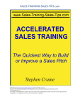SALES-TRAINING TRAINING-SALES-TIPS.com TIPS.com © Stephen Craine www.sales-training-sales-tips.com tips.com 2011 All rights reserved. No part of this eBook may be copied or reproduced for profit in any format without prior permission of the author Stephen Craine. This eBook is made available on condition that it will not be sold or redistributed for profit in any form but may be passed and distributed on in its original form for free with no alterations or additions. SALES-TRAINING-SALES-TIPS.com Accelerated Sales Training Accelerated Sales Training that you can put into action in just a few minutes. Sales training with just a few pages of key content on the most important elements for each stage of the sales process. That’s all you need to form an effective sales process, and to make immediate improvements to your sales pitch by adding any of the elements that you are not currently using. This sales training will help all sales people, and small business owners, to create an effective sales pitch using a proven process. The compact easy to use 6 sections are: • • • • • • A main page with an overview of the sales process How to create a great Sales Introduction Asking the right Sales Questions Sales Presentation techniques Closing the Sale Overcoming Objections Precise, targeted, accelerated, sales training that you can put into action today. All the techniques that you will see here come from the full professional sales training courses that I have used for over two decades to help sales teams in many industries to become more successful. So grab a cup of coffee, and focus and invest a few minutes on yourself for a change, and see what there is for you as you click around the Accelerated Sales Training... SALES-TRAINING-SALES-TIPS.com What this training will give you Accelerated sales training will give you an effective selling process that gives you confidence, closes more sales, and makes selling easy. From just these few pages today you can: • • • • • Learn to close more sales Achieve consistent sales results Have great confidence in front of buyers Know where you are and what to say at all times during the sale Have an objective for each sales stage which will lead you to the close All successful sales professionals use a selling process in their face to face meetings with prospects. This selling process leads their prospects through the sales stages and towards the close. It isn’t a rehearsed script, it’s a process. A process made up of stages which use a set of techniques to achieve an objective before moving on to the next stage. In the final stage you close the sale, earn your commission, and grow our business. By learning the process you can use your own words, include all your existing sales skills, and adapt your sales pitch for all types of prospects in all markets and industries. That means when you have this selling process as your foundation you can use all the sales skills that you currently have, and all the new ones that you are now going to learn, to make it even more effective. That’s why we call it Accelerated Sales Training, because you quickly learn a process not a script. Why this professional sales training works The sales process that you pick up here has been developed by a working sales manager to help sales people build a successful career. These are not classroom techniques that only work in role plays and scenarios. The skills and techniques that click together to form this sales process have all been tried and tested in real sales situations with real prospects. Professional sellers around the world have done exactly what you are doing now. They have bought into this advanced sales training and are now using the skills and techniques everyday to make a living. It works for them and it will work for you. SALES-TRAINING-SALES-TIPS.com The professional sales process The sales process has 5 stages that take the prospect with you from the first introduction to the closing of the sale: • • • • • Sales Introduction Sales Questions Sales Presentation Closing the Sale Handing Sales Objections The 5th stage, handling sales objections, can slot into the process at any place where an objection arises. If there are no objections then you simply don’t use it. Do not be fooled by the simplicity of what you see here. Sales training, and how we all sell as professionals, should not be full of complicated techniques. The simpler the process the easier it is to use, and that’s when confidence clicks in. I have seen many sellers try and use techniques that they have been shown on courses and in books that just don’t work in the real world. Scripted sales pitches, long acronyms to follow, and while they are concentrating on remembering the next stage they are losing the connection with the buyer. You can see how easy the basic process above is to remember. Now we add a few key points to each of the stages, and I mean only a few. Many people that have gone onto successful long term careers have learnt this process, and the few key elements of each stage, in just a few minutes. Then they want more, and if you like them want more, we have added some links to each page to show you where you can get it. Now let’s start with the first of the sales stages... SALES-TRAINING-SALES-TIPS.com The Sales Introduction Stage of the Selling Process The Sales Introduction is where you should be grabbing the prospect’s attention and making them want to hear more about what you have to offer. The introduction is the start of the face to face sale. It may only take a minute to complete but if you get it wrong you can lose any chance of making the sale. Your introduction also includes a key element of: The most important line in the sales process, but we’ll come on to that later. The objectives of the Sales Introduction Stage are: To take hold of the prospect’s attention and to move smoothly to the next stage of the sales process. There are fi