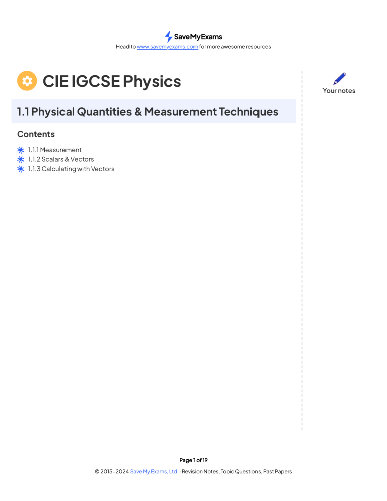 Head to www.savemyexams.com for more awesome resources CIE IGCSE Physics 1.1 Physical Quantities & Measurement Techniques Contents 1.1.1 Measurement 1.1.2 Scalars & Vectors 1.1.3 Calculating with Vectors Page 1 of 19 © 2015-2024 Save My Exams, Ltd. · Revision Notes, Topic Questions, Past Papers Your notes Head to www.savemyexams.com for more awesome resources 1.1.1 Measurement Your notes Measuring Length & Volume Rulers can be used to measure small distances of a few centimetres (cm). They are able to measure to the nearest millimetre (mm) Use this image A ruler can measure small distances to the nearest mm When measuring larger distances (of a few metres) a tape measure is more appropriate or, when measuring even larger distances, a trundle wheel Page 2 of 19 © 2015-2024 Save My Exams, Ltd. · Revision Notes, Topic Questions, Past Papers Head to www.savemyexams.com for more awesome resources Your notes Use this image Trundle wheels can be used to measure large distances Measuring cylinders can be used to measure the volume of liquids By measuring the change in volume, a measuring cylinder can also be used to find the volume of an irregular shape Page 3 of 19 © 2015-2024 Save My Exams, Ltd. · Revision Notes, Topic Questions, Past Papers Head to www.savemyexams.com for more awesome resources Your notes Use this image Measuring cylinders can be used to determine the volume of a liquid or an irregular shaped solid Page 4 of 19 © 2015-2024 Save My Exams, Ltd. · Revision Notes, Topic Questions, Past Papers Head to www.savemyexams.com for more awesome resources Worked example The diagram shows four identical ball-bearings placed between two blocks on a steel ruler. Use this image Calculate the diameter of one ball-bearing. Step 1: Measure the length of all four ball-bearings The blocks mark the edges of the first and last ball bearings The blocks make it easier to measure the length of all four ball-bearings Total length = 12 cm − 4 cm = 8 cm Step 2: Divide the total length by the number of ball-bearings Diameter = total length ÷ number of ball-bearings Diameter = 8 ÷ 4 Diameter = 2 cm Page 5 of 19 © 2015-2024 Save My Exams, Ltd. · Revision Notes, Topic Questions, Past Papers Your notes Head to www.savemyexams.com for more awesome resources Measuring Time Stop-clocks and stopwatches can be used to measure time intervals An important factor when measuring time intervals is human reaction time. This can have a significant impact upon measurements when the measurements involved are very short (less than a second) Worked example A stopwatch is used to measure the time taken for a runner to complete a lap of a 400 m track. The images below give the readings on the stopwatch at the start and the end of the lap. Use this image Calculate how long it took the runner to complete the lap. Give your answer in seconds. Step 1: Identify the start time for the lap The stopwatch was already at 0:55:10 when the runner started the lap Start time = 55.10 seconds (s) Step 2: Identify the finish time for the lap The stopwatch reads 1:45:10 at the end of the lap Finish time = 1 minute and 45.10 s Step 3: Convert the finish time into seconds Page 6 of 19 © 2015-2024 Save My Exams, Ltd. · Revision Notes, Topic Questions, Past Papers Your notes Head to www.savemyexams.com for more awesome resources 1 minute = 60 seconds Finish time = 60 s + 45.10 s Finish time = 105.10 s Step 4: Calculate the time taken to complete the lap The time taken to complete the lap = finish time − start time Time taken to complete lap = 105.10 s − 55.10 s Time taken to complete lap = 50 s Exam Tip You will sometimes find that information is given in the question that is not actually needed in the calculation. In this worked example, you were told that the track the runner is running on is 400 m. This had nothing to do with the calculation the question asked you to perform. This is a common method for making a question seem more difficult. Don't let it catch you out! Page 7 of 19 © 2015-2024 Save My Exams, Ltd. · Revision Notes, Topic Questions, Past Papers Your notes Head to www.savemyexams.com for more awesome resources Multiple Readings Your notes Use this image Suppose you have to measure the thickness of a sheet of paper The thing that you are trying to measure is so small that it would be very difficult to get an accurate answer If, however, you measure the thickness of 100 sheets of paper you can do so much more accurately Dividing your answer by 100 will then give an accurate figure for the thickness of one sheet This process of taking a reading of a large number of values and then dividing by the number, is a good way of getting accurate values for small figures, including (for example) the time period of a pendulum Measure the time taken for 10 swings and then divide that time by 10 to find the average Page 8 of 19 © 2015-2024 Save My Exams, Ltd. · Revision Notes, Topic Questions, Past Papers Head to www.savemyexams.com for more awesome resources 1.1.2 Scalars & Vectors Your notes Scalar & Vector Quantities EXTENDED All quantities can be one of two types: A scalar A vector Scalars Scalars are quantities that have only a magnitude For example, mass is a scalar since it is a quantity that has magnitude without a direction Distance is also a scalar since it only contains a magnitude, not a direction Vectors Vectors have both magnitude and direction Velocity, for instance, is a vector since it is described with both a magnitude and a direction When describing the velocity of a car it is necessary to mention both its speed and the direction in which it is travelling For example, the velocity might be 60 km per hour (magnitude) due west (direction) Distance is a value describing only how long an object is or how far it is between two points - this means it is a scalar quantity Displacement on the other hand also describes the direction in which the distance is measured - this means it is a vector quantity For example