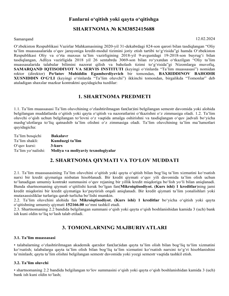 Fanlarni o‘qitish yoki qayta o‘qitishga SHARTNOMA № KM3852415688 12.02.2024 Samarqand O‘zbekiston Respublikasi Vazirlar Mahkamasining 2020-yil 31-dekabrdagi 824-son qarori bilan tasdiqlangan “Oliy ta’lim muassasalarida o‘quv jarayoniga kredit-modul tizimini joriy etish tartibi to‘g‘risida”gi hamda O‘zbekiston Respublikasi Oliy va o‘rta maxsus ta’lim vazirligining 2018-yil 9-avgustdagi 19-2018-son buyrug‘i bilan tasdiqlangan, Adliya vazirligida 2018 yil 26 sentabrda 3069-son bilan ro‘yxatdan o‘tkazilgan “Oliy ta’lim muassasalarida talabalar bilimini nazorat qilish va baholash tizimi to‘g‘risida”gi Nizomlarga muvofiq, SAMARQAND IQTISODIYOT VA SERVIS INSTITUTI (keyingi o‘rinlarda “Ta’lim muassasasi”) nomidan rektor (direktor) Po‘latov Muhiddin Egamberdiyevich bir tomondan, BAXRIDDINOV BAHODIR XUSNIDDIN O‘G‘LI (keyingi o‘rinlarda “Ta’lim oluvchi”) ikkinchi tomondan, birgalikda “Tomonlar” deb ataladigan shaxslar mazkur kontraktni quyidagicha tuzdilar: 1. SHARTNOMA PREDMETI 1.1. Ta’lim muassasasi Ta’lim oluvchining o‘zlashtirilmagan fan(lar)ini belgilangan semestr davomida yoki alohida belgilangan muddatlarda o‘qitish yoki qayta o‘qitish va nazoratlarini o‘tkazishni o‘z zimmasiga oladi. 1.2. Ta’lim oluvchi o‘qish uchun belgilangan to‘lovni o‘z vaqtida amalga oshirishni va tasdiqlangan o‘quv jadvali bo‘yicha mashg‘ulotlarga to‘liq qatnashib ta’lim olishni o‘z zimmasiga oladi. Ta’lim oluvchining ta’lim ma’lumotlari quyidagicha: Ta’lim bosqichi Ta’lim shakli: O‘quv kursi: Ta’lim yo‘nalishi: Bakalavr Kunduzgi taʼlim 3-kurs Moliya va moliyaviy texnologiyalar 2. SHARTNOMA QIYMATI VA TO‘LOV MUDDATI 2.1. Ta’lim muassasasining Ta’lim oluvchini o‘qitish yoki qayta o‘qitish bilan bog‘liq ta’lim xizmatini ko‘rsatish narxi bir kredit qiymatiga nisbatan hisoblanadi. Bir kredit qiymati o‘quv yili davomida ta’lim olish uchun to‘lanadigan umumiy kontrakt summasini o‘quv rejaning bir yillik kredit miqdoriga bo‘lish yo‘li bilan aniqlanadi. Bunda shartnomaning qiymati o‘qitilishi kerak bo‘lgan fan(Mikroiqtisodiyot. (Kurs ishi) 1 kreditlar)ning jami kredit miqdorini bir kredit qiymatiga ko‘paytirish orqali aniqlanadi. Bir kredit qiymati ta’lim yonalishlari yoki mutaxassisliklar turlariga qarab turlicha bo‘lishi mumkin. 2.2. Ta’lim oluvchini alohida fan Mikroiqtisodiyot. (Kurs ishi) 1 kreditlar bo‘yicha o‘qitish yoki qayta o‘qitishning umumiy qiymati 152166.00 soʻmni tashkil etadi. 2.3. Shartnomaning 2.2 bandida belgilangan summani o‘qish yoki qayta o‘qish boshlanishidan kamida 3 (uch) bank ish kuni oldin to‘liq to‘lash talab etiladi. 3. TOMONLARNING MAJBURIYATLARI 3.1. Ta’lim muassasasi • talabalarning oʻzlashtirilmagan akademik qarzdor fan(lar)idan qayta taʼlim olish bilan bogʻliq taʻlim xizmatini koʻrsatish; talabalarga qayta taʼlim olish bilan bogʻliq taʻlim xizmatini koʻrsatish narxini to‘g‘ri hisoblanishini ta’minlash; qayta ta’lim olishni belgilangan semestr davomida yoki yozgi semestr vaqtida tashkil etish. 3.2. Ta’lim oluvchi • shartnomaning 2.2 bandida belgilangan to‘lov summasini o‘qish yoki qayta o‘qish boshlanishidan kamida 3 (uch) bank ish kuni oldin to‘lash; • o‘qish uchun belgilangan to‘lov miqdorini to‘laganlik to‘g‘risidagi bank tasdiqnomasi va shartnomaning bir nusxasini o‘z vaqtida hujjatlarni rasmiylashtirish uchun ta’lim muassasasiga topshirish; • Ta’lim muassasasi tomonidan tashkil etilgan mashg‘ulotlarga muntazam ravishda qatnashish va davlat ta’lim standartlari talablari asosida bilim olish majburiyatini oladi. 4. SHARTNOMANI AMAL QILISH MUDDATI VA BEKOR QILISH TARTIBI 4.1. Shartnoma ikki tomonlama imzolangandan so‘ng kuchga kiradi hamda ta’lim xizmatini taqdim etish yakunlangunga qadar amalda bo‘ladi. 4.2. Shartnoma shartlariga ikkala tomon kelishuviga asosan tuzatish, o‘zgartirish va qo‘shimchalar kiritilishi mumkin. 4.3. Shartnoma tomonlarning o‘zaro roziligi bilan, tomonlardan biri shartnoma shartlarini bajarmaganida, uzrli sabablar bilan Ta’lim oluvchining tashabbusiga ko‘ra va amaldagi qonunchilikda ko‘rsatilgan boshqa hollarda bekor qilinishi mumkin. 5. BOSHQA SHARTLAR VA NIZOLARNI HAL QILISH TARTIBI 5.1. Shartnomani bajarish jarayonida tomonlar o‘rtasida kelib chiqadigan nizolar muzokaralar yo‘li bilan yoki qonunchilikda belgilangan tartibda hal etiladi. 5.2. Shartnoma 2 (ikki) nusxada, tomonlarning har biri uchun bir nusxadan tuzildi va ikkala nusxa ham bir xil huquqiy kuchga ega. 6. TOMONLARNING REKVIZITLARI VA IMZOLARI 6.1. Ta’lim muassasasi: SAMARQAND IQTISODIYOT VA SERVIS INSTITUTI Pochta manzili: Amir Temur ko'chasi 9- uy Tel.: (998) 66-233-38-72, Bank rekvizitlari: Алока банк Ҳ/Р: 23402000300100001010 ИНН: 201122919; МФО: 00014 Марказий банк ХККМ Тошкент шаҳар ББ. ш/ҳ: № 400910860184017094100350006 ИНН: 202009161 Ta’lim muassasasi rahbari: Po‘latov Muhiddin Egamberdiyevich 6.2. Ta’lim oluvchi F.I.Sh.: BAXRIDDINOV BAHODIR XUSNIDDIN O‘G‘LI Yashash manzili: Samarqand, Булунгурский Pasport ma’lumotlari: AB8334586 Pinfl: 52211016030016 Talaba kodi: ____________ Telefon raqami: ____________.