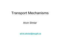 Transport Mechanisms Alvin Shrier alvin.shrier@mcgill.ca School of Biomedical Sciences Anatomy & Cell Biology Biochemistry Biomedical Engineering Goodman Cancer Institute Human Genetics Dahdaleh Institute for Genomics Medicine Microbiology & Immunology Pharmacology & Therapeutics Physiology McGill Biomedical Research Accelerator (MBRA) • • • • $7,500 Summer Studentship 15 students selected 15-week internship Labs in BIOC, PHAR, BME, MIMM, GCI, Lady Davies Institute, CRBS, MRM • Weekly seminars • Final Sumposium, Milieu intérieur or Internal Environment was used by Claude Bernard in 1854 to describe the role of the body in maintaining the uniformity of the conditions of life. So that the external variations are at each instant compensated for and equilibrated. Homeostasis, from the Greek words for "same" and "steady," Refers to any process that living things use to actively maintain fairly stable conditions necessary for survival. The term was coined in 1930 by the physician Walter Cannon. In order to preserve the constancy of the Milieu Intérieur and the homeostasis we need to exchange nutrients, salts, gases, and waste in and out of the body. Exchange between Compartments lungs Interstitial Fluid GI tract plasma ISF skin kidneys capillary wall cell membrane (plasma membrane) Intracellular Fluid ICF H2O-60% body wt ICF 28L, 11L ISF, plasma 3L Permeability Characteristics of Cell Membrane Highly Permeable to: H2O Lipid-soluble substances Dissolved Gases (O2, CO2) Small uncharged molecules Less Permeable to: Larger molecules Charged particles Impermeable to : Very Large molecules Cell Membrane Bimolecular Phospholipid Layer ( Phosholipid Bilayer) polar Cell (plasma) membrane 6-10nM thick nonpolar Amphipathic Polar and Nonpolar ends Phospholipids comprise 40-50% of the plasma membrane by weight. Cholesterol, inserted into the phospholipid bilayer functions as a buffer preventing lower temperatures from inhibiting fluidity and higher temperatures increasing fluidity too much. Cholesterol is also involved in the formation of vesicles that pinch off the plasma membrane and in lipid rafts. Slightly amphipatic. Integral Proteins: Most diverse macromolecules, 25-75% membrane by weight Integral – closely associated with phospholipids, mostly cross the membrane (Transmembrane) Peripheral – more loosely associated, mostly on the cytoplasmic side Peripheral Glycocalyx is a fuzzy coating that sourrounds the cell membrane formed of glycans, glycoproteins and glycolipids. The glycocalyx contributes to cell-cell recognition, communication, adhesion and protection. It helps to control vascular pemeability. glycoproteins, and glycolipids. Fluid Mosaic Model of Cell Membrane Amino acid transport Na-K pump G-protein receptor Insulin receptor ACh receptor Channels and Transporters Actin Microtubules Septins CD4 T Lymphocytes CD45 Leucocytes CD68 Monocytes CAMs Cadherins Integrins Transmembrane Pathways a. via phospholipid bilayer Channel b. via interaction with a transmembrane protein Carrier Exchanger Transporter Cell Membrane Transport Mechanisms PASSIVE ACTIVE (energy independent) (energy dependent) 1. Diffusion 2. Facilitated Diffusion 3. Osmosis 1. Active Transport a) Primary b) Secondary 2. Pino/Phagocytosis Diffusion Simple diffusion is the movement molecules from one location to another as a result of random thermal motion. Lump of sugar Sugar molecules Flux is the amount of particles crossing a surface per unit time Net flux is from high concentration to lower concentration. At equilibrium, diffusion fluxes are equal and net flux is zero. Diffusion occurs even in the presence of a mechanical partition (membrane) as long as it is permeable to diffusing particles At equilibrium, net movement = 0 Equilibrium Gradient Fig. 04.02 Fig. 04.03 Concentration C Co = extracellular concentration Ci = Co Ci = intracellular concentration 0 0 Time Consider the case of a single cell perfused extracellularly with a physiological solution. At time 0 the physiological solution is changed by adding a molecule at a concentration C0 ,which remains constant. The intracellular concentration Ci is zero at time 0 and increases over time until Ci = C0. FICK’s LAW of DIFFUSION J = PA (C0 – Ci) J Flux: moles of solute crossing a unit area per unit time - rate of diffusion P Permeability (or diffusion) coefficient: a constant based on the ease with which a molecule moves through a membrane A Surface area of the membrane Co – Ci Concentration gradient of the diffusing molecule across the membrane Diffusion time increases in proportion to the square of the distance travelled by the solute molecules. Diffusion is an effective transport process only over short distances. (Einstein's approximation equation) Time for Glucose Diffusion 1 um = 1 msec 10 um = 100 msec 100 um = 10,000 msec Cell Membrane Diffusion 1. Mass of the molecule 2. Concentration gradient 3. Lipid Solubility 4. Electrical charge 5. Ion channels 6. Membrane carriers Diffusion a) Diiffusion of non-polar molecules and gases across the lipid bilayer b) Diffusion of ions through channels Diffusion is related to the concentration gradient Ion Channels Ion channels are transmembrane proteins that show ion selectivity The movement of ions is also affected by the presence of an electrical gradient. The simultaneous existence of an electrical and a concentration gradient for a particular ion is known as an electrochemical gradient. K+ Intracellular milieu K+ K+ K+ K+ Concentration Gradient K+ K + K+ K+ K+ + + + K+ K K K - K+ K+ Extracellular milieu K+ - 90 mV Electrical Gradient 0 mV The simultaneous existence of an electrical and a concentration gradient for a particular ion is known as the electrochemical gradient. Ion channels can exist in open or closed state as they undergo conformational changes. This is known as gating. Channels may be gated in 3 ways: a. Ligand-gated Cooper b. Voltage-gated Hanrahan, Lukacs Shrier, c. Mechanically-gated Sharif 