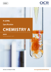 Qualification Accredited Oxford Cambridge and RSA A LEVEL Specification CHEMISTRY A H432 For first assessment in 2017 Version 2.8 (March 2024) ocr.org.uk/alevelchemistrya Disclaimer Registered office: The Triangle Building Shaftesbury Road Cambridge CB2 8EA OCR is an exempt charity. Specifications are updated over time. Whilst every effort is made to check all documents, there may be contradictions between published resources and the specification, therefore please use the information on the latest specification at all times. Where changes are made to specifications these will be indicated within the document, there will be a new version number indicated, and a summary of the changes. If you do notice a discrepancy between the specification and a resource please contact us at: resources.feedback@ocr.org.uk We will inform centres about changes to specifications. We will also publish changes on our website. The latest version of our specifications will always be those on our website (ocr.org.uk) and these may differ from printed versions. © 2024 OCR. All rights reserved. Copyright OCR retains the copyright on all its publications, including the specifications. However, registered centres for OCR are permitted to copy material from this specification booklet for their own internal use. Oxford Cambridge and RSA is a Company Limited by Guarantee. Registered in England. Registered company number 3484466. Contents 1 2 3 4 5 Introducing… A Level Chemistry A (from September 2015) Teaching and learning resources Professional Development ii iii iv Why choose an OCR A Level in Chemistry A? 1 1 2 3 4 The specification overview 5 5 6 8 64 Assessment of OCR A Level in Chemistry A 65 65 66 66 67 67 67 67 67 68 68 Admin: what you need to know 69 69 71 71 72 72 73 73 Appendices Overlap with other qualifications Avoidance of bias Chemistry A data sheet How Science Works (HSW) Mathematical requirements Health and Safety Practical endorsement Revision of the requirements for practical work 74 74 74 75 79 80 86 87 93 Summary of updates 94 1a. 1b. 1c. 1d. Why choose an OCR qualification? Why choose an OCR A Level in Chemistry A? What are the key features of this specification? How do I find out more information? 2a. 2b. 2c. 2d. Overview of A Level in Chemistry A (H432) Content of A Level in Chemistry A (H432) Content of modules 1 to 6 Prior knowledge, learning and progression 3a. 3b. 3c. 3d. 3e. 3f. 3g. 3h. 3i. 3j. Forms of assessment Assessment objectives (AO) Total qualification time Qualification availability outside of England Language Assessment availability Retaking the qualification Assessment of extended response Synoptic assessment Calculating qualification results 4a. 4b. 4c. 4d. 4e. 4f. 4g. Pre-assessment Accessibility and special consideration External assessment arrangements Admin of non-exam assessment Results and certificates Post-results services Malpractice 5a. 5b. 5c. 5d. 5e. 5f. 5g. 5h. Version 2.8 © OCR 2024 A Level in Chemistry A i Introducing… A Level Chemistry A (from September 2015) This specification allows teachers to adopt a flexible approach to the delivery of A Level Chemistry. The course has been designed to enable centres to deliver the content modules (Modules 2–6) using the framework provided or to design a customised course. Practical work done to support teaching of the content will serve to cover the requirements of the practical skills module (Module 1), which is assessed in written examinations and through the Practical Endorsement. The specification is divided into chemical topics, each containing different key concepts of chemistry. Certain topics are split over modules, to facilitate co-teaching of the AS Level qualification in Chemistry A with the first year of A Level. Centres that are not co-teaching this course with the AS Level may elect to teach these topics sequentially. This specification incorporates the Ofqual GCE Subject Level Conditions and Requirements for Chemistry. Contact the team We have a dedicated team of people working on our A Level Chemistry qualifications. If you need specialist advice, guidance or support, get in touch as follows: • 01223 553998 • scienceGCE@ocr.org.uk • @OCR_science Throughout the specification, cross-references indicate the relevance of individual learning outcomes to the mathematical and practical criteria that are embedded in the assessments. ii Version 2.8 © OCR 2024 A Level in Chemistry A Teaching and learning resources We recognise that the introduction of a new specification can bring challenges for implementation and teaching. Our aim is to help you at every stage and we’re working hard to provide a practical package of support in close consultation with teachers and other experts, so we can help you to make the change. Designed to support progression for all Our resources are designed to provide you with a range of teaching activities and suggestions so you can select the best approach for your particular students. You are the experts on how your students learn and our aim is to support you in the best way we can. We want to… • Support you with a body of knowledge that grows throughout the lifetime of the specification • Provide you with a range of suggestions so you can select the best activity, approach or context for your particular students • Make it easier for you to explore and interact with our resource materials, in particular to develop your own schemes of work • Create an ongoing conversation so we can develop materials that work for you. Version 2.8 © OCR 2024 A Level in Chemistry A Plenty of useful resources You’ll have four main types of subject-specific teaching and learning resources at your fingertips: • Delivery Guides • Transition Guides • Topic Exploration Packs • Lesson Elements. Along with subject-specific resources, you’ll also have access to a selection of generic resources that focus on skills development and professional guidance for teachers. Skills Guide