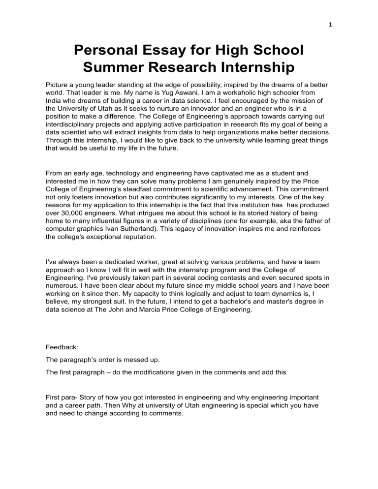 1 Personal Essay for High School Summer Research Internship Picture a young leader standing at the edge of possibility, inspired by the dreams of a better world. That leader is me. My name is Yug Aswani. I am a workaholic high schooler from India who dreams of building a career in data science. I feel encouraged by the mission of the University of Utah as it seeks to nurture an innovator and an engineer who is in a position to make a difference. The College of Engineering’s approach towards carrying out interdisciplinary projects and applying active participation in research fits my goal of being a data scientist who will extract insights from data to help organizations make better decisions. Through this internship, I would like to give back to the university while learning great things that would be useful to my life in the future. From an early age, technology and engineering have captivated me as a student and interested me in how they can solve many problems I am genuinely inspired by the Price College of Engineering's steadfast commitment to scientific advancement. This commitment not only fosters innovation but also contributes significantly to my interests. One of the key reasons for my application to this internship is the fact that this institution has has produced over 30,000 engineers. What intrigues me about this school is its storied history of being home to many influential figures in a variety of disciplines (one for example, aka the father of computer graphics Ivan Sutherland). This legacy of innovation inspires me and reinforces the college's exceptional reputation. I've always been a dedicated worker, great at solving various problems, and have a team approach so I know I will fit in well with the internship program and the College of Engineering. I've previously taken part in several coding contests and even secured spots in numerous. I have been clear about my future since my middle school years and I have been working on it since then. My capacity to think logically and adjust to team dynamics is, I believe, my strongest suit. In the future, I intend to get a bachelor's and master's degree in data science at The John and Marcia Price College of Engineering. Feedback: The paragraph’s order is messed up. The first paragraph – do the modifications given in the comments and add this First para- Story of how you got interested in engineering and why engineering important and a career path. Then Why at university of Utah engineering is special which you have and need to change according to comments. 2 Second Para- What kind of educational impact do you hope to receive from this internship? You start with describing the program saying its research and why you are interested in research what topics and how the topics research done at engineering college aligns with you and WHY are you interested in it and then say this comment I mentioned above move that to second para- how this research would impact you for example expand your skills, give you more knowledge, headstart in career and explore new topics , a great way to start university, etc. Thisrd Para- How do you envision yourself contributing to the College of Engineering while in this program and in the future? Here talk about your skills and experience- and talk about applying to u of u for bachelors and masters and puring a career in research eventually if found interesting. In this select data science, computer science, computer engineering, mechanical engineering. And use these topics as research interests as well