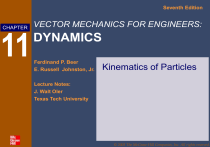 Seventh Edition CHAPTER 11 VECTOR MECHANICS FOR ENGINEERS: DYNAMICS Ferdinand P. Beer E. Russell Johnston, Jr. Kinematics of Particles Lecture Notes: J. Walt Oler Texas Tech University © 2003 The McGraw-Hill Companies, Inc. All rights reserved. Seventh Edition Vector Mechanics for Engineers: Dynamics Contents Introduction Rectilinear Motion: Position, Velocity & Acceleration Determination of the Motion of a Particle Sample Problem 11.2 Sample Problem 11.3 Uniform Rectilinear-Motion Uniformly Accelerated RectilinearMotion Motion of Several Particles: Relative Motion Sample Problem 11.4 Motion of Several Particles: Dependent Motion Sample Problem 11.5 Graphical Solution of Rectilinear-Motion Problems Curvilinear Motion: Position, Velocity & Acceleration Derivatives of Vector Functions Rectangular Components of Velocity and Acceleration Motion Relative to a Frame in Translation Tangential and Normal Components Radial and Transverse Components Sample Problem 11.10 Sample Problem 11.12 © 2002 The McGraw-Hill Companies, Inc. All rights reserved. 11 - 2 Seventh Edition Vector Mechanics for Engineers: Dynamics Introduction • Dynamics includes: - Kinematics: study of the geometry of motion. Kinematics is used to relate displacement, velocity, acceleration, and time without reference to the cause of motion. - Kinetics: study of the relations existing between the forces acting on a body, the mass of the body, and the motion of the body. Kinetics is used to predict the motion caused by given forces or to determine the forces required to produce a given motion. • Rectilinear motion: position, velocity, and acceleration of a particle as it moves along a straight line. • Curvilinear motion: position, velocity, and acceleration of a particle as it moves along a curved line in two or three dimensions. © 2002 The McGraw-Hill Companies, Inc. All rights reserved. 11 - 3 Seventh Edition Vector Mechanics for Engineers: Dynamics Rectilinear Motion: Position, Velocity & Acceleration • Particle moving along a straight line is said to be in rectilinear motion. • Position coordinate of a particle is defined by positive or negative distance of particle from a fixed origin on the line. • The motion of a particle is known if the position coordinate for particle is known for every value of time t. Motion of the particle may be expressed in the form of a function, e.g., x 6t 2 t 3 or in the form of a graph x vs. t. © 2002 The McGraw-Hill Companies, Inc. All rights reserved. 11 - 4 Seventh Edition Vector Mechanics for Engineers: Dynamics Rectilinear Motion: Position, Velocity & Acceleration • Consider particle which occupies position P at time t and P’ at t+Dt, Dx Average velocity Dt Dx v lim Instantaneous velocity Dt 0 Dt • Instantaneous velocity may be positive or negative. Magnitude of velocity is referred to as particle speed. • From the definition of a derivative, Dx dx v lim dt Dt 0 D t e.g., x 6t 2 t 3 dx v 12t 3t 2 dt © 2002 The McGraw-Hill Companies, Inc. All rights reserved. 11 - 5 Seventh Edition Vector Mechanics for Engineers: Dynamics Rectilinear Motion: Position, Velocity & Acceleration • Consider particle with velocity v at time t and v’ at t+Dt, Dv Instantaneous acceleration a lim Dt 0 Dt • Instantaneous acceleration may be: - positive: increasing positive velocity or decreasing negative velocity - negative: decreasing positive velocity or increasing negative velocity. • From the definition of a derivative, Dv dv d 2 x a lim dt dt 2 Dt 0 Dt e.g. v 12t 3t 2 a © 2002 The McGraw-Hill Companies, Inc. All rights reserved. dv 12 6t dt 11 - 6 Seventh Edition Vector Mechanics for Engineers: Dynamics Rectilinear Motion: Position, Velocity & Acceleration • Consider particle with motion given by x 6t 2 t 3 v dx 12t 3t 2 dt dv d 2 x a 12 6t dt dt 2 • at t = 0, x = 0, v = 0, a = 12 m/s2 • at t = 2 s, x = 16 m, v = vmax = 12 m/s, a = 0 • at t = 4 s, x = xmax = 32 m, v = 0, a = -12 m/s2 • at t = 6 s, x = 0, v = -36 m/s, a = 24 m/s2 © 2002 The McGraw-Hill Companies, Inc. All rights reserved. 11 - 7 Seventh Edition Vector Mechanics for Engineers: Dynamics Determination of the Motion of a Particle • Recall, motion of a particle is known if position is known for all time t. • Typically, conditions of motion are specified by the type of acceleration experienced by the particle. Determination of velocity and position requires two successive integrations. • Three classes of motion may be defined for: - acceleration given as a function of time, a = f(t) - acceleration given as a function of position, a = f(x) - acceleration given as a function of velocity, a = f(v) © 2002 The McGraw-Hill Companies, Inc. All rights reserved. 11 - 8 Seventh Edition Vector Mechanics for Engineers: Dynamics Determination of the Motion of a Particle • Acceleration given as a function of time, a = f(t): v t t dv a f t dv f t dt dv f t dt dt v 0 t v t v0 f t dt 0 0 dx v t dt dx v t dt x t t x0 0 dx vt dt t x t x0 v t dt 0 • Acceleration given as a function of position, a = f(x): v dx dx or dt dt v v dv f x dx a v x dv dv or a v f x dt dx x v dv f x dx v0 x0 © 2002 The McGraw-Hill Companies, Inc. All rights reserved. x 1 v x 2 1 v 2 f x dx 2 2 0 x0 11 - 9 Seventh Edition Vector Mechanics for Engineers: Dynamics Determination of the Motion of a Particle • Acceleration given as a function of velocity, a = f(v): dv dt f v dv a f v dt v t t dv f v dt 0 v 0 v t dv f v t v 0 dv a f v v dx v t x t x0 v0 v dv dx f v x t v t 0 0 v dv dx f v v x v dv f v © 2002 The McGraw-Hill Companies, Inc. All rights reserved. 11 - 10 Seventh Edition Vector Mechanics for Engineers: Dynamics Sample Problem 11.2 SOLUTION: • Integrate twice to find v(t) and y(t). • Solve for t at which velocity equals zero (time for maximum elevation) and evaluate corresponding altitude. Ball tossed with 10 m/s vertical velocity from window 20 m above ground. • Solve for t at which altitude equals zero (time for ground impact) an