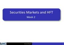 Securities Markets and HFT Week 2 Dermot Murphy 1 Introduction We continue Week 2 with a second lecture session Specifically, we will be covering the following topics: Limit Order Markets (STPP 4) Multiple/Fragmented Markets (STPP 5) We will also work through a few examples today Dermot Murphy 2 Limit Order Markets The electronic limit order market is the dominant trading mechanism for: Equities Exchange-traded futures contracts (ETFs) Options Dealer markets dominate: Foreign exchange Bonds Swaps Today, we focus on limit order markets Dermot Murphy 3 Limit Order Markets – The Basics An order has three components: Direction (Buy or Sell) Quantity Price “Buy 100 MSFT, limit 27” That is, buy 100 shares of Microsoft for no more than $27.00 per share “Sell 200 MSFT, limit 28” Sell 200 shares of Microsoft for no less than $28.00 per share Dermot Murphy 4 Limit Order Markets – The Basics If an order cannot be matched (“executed”) on arrival, it is added to the limit order book (LOB) And the limit order book is the collection of unexecuted (“resting”) orders Arriving orders are compared to the limit order book If there is a compatible counterparty order already on the book, then there is a match (i.e. a trade, an execution) Dermot Murphy 5 Limit Order Markets – The Basics The quantity of the trade is the smaller of the quantities in the two orders If “Buy 500 MSFT, limit 27” matches with an existing resting order of “Sell 300 MSFT, limit 27”, then the buyer receives 300 shares for $27.00 The match price is the limit price of the resting order If “Buy 500 MSFT, limit 27” matches with an existing resting order of “Sell 500 MSFT, limit 26”, then the buyer receives 500 shares for $26.00 Dermot Murphy 6 Limit Order Book Sample limit order book for the S&P 500 ETF (symbol: SPY) on BATS http://www.batstrading.com/book/SPY Dermot Murphy 7 Example 1 Suppose there is one bid in the book: “Buy 200 ABC, limit 20” What happens if I place the following order and what does the limit order book look like after placing that order? a) b) c) d) “Sell 200 ABC, limit 19” “Sell 50 ABC, limit 21” “Sell 50 ABC, limit 20” “Sell 500 ABC, limit 18” Dermot Murphy 8 Limit Order Book – Priority Suppose that the buy side of the book consists of five 100-share bids for MSFT with limit prices of $10 Suppose that I place the following order: “Sell 100 MSFT, limit 10”. Who gets filled? In most markets, priorities are: Price: more aggressive prices (higher bids, lower asks) get higher priority Visibility: displayed orders have priority over hidden orders Time: orders entered earlier have priority That is, most markets have price-visibility-time priority Dermot Murphy 9 Example 2 Suppose that we have the following LOB: Price Quantity Submitted Trader 50.12 1,000 9:30 Cathy 50.11 500 9:32 Bill H 50.10 200 9:30 Gina SELL 50.10 400 9:31 Amy BUY 50.05 1,000 9:30 David 50.04 500 9:32 Ellen 50.03 400 9:31 Fred Dermot Murphy 10 Example 2 What happens if Harry submits the following order? (consider each case individually) a) “Buy 200, limit 50.10” b) “Sell 1200, limit 50.04” c) “Sell 1200, limit 50.05” d) “Buy 500, limit 50.11” (note: “H” on the LOB stands for hidden order) Dermot Murphy 11 Order Modifiers/Qualifications Immediate or Cancel (IOC) Do it now or not at all Partial fill is okay, but cancel the remainder All or None (AON) Do not give me a partial fill Order held unexecuted until it can be filled in its entirety Fill or Kill (FOK) IOC + AON Execute the entire order right now. Otherwise, cancel IOC is very common; AON less common Dermot Murphy 12 Example 3 Suppose that we have the following LOB: Price Quantity Submitted Trader 50.12 1,000 9:30 Cathy 50.11 500 9:32 Bill H 50.10 200 9:30 Gina 50.10 400 9:31 Amy SELL H 50.09 100 9:29 Martin BUY 50.05 1,000 9:30 David Dermot Murphy 13 Example 3 What happens if Harry submits the following order? (consider each case individually) a) “Buy 500, limit 50.09” b) “Buy 500, limit 50.09 IOC” c) “Buy 500, limit 50.09 AON” d) “Buy 2000, limit 50.10 IOC” e) “Buy 2000, limit 50.10 FOK” Dermot Murphy 14 Limit Order Book – Access Most exchanges make their LOBs available in real time for a fee BATS provides real time LOBs for no charge Access batstrading.com during trading hours Try viewing SPY to see an extremely active LOB PRK is a good example of a less active LOB Dermot Murphy 15 Multiple/Fragmented Markets In the second half of today, we will discuss fragmented markets (STPP 5) In a fragmented market, trading occurs in multiple places or systems US equity markets, for example, have multiple trading systems and limit order books In contrast, in a consolidated market, all trading occurs in one place One trading floor at one exchange One computer system Dermot Murphy 16 Trading and Listing of US Equities The “home” for trading a stock is the issue’s primary listing exchange The exchange provides trading facilities/procedures for the stock The listing exchange, however, does not have monopoly trading rights Trading occurs in many venues, through many mechanisms Dermot Murphy 17 Volume Statistics, 9/3/2015 Listing Exchange NYSE Executing exchange Volume (shares) Percent New York 888,211,019 25.5% Chicago 32,179,766 0.9% NYSE Arca 268,314,314 7.7% Nasdaq 483,244,025 13.9% Finra/Nasdaq TRF 1,028,036,386 29.5% PSX 34,570,784 1.0% NYSE MKT Boston 64,346,462 1.8% BATS 220,062,627 6.3% BATS Y 141,654,672 4.1% EdgeA 83,144,604 2.4% EdgeX 244,826,872 7.0% Composite (total) 3,488,591,531 100.0% Dermot Murphy Nasdaq Volume (shares) Percent 4,734,313 0.3% 190,499,278 10.7% 462,893,665 26.0% 618,930,619 34.7% 22,131,465 1.2% 4,054,051 0.2% 36,566,140 2.1% 123,326,549 6.9% 74,398,173 4.2% 43,220,696 2.4% 202,827,823 11.4% 1,783,582,772 100.0% 18 Partial Key Finra/Nasdaq TRF (trade reporting facility) Reporting channel for “dark” trades A mechanism for the reporting of off-exchange transactions PSX 