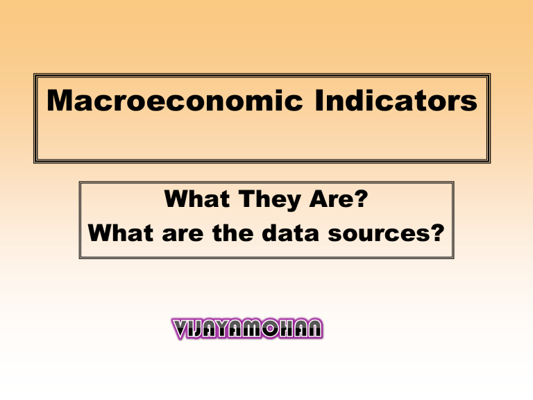Macroeconomic Indicators What They Are? What are the data sources? Macroeconomics • developments that involve the economy as a whole, such as • total output, • rates of inflation and unemployment, • balance of international payments, and • exchange rate. 2/4/2025 Vijayamohan CDS 2 Macroeconomy • Main macroeconomic indicator: • Total output of an economy from • 2 sectors: • Real and Financial 2/4/2025 Vijayamohan CDS 3 Real Sector • The sector in which there are productions of goods and services through combined utilization of raw materials and other production factors such as labour force, land and capital. • Two major markets : 1) Production factor market: raw material market, labour market, land and capital market. 2) Output market (both goods and services) 2/4/2025 Vijayamohan CDS 4 Financial Sector • Paper economy • concerned with buying and selling on the financial markets • a broad range of organizations that manage money, including • credit unions, banks, credit card companies, • insurance companies, accountancy companies, consumer finance companies, stock brokerages, investment funds and • some government sponsored enterprises. 2/4/2025 Vijayamohan CDS 5 Economic Sectors • three main sectors • primary, secondary, and tertiary. • Primary sector: makes direct use of natural resources. • Includes agriculture, forestry, fishing, mining, and extraction of oil and gas. • Secondary sector (industrial sector) : sectors that create a finished, tangible product: • Includes manufacturing and construction. • Tertiary sector (service sector) : producing services: • Includes transportation, finance, tourism, retail stores…. 2/4/2025 Vijayamohan CDS 6 Economic Sectors • Movement of goods and services through the primary, secondary, and tertiary sectors • the chain of production. • For example, • trees are sourced (primary), • then the pulp is processed to create paper (secondary), • and then the finished product is sold in stores (tertiary). 2/4/2025 Vijayamohan CDS 7 Economic Sectors • 2 more sectors • the quaternary and the quinary • The quaternary sector : • that of intellectual organization in a society such as government, research, cultural programs, information technology (IT), education, and libraries. • The quinary sector : • Top management in • non-profit organizations, media, arts, culture, higher education, science and technology, and government 2/4/2025 Vijayamohan CDS 8 Macroeconomic Indicators: Gross output • The value of all goods and services produced in the economy, whether final products or not, • and sold to consumers, foreigners, or other enterprises. • Problem of double-counting. • For example, • the value of wheat may be counted twice: • when it is sold by farmers, • and again as part of the value of bread. 2/4/2025 Vijayamohan CDS 9 Macroeconomic Indicators: Value added • The value of gross output less the value of intermediate consumption. • use value added to measure a country's output. • Only market output; • Not nonmarket output: own-account production, • such as subsistence farming and owner-occupied housing 2/4/2025 Vijayamohan CDS 10 Macroeconomic Indicators: Consumption • 2 distinct kinds: intermediate and final consumption. • Intermediate consumption : • inputs into production, • final consumption : • goods and services— • both imported and domestically produced— • used by households and the government sector. 2/4/2025 Vijayamohan CDS 11 Macroeconomic Indicators: Investment (gross capital formation) • Additions to the physical stock of capital in an economy. • Output produced during the current year but not used for present consumption. • Investment in the macroeconomic sense includes • the building of machinery, factories, and houses and changes in inventories. • Inventories of finished goods and work in progress only. • Inventories of intermediate inputs are not included 2/4/2025 Vijayamohan CDS 12 Macroeconomic Indicators: Depreciation • used to differentiate net from gross investment • sometimes called the consumption-affixed capital. • Since capital stock wears out over time, depreciation, or the cost of replacing the capital used up during a period, is subtracted from gross investment to derive net investment. • Net investment = Gross investment - Depreciation. • Net investment more accurate measure of the addition to productive capacity than gross investment. 2/4/2025 Vijayamohan CDS 13 Macroeconomic Indicators: Net exports • equal to the value of exports of goods and services less the value of imports of goods and services, • used to measure the impact of foreign trade on aggregate demand. • Net exports are a component of the total demand for domestic goods and services • plays an important role in determining GDP. 2/4/2025 Vijayamohan CDS 14 Macroeconomic Indicators: Inflation • a persistent increase in the general price level of goods and services in an economy over a period of time. • reflects a reduction in the purchasing power per unit of money – a loss of real value in the medium of exchange and unit of account within the economy. • Central to LT interest rates • A chief measure of price inflation is the inflation rate, the annualized percentage change in a general price index. 2/4/2025 Vijayamohan CDS 15 Macroeconomic Indicators: Interest rates • Rate at which interest is paid by a borrower (debtor) for the use of money that they borrow from a lender (creditor). • Comparing economies and returns in other currencies. 2/4/2025 Vijayamohan CDS 16 Quantity Aggregates • To understand the macroeconomy, we need to measure it. Chief measure of economy is the level of production • We need to combine the many goods produced or consumed in an economy into one measure. + + + + =? 2/4/2025 Vijayamohan CDS 17 All goods sold in an economy share a common unit of measure: the price at which they are 