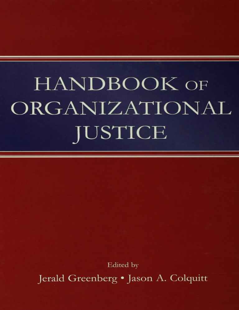 Handbook of Organizational Justice Handbook of Organizational Justice Jerald Greenberg The Ohio State University Jason A. Colquitt University of Florida n=A Lawrence Erlbaum Associates ~ Taylor s, Francis Group New York l ondon Copyright © 2005 by Lawrence Erlbaum Associates, Inc. All rights reserved. No part of this book may be reproduced in any form, by photostat, microform, retrieval system, or any other means, without prior written permission of the publisher. Cover design by Kathryn Houghtaling Lacey Library of Congress Cataloging-in-Publication Data Handbook of organizational justice / edited by Jerald Greenberg, Jason Colquitt. p. cm. Includes bibliographical references and index. ISBN 0-8058-4203-9 (cloth: alk. paper) 1. Organizational justice. I. Greenberg, Jerald. II. Colquitt, Jason. HD6971.3.H36 2005 658.3'I4-dc22 20040564220 CIP Books published by Lawrence Erlbaum Associates are printed on acidfree paper, and their bindings are chosen for strength and durability. Printed in the United States of America 10 9 8 7 6 5 4 3 2 To Carolyn. Nothing in this book even begins to capture yourfairness. -J.G. To Catherine. For all those late nights keeping me company as I wrote about this subject. -J. A. C. Contents Preface xi About the Contributors xv Part I Introduction 1 What Is Organizational Justice? A Historical Overview Jason A. Colquitt, Jerald Greenberg, and Cindy P. Zapata-Phelan 3 Part II Construct Validity Issues 2 Are Procedural Justice and Distributive Justice Conceptually Distinct? 59 Maureen L. Ambrose and Anke Arnaud 3 Are Procedural Justice and Interactional Justice Conceptually Distinct? 85 Robert J. Bies 4 How Should Organizational Justice Be Measured? Jason A. Colquitt and John C. Shaw Part III 113 The Justice Judgment Process 5 What Is the Role of Control in Organizational Justice? Debra L. Shapiro andJeanne M. Brett 155 vii viii CONTENTS 6 Are the Goals of Organizational Justice Self-Interested? 179 Jennifer Z. Gillespie and Jerald Greenberg 7 What Is the Relationship Between Justice and Morality? 215 Robert Folger, RussellCropanzano, and Barry Goldman 8 What Is the Role of Trust in Organizational Justice? Roy J. Lewicki, Carolyn Wiethoff, and Edward C. Tomlinson Part IV 247 Justice Effects 9 What Is Responsible for the Fair Process Effect? 273 10 How Does Organizational Justice Affect Performance, 301 Kees Van den Bos Withdrawal, and Counterproductive Behavior? Donald E. Conlon, Christopher J. Meyer, andJadyn M. Nowakowski 11 How Can Theories of Organizational Justice Explain the Effects of Fairness? 329 Steven L. Blader and Tom R. Tyler 12 How Does Organizational Justice Affect Organizational Citizenship Behavior? 355 Robert H. Moorman and Zinta S. Byrne Part V Justice Applications 13 How Can Justice Be Used to Manage Stress in Organizations? 383 Riel Vermunt and Herman Steensma 14 How Can Justice Be Used to Improve Employee Selection Practices? 411 Stephen W. Gilliland and JeffM. S. Hale 15 How Do Organizational Justice Concepts Relate to Discrimination and Prejudice? Eugene F. Stone-Romero and Dianna L. Stone 439 ix CONTENTS 16 How Can Explanations Be Used to Foster Organizational Justice? 469 D. Ramona Bobocel and Agnes Zdaniuk 17 How Can Training Be Used to Foster Organizational Justice? 499 Daniel P. Skarlicki and Gary P. Latham Part VI Generalizability Issues 18 How, When, and Why Does Outcome Favorability Interact with Procedural Fairness? 525 Joel Brockner and Batia Wiesenfeld 19 How Generalizable Are Justice Effects Across Cultures? Kwok Leung Part VII 555 Integration 20 Organizational Justice: Where Do We Stand? Jason A. Colquitt, Jerald Greenberg, and Brent A. Scott 589 Author Index 621 Subject Index 641 Preface Visit any place where people work and ask individuals how they feel about their organizations-their jobs, bosses, coworkers, pay, working conditions, company policies-things in general. What do they like? What annoys them? In short order, the conversation inevitably will turn to issues of fairness and unfairness. Some may proclaim, "You always get a fair shake around here," or "They treat you pretty good," whereas others may grouse, "1 don't get paid enough," or "Someone's always out to get you." The attitudes underlying these remarks reflect concerns about fairness, or lack thereof. As these comments suggest, matters of perceived fairness-or justice, a term with which it is used interchangeably by most social scientists (including the contributors to this book)-run deep in the workplace. Workers are concerned about being treated fairly by their supervisors, managers generally are interested in treating their direct reports fairly, and everyone is concerned about what happens when these expectations are violated. All of this is the stuff of which this book is made-the topic of organizational justice-defined as people's perceptions of fairness in organizations. Matters of justice arise in all life contexts. Spouses insist on being treated fairly by their partners. Athletes demand "a level playing field." And, of course, litigants seek justice in the courtroom. Although these are interesting and important venues, to be sure, there appears to be something unique about the workplace that gives concerns about justice such a prominent place on people's minds. Perhaps it's that the metrics for assessing justice in the workplace are operationalized routinely by naturally occurring differences in pay and work conditions, as well as differential job performance. Similarly, justice concerns are likely to be triggered on the job by the existence of formal procedures that mandate what to do, whether monumental, such as deciding whose jobs are xi xii PREFACE to eliminate, or mundane, such as when and where rest breaks may be taken. And, of course, the fact that people spend approximately half their waking hours in close interaction with others also may be sufficient to trigger sensitivities about the propriety of their interpersonal treatment. For these reas