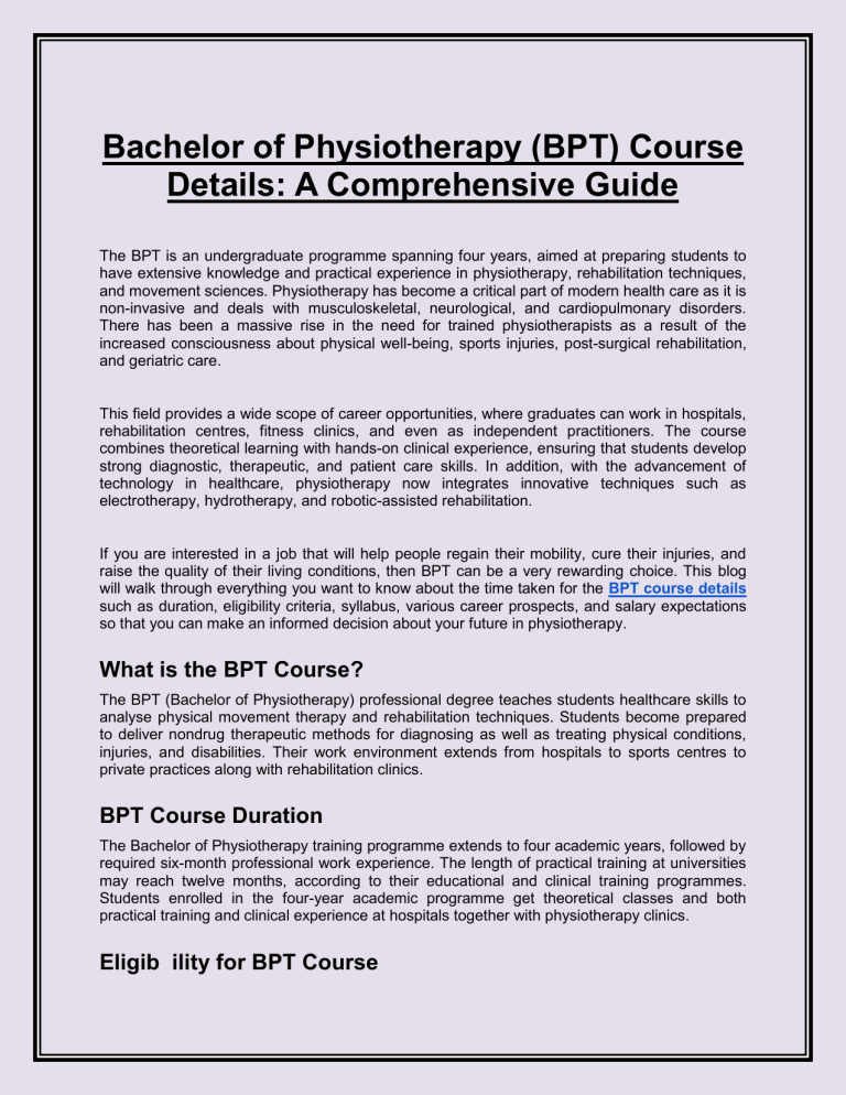 Bachelor of Physiotherapy (BPT) Course Details: A Comprehensive Guide The BPT is an undergraduate programme spanning four years, aimed at preparing students to have extensive knowledge and practical experience in physiotherapy, rehabilitation techniques, and movement sciences. Physiotherapy has become a critical part of modern health care as it is non-invasive and deals with musculoskeletal, neurological, and cardiopulmonary disorders. There has been a massive rise in the need for trained physiotherapists as a result of the increased consciousness about physical well-being, sports injuries, post-surgical rehabilitation, and geriatric care. This field provides a wide scope of career opportunities, where graduates can work in hospitals, rehabilitation centres, fitness clinics, and even as independent practitioners. The course combines theoretical learning with hands-on clinical experience, ensuring that students develop strong diagnostic, therapeutic, and patient care skills. In addition, with the advancement of technology in healthcare, physiotherapy now integrates innovative techniques such as electrotherapy, hydrotherapy, and robotic-assisted rehabilitation. If you are interested in a job that will help people regain their mobility, cure their injuries, and raise the quality of their living conditions, then BPT can be a very rewarding choice. This blog will walk through everything you want to know about the time taken for the BPT course details such as duration, eligibility criteria, syllabus, various career prospects, and salary expectations so that you can make an informed decision about your future in physiotherapy. What is the BPT Course? The BPT (Bachelor of Physiotherapy) professional degree teaches students healthcare skills to analyse physical movement therapy and rehabilitation techniques. Students become prepared to deliver nondrug therapeutic methods for diagnosing as well as treating physical conditions, injuries, and disabilities. Their work environment extends from hospitals to sports centres to private practices along with rehabilitation clinics. BPT Course Duration The Bachelor of Physiotherapy training programme extends to four academic years, followed by required six-month professional work experience. The length of practical training at universities may reach twelve months, according to their educational and clinical training programmes. Students enrolled in the four-year academic programme get theoretical classes and both practical training and clinical experience at hospitals together with physiotherapy clinics. Eligib ility for BPT Course To be admitted into a BPT (Bachelor of Physiotherapy) course, candidates need to satisfy certain eligibility criteria. According to the chosen institute, the BPT course eligibility differs, but they are mostly based on the following eligibility criteria: Educational Qualification: A candidate has successfully passed 10+2 from a recognised board. They have done their study in PCB as compulsory subjects. The minimum aggregate score of 50% to 60% in the 12th grade varies according to the institution. Entrance Exams Some universities carry out entrance examinations for BPT admissions, and others admit on merit in 10+2 examinations. The common entrance tests for BPT are IPU CET, NEET, JIPMER, and BCECE. Age: Most BPT courses have an age limit of 17 years. Some universities may have an upper age limit for admission. BPT Course Fees The BPT course fees differ with the type of institution (government or private) and location. Here's an approximate breakdown: Government Colleges: INR 30,000 – 1,00,000 per year Private Colleges: INR 1,00,000 – 5,00,000 per year International Universities: Fees can go up to $20,000 – $50,000 per year Examination fees, laboratory charges, and clinical training expenses might be added. Subjects and Syllabus in BPT The BPT syllabus focuses on the in-depth exploration of human anatomy, physiology, and a wide range of physiotherapy techniques. Some of the major subjects taught are as follows: Year 1: Human Anatomy Human Physiology Biochemistry Psychology Sociology Basic Nursing Year 2: Pathology Pharmacology Microbiology Exercise Therapy Electrotherapy Year 3: General Medicine General Surgery Orthopedics and Traumatology Neurology and Neurosurgery Community Medicine Year 4: Physiotherapy in Orthopedics Physiotherapy in Neurology Physiotherapy in Cardio-Respiratory Conditions Rehabilitation Research Methodology After the BPT academic session, students are sent to hospitals and rehabilitation centres for six months to perform the clinical internship. Career Options after BPT Upon successful completion of the Bachelor of Physiotherapy course, candidates can look forward to numerous options in the healthcare sector. A few of the most prominent positions include: Physiotherapists – They may work in a hospital, clinic, or in private practice. Rehabilitation Specialist – This includes patients suffering from injury or surgery. Sports Physiotherapist – Deals with sports injury prevention and rehabilitation of athletes. Neurological Physiotherapist – Helps patients suffering from neurological disorders. Cardiopulmonary Physiotherapists – They specialise in cardiac and respiratory ailments. Academician or Lecturer – They teach BPT students in different universities. Researcher – Studies in physiotherapy and rehabilitation. Higher Studies After BPT They may advance their professional careers further after BPT as follows: Master of Physiotherapy (MPT)- Specialisation would be available in orthopaedic, neurological, cardiopulmonary, and sports physiotherapy. MBA in Healthcare Management– These are for people who want to work in hospitals, their management, and their administration. Doctor of Physiotherapy (DPT)– Doctoral programme in some countries. MPT in Musculoskeletal Sciences is also another option after BPT. Salary and Job Prospects The salary of the BPT graduate is on the basis of experience, sp