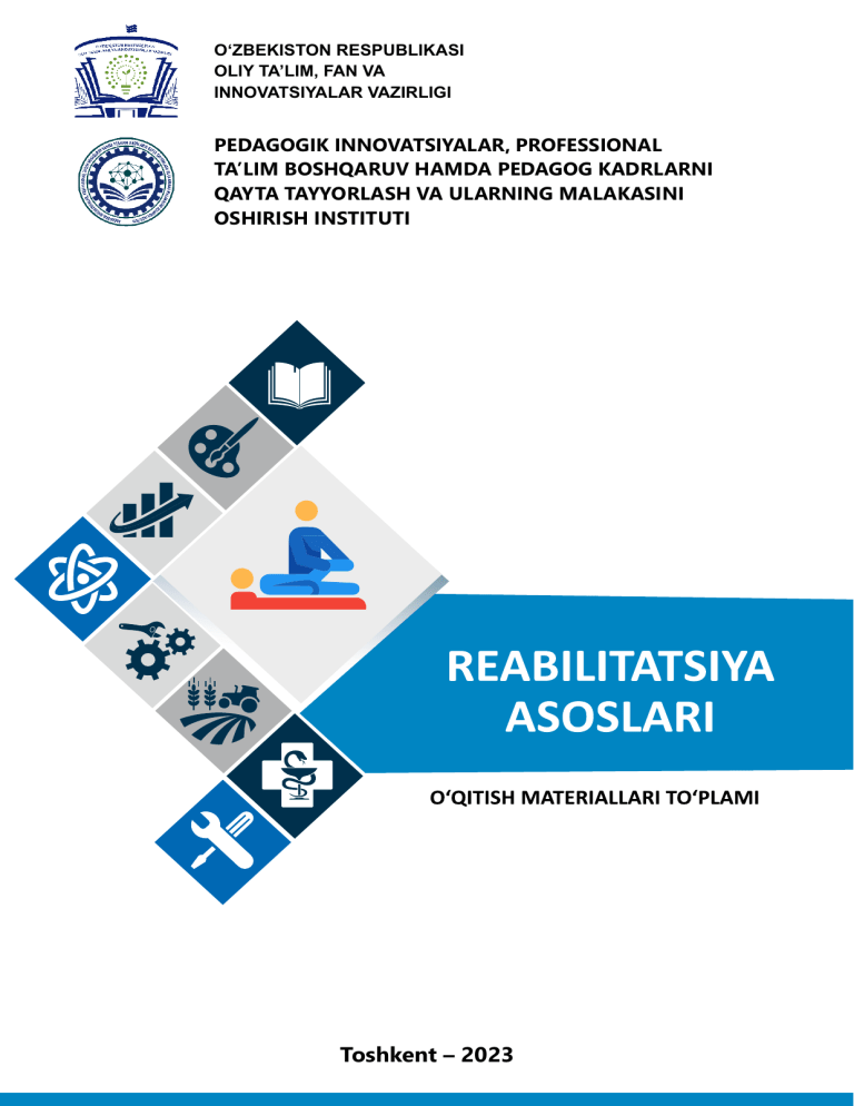 O‘ZBEKISTON RESPUBLIKASI OLIY TA’LIM, FAN VA INNOVATSIYALAR VAZIRLIGI PEDAGOGIK INNOVATSIYALAR, PROFESSIONAL TA’LIM BOSHQARUV HAMDA PEDAGOG KADRLARNI QAYTA TAYYORLASH VA ULARNING MALAKASINI OSHIRISH INSTITUTI Toshkent – 2023 O’ZBEKISTON RESPUBLIKASI OLIY TA’LIM FAN VA INNOVATSIYALAR VAZIRLIGI O’ZBEKISTON RESPUBLIKASI SOG’LIQNI SAQLASH VAZIRLIGI ANDIJON VILOYATI KASBIY TA’LIMNI RIVOJLANTIRISH VA MUVOFIQLASHTIRISH HUDUDIY BOSHQARMASI XO’JAOBOD TIBBIYOT KOLLEJI “TASDIQLAYMAN” Xo’jaobod tibbiyot kolleji direktori _____ O.N.Temirxo’jaeva ” 17 ”oktyabrdagi 2022 yil REABLITATSIYA ASOSLARI fanidan O’QITISH MATERIALLARI Tayorlov yo’nalishi: Tayyorlov yo’nalishi – 09102.00 - Hamshiralik ishi Kasbi: 40.910203 – Hamshiralik ishi Pedagog kengashning 2022-yildagi “2” -sonli yig’ilishida o’quv jarayoniga qo’llashga tavsiya etildi Me’yoriy hujjatlar to’plami fanlar kafedrasining 2022-yildagi “3” - sonli Yig’ilishida muhokama etildi va ma’qullandi Uslubchi _____ Tojieva.M Kafedra mudiri _____ D.Qodirova O’qituvchi: _____ M.Pratov To’plamning muallifi to’g’risida ma’lumot Pratov Muhammadg’ulom Ma’lumoti: Oliy Mutaxassisligi: Pediatriya ishi Pedagogik ish staji: 25 yil Ish joyi: Xo’jaobod tibbiyot kolleji Elektron pochta manzili: Pratov@gmail.com Telefon raqami: +998905497528 O’qitish materiallari to’plami tarkibi To’plam tarkibi 1)Taqvimiy mavzular reja 2)Faning ta’lim texnologiyasi 3)Mavzular to’plami Shakli Jadval 4)Baxolash vositalar Matn jadval 5)Vizual - didaktik resurslar Nusxa(PDF) Yozma(CD VVord Xo’jaobod tibbiyot kolleji o’qituvchisi M.Pratovning 2022-2023 o`quv yili 1-bosqich uchun “ Reablitatsiya asoslari “ fanidan TAQVIМIY МAVZULAR REJASI Uмuмiy ajratilgan vaqt (soat) № 1. 2. Мutahassislik va guruhlar Hamshiralik ishi22-16,22-17 Davolash ishi-2214 Haммasi Auditoriyadagi Jaмi Nazariy Aмaliy 136 90 30 60 46 136 90 30 60 46 Laboratoriya Kursishi Taqviмiy мavzular rejasi “Hamshiralik ishi “ kafedrasining 2022 yil “17” oktyabrdagi 3-sonli yig`ilishida мuhokaмa etilib мa`qullandi. Uslubchi: M.Tojieva ________ Seмinar Мustaqil ish Guruhlar va sana T/r Mavzu nomi Jami O’qitish ning tashkili y qismi 1 2 3 4 1 2 3 Reablitatsiya va mehnat bilan davolash fani”maqsad va vazifalari.Reablitatsiyani olib borishda tibbiy ijtimoiy xodimning tutgan o’rni Reablitatsiya turlari.Reablitatsiyani olib borishda tibbiy ijtimoiy xodimning tutgan o’rni 2 Mustaqil ta’lim 5 3-semestr Nazariy Nazariy 2-soat-Reablitatsiya fanini internet saytlaridan yangi ma’lumotlar yig’ish O’quvchilarning bilim va ko’nikmalarini baholash 6 Boshlang’ich nazorat: Yozma, Savol javob, test. Nazariy 2 Kinematika asoslari Nazariy 2 2-soat-Mavzu bo’yicha ma’lumotlar ni tarqatma savollar tuzib chiqish Baholashvositalari; vizualdidaktikresurslar. Yozma, og’zaki, savol-javob. 2-soat-Xarakatlanish tizimi va ullarning faoliyati tuzilishi xaqida Baholashvositalari; vizualdidaktikresurslar. 7 savollar tayyorlash Kasalliklar va xarakatni chegaralanishi. 4 Nazariy 2 5 Katta kasalliklarida reablitatsiyasi. yoshdagilar bemorlar 6 Yurak qon tomir sistemasi kasalliklarida reablitatsiyani olib borish. Nazariy 8 Nafas organlari kasalliklarida reablitatsiyani olib borish 2-soat-Mavzuga oid test sovolar tuzish 2 Nazariy 2 Bolalar kasalliklarida reablitatsiya asoslari 7 Sport va badantarbiya mashqlarinig turlari xaqida ma’lumot tayyorlash 2-soat-Katta yoshdagilar oarsida qanday kasalliklar uchrashi xaqida savolar tuzish Nazariy 2 2-soat-Mavzuga oid nazorat savollar tayyorlash 2 2-soat-Nafas oarganlari orqali yuquvchi kasalliklar turlari xaqida ma’lumot to’plash Nazariy Yozma, og’zaki, savol-javob.. Baholashvositalari; vizualdidaktikresurslar. Yozma, og’zaki, savol-javob. Baholashvositalari; vizualdidaktikresurslar. Yozma, og’zaki, savol-javob. Baholashvositalari; vizualdidaktikresurslar. Yozma, og’zaki, savol-javob. Baholashvositalari; vizualdidaktikresurslar. Yozma, og’zaki, savol-javob. Baholashvositalari; vizualdidaktikresurslar. Yozma, og’zaki, savol-javob. Fizioterapiya bo’limini ishini tashkil etish 9 Nazariy 2 2-soat-Mavzuga oid tarqatma savollar tayyorlash Baholashvositalari; vizualdidaktikresurslar. Yozma, og’zaki, savol-javob 4-semestr Nazariy 10 Elektr bilan davolash.Ultratovush bilan davolash 2 Ultratovush apparatlaridan foydalanish usullarini bilish. 11 Nazariy 1-soat-Elektr toki bilan davolash asosan qaysi kasaliklarda qo’llanilishi bo’yicha savollar tayyorlash Nazariy 2 1-soat-UTT tekshiruvlarini afzaliklari bo’yicha referat tayyorlash Baholashvosit alari; -vizualdidaktikresursl ar. Yozma, og’zaki, savoljavob, test, amaliy Baholashvosita lari; -vizualdidaktikresursl ar. Yozma, og’zaki, savoljavob, test, amaliytopshiriq . Yorug’lik bilan davolash Quyosh,xavo va suv bilan davolash 12 Nazariy 2 Issiqlik va ingalyatsiya bilan davolash.Balchiq,qum,loy va paraffin bilan davolash 13 14 1-soat-Yorug’likdan qaysi xolatlarda qo’llanilishi bo’yicha ma’lumot to’plash Nazariy 1-soat-Ingalyatsiya usullari,parafindan foydalanish usullari xaqida ma’lumot to’plash 2 Davolash fiskulturasining umumiy asoslari.O’rta yoshdagi,qari odamlar,nimjon va bemor bolalar uchun davo fiskulturasi. Nazariy 2 1-soat-Sport va badantarbiya turlari va uning afzalliklari xaqida referat tayyorlash Baholashvosita lari; -vizualdidaktikresursl ar. Yozma, og’zaki, savoljavob, test, amaliytopshiriq . Baholashvosita lari; -vizualdidaktikresursl ar. Yozma, og’zaki, savoljavob, test, amaliytopshiriq . Baholashvosita lari; -vizualdidaktikresursl ar. Yozma, og’zaki, savoljavob, test, amaliytopshiriq . Massaj.Massajning organizimga fiziologik ta’siri.Massaj usulari.tananing ayrim qisimlari 15 uchun massaj. Nazariy 1-soat-Massaj uchun ko’rsatmalar qanday shular bo’yicha ma’lumot to’plash 2 Baholashvosita lari; -vizualdidaktikresursl ar. Yozma, og’zaki, savoljavob, test, amaliytopshiriq