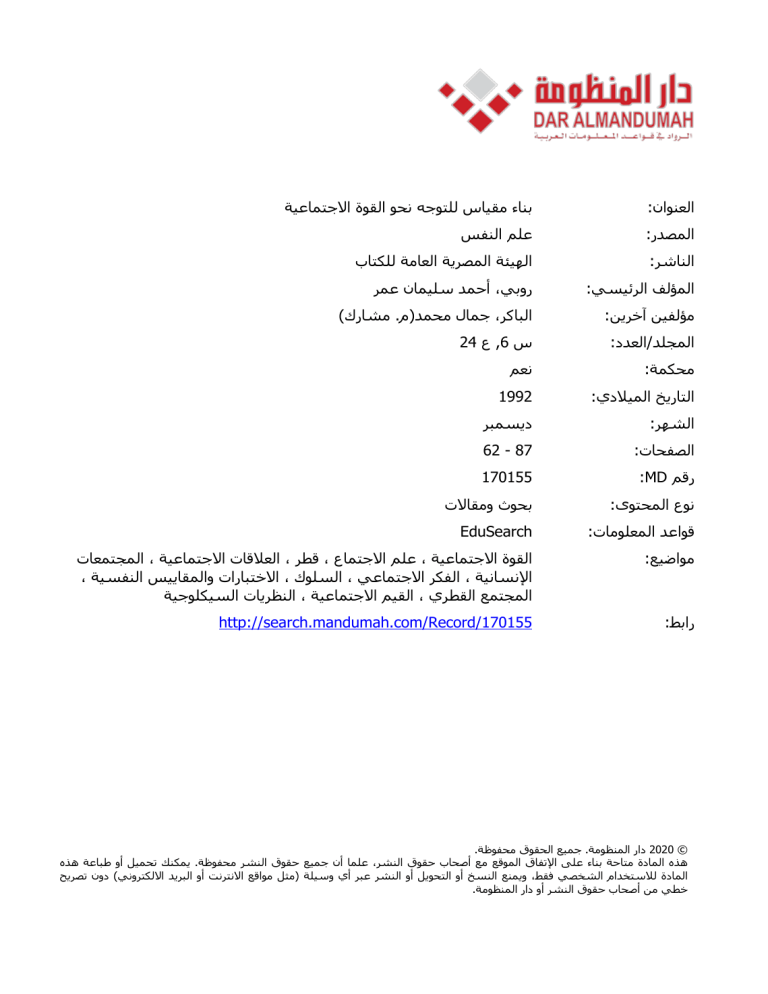 ﺍﻟﻌﻨﻮﺍﻥ: ﺑﻨﺎﺀ ﻣﻘﻴﺎﺱ ﻟﻠﺘﻮﺟﻪ ﻧﺤﻮ ﺍﻟﻘﻮﺓ ﺍﻻﺟﺘﻤﺎﻋﻴﺔ ﺍﻟﻤﺼﺪﺭ: ﻋﻠﻢ ﺍﻟﻨﻔﺲ ﺍﻟﻨﺎﺷﺮ: ﺍﻟﻬﻴﺌﺔ ﺍﻟﻤﺼﺮﻳﺔ ﺍﻟﻌﺎﻣﺔ ﻟﻠﻜﺘﺎﺏ ﺍﻟﻤؤﻟﻒ ﺍﻟﺮﺋﻴﺴﻲ: ﺭﻭﺑﻲ ،ﺃﺣﻤﺪ ﺳﻠﻴﻤﺎﻥ ﻋﻤﺮ ﻣؤﻟﻔﻴﻦ ﺁﺧﺮﻳﻦ: ﺍﻟﺒﺎﻛﺮ ،ﺟﻤﺎﻝ ﻣﺤﻤﺪ)ﻡ .ﻣﺸﺎﺭﻙ( ﺍﻟﻤﺠﻠﺪ/ﺍﻟﻌﺪﺩ: ﺱ ,6ﻉ 24 ﻣﺤﻜﻤﺔ: ﻧﻌﻢ ﺍﻟﺘﺎﺭﻳﺦ ﺍﻟﻤﻴﻼﺩﻱ: 1992 ﺍﻟﺸﻬﺮ: ﺩﻳﺴﻤﺒﺮ ﺍﻟﺼﻔﺤﺎﺕ: 62 - 87 ﺭﻗﻢ :MD 170155 ﻧﻮﻉ ﺍﻟﻤﺤﺘﻮﻯ: ﺑﺤﻮﺙ ﻭﻣﻘﺎﻻﺕ ﻗﻮﺍﻋﺪ ﺍﻟﻤﻌﻠﻮﻣﺎﺕ: EduSearch ﻣﻮﺍﺿﻴﻊ: ﺍﻟﻘﻮﺓ ﺍﻻﺟﺘﻤﺎﻋﻴﺔ ،ﻋﻠﻢ ﺍﻻﺟﺘﻤﺎﻉ ،ﻗﻄﺮ ،ﺍﻟﻌﻼﻗﺎﺕ ﺍﻻﺟﺘﻤﺎﻋﻴﺔ ،ﺍﻟﻤﺠﺘﻤﻌﺎﺕ ﺍﻹﻧﺴﺎﻧﻴﺔ ،ﺍﻟﻔﻜﺮ ﺍﻻﺟﺘﻤﺎﻋﻲ ،ﺍﻟﺴﻠﻮﻙ ،ﺍﻻﺧﺘﺒﺎﺭﺍﺕ ﻭﺍﻟﻤﻘﺎﻳﻴﺲ ﺍﻟﻨﻔﺴﻴﺔ ، ﺍﻟﻤﺠﺘﻤﻊ ﺍﻟﻘﻄﺮﻱ ،ﺍﻟﻘﻴﻢ ﺍﻻﺟﺘﻤﺎﻋﻴﺔ ،ﺍﻟﻨﻈﺮﻳﺎﺕ ﺍﻟﺴﻴﻜﻠﻮﺟﻴﺔ ﺭﺍﺑﻂ: http://search.mandumah.com/Record/170155 © 2020ﺩﺍﺭ ﺍﻟﻤﻨﻈﻮﻣﺔ .ﺟﻤﻴﻊ ﺍﻟﺤﻘﻮﻕ ﻣﺤﻔﻮﻇﺔ. ﻫﺬﻩ ﺍﻟﻤﺎﺩﺓ ﻣﺘﺎﺣﺔ ﺑﻨﺎﺀ ﻋﻠﻰ ﺍﻹﺗﻔﺎﻕ ﺍﻟﻤﻮﻗﻊ ﻣﻊ ﺃﺻﺤﺎﺏ ﺣﻘﻮﻕ ﺍﻟﻨﺸﺮ ،ﻋﻠﻤﺎ ﺃﻥ ﺟﻤﻴﻊ ﺣﻘﻮﻕ ﺍﻟﻨﺸﺮ ﻣﺤﻔﻮﻇﺔ .ﻳﻤﻜﻨﻚ ﺗﺤﻤﻴﻞ ﺃﻭ ﻃﺒﺎﻋﺔ ﻫﺬﻩ ﺍﻟﻤﺎﺩﺓ ﻟﻼﺳﺘﺨﺪﺍﻡ ﺍﻟﺸﺨﺼﻲ ﻓﻘﻂ ،ﻭﻳﻤﻨﻊ ﺍﻟﻨﺴﺦ ﺃﻭ ﺍﻟﺘﺤﻮﻳﻞ ﺃﻭ ﺍﻟﻨﺸﺮ ﻋﺒﺮ ﺃﻱ ﻭﺳﻴﻠﺔ )ﻣﺜﻞ ﻣﻮﺍﻗﻊ ﺍﻻﻧﺘﺮﻧﺖ ﺃﻭ ﺍﻟﺒﺮﻳﺪ ﺍﻻﻟﻜﺘﺮﻭﻧﻲ( ﺩﻭﻥ ﺗﺼﺮﻳﺢ ﺧﻄﻲ ﻣﻦ ﺃﺻﺤﺎﺏ ﺣﻘﻮﻕ ﺍﻟﻨﺸﺮ ﺃﻭ ﺩﺍﺭ ﺍﻟﻤﻨﻈﻮﻣﺔ. Powered by TCPDF (www.tcpdf.org)