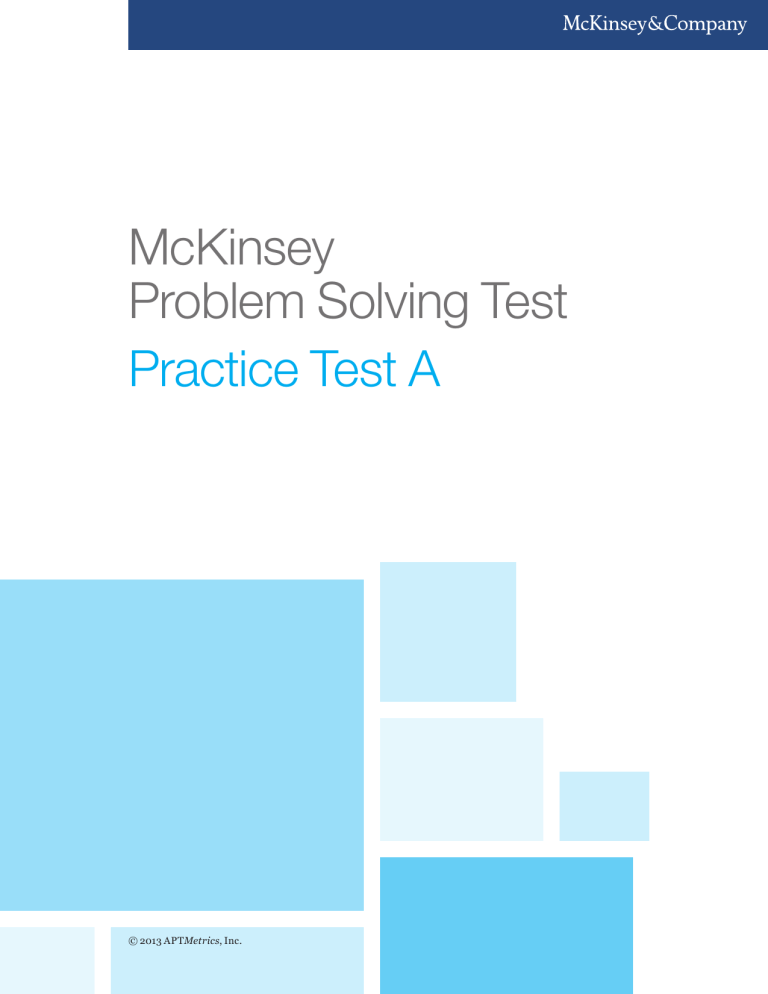 McKinsey Problem Solving Test Practice Test A © 2013 APTMetrics, Inc. 1 Instructions McKinsey Problem Solving Test Practice Test Overview and Instructions This practice test has been developed to provide a sample of the actual McKinsey Problem Solving Test used for selection purposes. This test assesses your ability to solve business problems using deductive, inductive, and quantitative reasoning. This practice test contains a total of 26 questions. The actual test contains 26 questions and you will be given 60 minutes to answer as many questions as possible. You will be presented with three scenarios based on actual McKinsey client cases. Information related to each scenario will be shown in text, tables, and exhibits. This information is presented in shaded areas and is distributed in sections throughout the scenario. The questions ask you to find the most appropriate answer to the problem as described using only the information presented. You should select one and only one answer to any question. While completing this practice test, do not use any electronic devices (e.g., calculator, computer) when performing calculations to answer the questions. Electronic devices will not be permitted to be used during the actual test administration. Also during the actual test administration, you may use all blank space in the test booklet as scratch paper to assist you in performing any calculations and recording any notes. No scratch paper will be allowed. Booklets will be destroyed after you complete the test and will not be used in any way to determine your test scores. Your final test score will be based on the number of questions you answer correctly. The practice scenarios begin on the next page of this booklet. Only consider information contained within the scenario when determining your answer. Considering all information presented within the scenario is critical to answering questions correctly. After you have completed the test, score your answers using the answer key located at the end of this booklet. Add the number of correct answers to determine your final total score. 2 Innovation Capital Innovation Capital The Group of Eight or G8 is a group comprised of political representatives of eight of the world’s largest eleven economies: United States, United Kingdom, Canada, Germany, France, Italy, Japan and Russia. The G8 meet periodically to discuss issues of importance to member states and agree upon measures to address these issues. The countries that comprise the G8 have been experiencing slow economic growth in recent years, and this is an important topic to be discussed at the next meeting of G8 Finance Ministers. In preparation for this meeting, a McKinsey team, working together with a group of external thought leaders and academics, are preparing a report on the importance of Innovation as a contributor to economic growth. The team intends to introduce a concept to the G8 representatives known as ‘Innovation Capital’, which is the value of all innovation-related assets which contribute to growth in productivity in the economy. The team further defines three types of Innovation Capital: Physical Capital: Investments in information and communication equipment Knowledge Capital: Investments that build the intellectual property and brand value of a company or organization Human Capital: Investments that build individual or group abilities and skills within companies or organizations Exhibit 1 shows the main components of Innovation Capital and their total value across 16 countries that the team has been studying, including the members of the G8. Exhibit 1 Total innovation capital, (US$ trillions) Information and communications infrastructure Computerized information Scientific research and development Other research and development Advertising and market research Education Employee development Organizational development Total 2.2 1.2 3.2 3.3 0.6 1.1 0.7 1.5 13.8 3 Innovation Capital 1. Which of the following MOST accurately describes the reason for the team’s work in preparing for the G8 meeting? A. The team has discovered a new economic measure known as Innovation Capital and wants to introduce it B. The team wants to explain how Innovation can drive economic growth C. The team wants to explain how Innovation can represent a large proportion of an economy’s size D. The team wants to convince the group to invest more in Innovation Capital in the future 2. Which of the following analyses would be LEAST appropriate in better understanding the size of investments in Innovation Capital in the countries the team has been studying? A. Analysis of expenditure by organizations on training programs for their employees B. Analysis of expenditure by organizations on activities which build awareness of their aims and purpose C. Analysis of expenditure by organizations on networking and socialization meetings and events D. Analysis of expenditure by organizations on the management of their databases and information systems 3. Which of the following can be concluded based on the information provided in Exhibit 1 regarding the countries being studied? A. 45% of all Human Capital is invested in Organizational Development B. 51% of all Innovation Capital is Knowledge Capital C. More than 10% of Innovation Capital is invested in Computerized Information D. More than a quarter of Innovation Capital is Scientific Research & Development 4 Innovation Capital 4. If total Innovation Capital in Exhibit 1 were to grow by 5% per year in the future, which of the following would be the MINIMUM required annual growth in Human Capital that would see it represent more than half of total Innovation Capital in 10 years? A. 10% B. 15% C. 20% D. 25% The team proceeds to examine changes in business sector growth in a number of European countries in recent years, that is, the change in the total value of goods and services produced by the business sectors in these countries. Growth in the value of goods and se