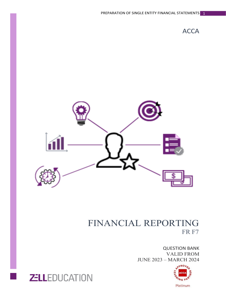 PREPARATION OF SINGLE ENTITY FINANCIAL STATEMENTS 1 ACCA FINANCIAL REPORTING FR F7 QUESTION BANK VALID FROM JUNE 2023 – MARCH 2024 PREPARATION OF SINGLE ENTITY FINANCIAL STATEMENTS 2 Name Year Question page number Answer page number Preparation of Single Entity Financial Statements Print Co Mims Co London Co Vernon Duggan Haverford Triage Moston Clarion Kandy Xtol Moby Atlas Quincy Fresco Keystone Highwood Dune Pricewell Candel Mar/Jun 2022 Sept/Dec 2021 Sept/Dec 2020 Mar/Jun 2019 Sept/Dec 2018 Mar/Jun 2018 Sept 2016 Sept/Dec 2015 Jun 2015 Dec 2014 Jun 2014 Dec 2013 Jun 2013 Dec 2012 Jun 2012 Dec 2011 Jun 2011 Jun 2010 Jun 2009 Dec 2008 5 6 8 9 11 13 15 17 19 21 22 24 26 28 30 32 34 35 37 39 139 142 143 147 149 153 156 161 164 167 170 173 177 180 183 186 189 193 197 202 Statement of Cash Flows Kingdom Monty Coaltown Dec 2013 Jun 2013 Jun 2009 41 43 45 204 208 213 Business Combination Gold Pink Co Jogger Pirlo Co Party Co Dargent Co Luarel Palister Bycomb Plastik Panketh Polestar Mar/Jun 2021 Mar/Jun 2020 Sept/Dec 2019 Mar/Jun 2019 Sept/Dec 2017 Mar/Jun 2017 Dec 2016 Sept/Dec 2015 Jun 2015 Dec 2014 Jun 2014 Dec 2013 48 50 51 53 55 57 59 61 63 65 67 69 219 221 224 227 229 232 235 237 240 243 245 249 PREPARATION OF SINGLE ENTITY FINANCIAL STATEMENTS 3 Paradigm Viagem Pyramid Paladin Prodigal Premier Picant Pandar Pedantic Patronic Jun 2013 Dec 2012 Jun 2012 Dec 2011 Jun 2011 Dec 2010 Jun 2010 Dec 2009 Dec 2008 Jun 2008 71 73 75 77 79 81 82 85 86 88 253 256 259 263 266 271 274 277 280 283 Analysing Financial Statement Venus Co Pinardi Co Pastry Karl Co Fit Co Bun Co Duke Perkins Mowair Funject Co Landing Gregory Xpand Yogi Hydan Woodbank Quartile Bengal Hardy Victular Pinto Harbin Mar/Jun 2022 Sept/Dec 2021 March/June 2021 Sept/Dec 2020 Mar/Jul2020 Sept/Dec 2019 Sept/Dec 2018 Mar/Jun 2018 Sept/Dec 2017 Mar/Jun 2017 Dec 2016 Sept 2016 Sept/Dec 2015 Jun 2015 Dec 2014 Jun 2014 Dec 2012 Jun 2011 Dec 2010 Dec 2008 Dec 2008 Dec 2007 90 92 94 96 98 99 101 103 105 107 109 112 114 117 120 122 125 127 129 131 134 136 285 287 290 293 296 298 301 304 307 309 313 315 318 321 324 327 330 332 334 337 340 343 PREPARATION OF SINGLE ENTITY FINANCIAL STATEMENTS 4 Detailed Index Consolidated Statement of Financial Position Jogger, Party, Dargent, Palistar, Plastik, Paradigm, Viagem, Pyramid, Paladin, Premier, Picant Consolidated Statement of Profit and Loss and Other Comprehensive Income Gold, Plank, Laurel, Bycomb, Penketh, Polestar, Pandar, Pedantic, Patronic Consolidated Statement of Profit and Loss and Other Comprehensive Income and Statement of Financial Position Prodigal Disposal of subsidiaries Pirlo, Non-current assets Clairon, Atlas, Candel EPS Dune Statement of Cash Flows Kingdom, Monty, Coaltown Preparation of Individual Company Financial Statements London, Vernon, Duggan, Haverford, Triage, Moston, Kandy, Xtol, Moby, Quincy, Fresco, Keystone, Highwood, Pricewell Ratio interpretation- Single entity Pastry, Mowair, Yogi, Hydan, Quartile, Bengal, Hardy, Pinto, Harbin Ratio interpretation- Groups Karl, Fit, Bun, Duke, Perkins, Funject, Landing, Gregory, Xpand, Woodbank, Victular Last Updated: August 2022 PREPARATION OF SINGLE ENTITY FINANCIAL STATEMENTS 5 Section C PREPARATION OF SINGLE ENTITY FINANCIAL STATEMENTS 1. Print Co March/June 22 Print Co is a manufacturing company and has the following trial balance at 30 June 20X2: $'000 Equity shares of $1 each Other components of equity (Share premium) Retained earnings at 30 June 20×1 Plant and machinery (note(v)) - Cost -Accumulated depreciation at 30 June 20×1 Land - at cost Bank loan (repayable 20×5) (note (i)) Trade and other receivables Trade and other payables Cash at Bank Revenue Production costs Administrativecosts Distribution costs Finance costs Inventory at 30 June 20×1 $'000 29,600 15,500 11,470 16,200 7,290 45,000 30,000 25,010 4,170 4,700 97,400 60,150 29,570 7,200 750 6,850 195,430 195,430 The following additional information is available: ➢ On 1 January 20X2 Print Co raised funds of $30m. The full amount was recorded in the nominal ledger as a bank loan. The funds actually consisted of a bank loan of $16m and $14m from the issue of seven million $1 ordinary shares. Interest is payable on the loan at 5% per annum. An accrual for six months interest has been included in trade and other payables and recognised as a finance cost. However, the calculation of interest was incorrectly based on the nominal ledger loan balance at 30 June 20X2. ➢ Inventories at 30 June 20X2 were initially valued at a total cost of $5.7m. This includes 700 units with a cost of $1,400 per unit. In order to sell these items, they need an additional process that costs $400 per unit, at which point they can then be sold for $1,600 per unit. ➢ At 30 June 20X2, Print Co has a contract to purchase 22,500 electrical components over the next three years at a cost of $450 each. These purchases are made at a constant rate. These components are no longer required for their initial purpose but do have an alternative use, which will require additional manufacturing costs of $600 per component. Thereafter, each component can then be sold for $900. Alternatively, Print Co could cancel the contract immediately by paying a penalty of $4m. Any adjustment resulting from this information should be made to administration expenses. Ignore discounting. PREPARATION OF SINGLE ENTITY FINANCIAL STATEMENTS 6 ➢ On 1 July 20X1, the directors of Print Co decided to sell a piece of machinery and the asset met the criteria to be classified as held for sale at that date. The machine, which cost $2.4m, had a carrying amount of $1.5m at 1 July 20X1. At that date its fair value less costs to sell was $1.14m. The machine was sold for $1.1m after selling costs on 1 July 20X2. No adjustments have been made to take account of classifying the machine as held for sale. ➢ Print Co’s policy is to depreciate plant and machinery at 15% per annum on cost and to present the depreciation charge in c