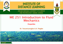 ME 251 Introduction to Fluid Mechanics Properties Dr. Yesuenyeagbe A.K. Fiagbe Course Objectives • Understand the Characteristics/Properties of fluid • Have good knowledge of fluid static • Static Pressure in Fluid • Manometers • Hydrostatic forces • Buoyancy and flotation • Appreciate the importance of dimensions and dimensional analysis in problem solving. 2 Areas to Cover • Characteristics/Properties of Fluid • Properties of fluid (Density, mass density, viscosity). • Thermodynamic properties (compressibility, surface tension and capillarity). 3 Properties of Fluid Intensive and Extensive properties • Intensive properties are independent of the mass of a system. • temperature, • pressure, • density. • Extensive properties are those whose values depend on the size—or extent—of the system. • Total mass, • total volume V, • total momentum • Extensive properties per unit mass are called specific properties. • specific volume (v = V/m) and • specific total energy (e = E/m). 5 Continuum • Matter is made up of atoms that are widely spaced in the gas phase. Yet it is very convenient to disregard the atomic nature of a substance and view it as a continuous, homogeneous matter with no holes, that is, a continuum. • The continuum idealization allows us to treat properties as point functions and to assume that the properties vary continually in space with no jump discontinuities. • This idealization is valid as long as the size of the system we deal with is large relative to the space between the molecules. • The continuum idealization is implicit in many statements we make, such as “the density of water in a glass is the same at any point.” 6 DENSITY AND SPECIFIC GRAVITY • Density is defined as mass per unit volume. Density = M/V • The reciprocal of density is the specific volume v, (volume per unit mass). v=V/m = 1/ • For a differential volume element of mass dm and volume dV, density can be expressed as =dm/dV 7 DENSITY AND SPECIFIC GRAVITY • The density of a substance, in general, depends on temperature and pressure. • The density of most gases is proportional to pressure and inversely proportional to temperature. kP 1 k T P k T 8 DENSITY AND SPECIFIC GRAVITY • Liquids and solids are essentially incompressible substances, and the variation of their density with pressure is usually negligible. • At 20°C, for example, the density of water changes from 998 kg/m3 at 1 atm to 1003 kg/m3 at 100 atm, a change of just 0.5 percent. • The density of liquids and solids depends more strongly on temperature. • At 1 atm, for example, the density of water changes from 998 kg/m3 at 20°C to 975 kg/m3 at 75°C, a change of 2.3 percent, which can still be neglected in many engineering analyses. 9 DENSITY AND SPECIFIC GRAVITY • When a density of a substance is given relative to the density of a well-known substance it is called specific gravity, or relative density, • It the ratio of the density of a substance to the density of some standard substance at a specified temperature. • Usually water is used at 4°C, for which H2O =1000 kg/m3). 1 0 DENSITY AND SPECIFIC GRAVITY • The weight of a unit volume of a substance is called specific weight • where g is the gravitational acceleration. 1 1 Density of Ideal Gases • An equation that relates the pressure, temperature, and density (or specific volume) of a substance is called an equation of state. • The simplest and best-known equation of state for substances in the gas phase is the ideal-gas equation of state, expressed as • where P is the absolute pressure, • v is the specific volume, • T is the thermodynamic (absolute) temperature, • is the density, and • R is the gas constant. 1 2 Density of Ideal Gases • The gas constant R is different for each gas and is determined from R=Ru /M, • where Ru is the universal gas constant and Ru = 8.314 kJ/kmol·K =1.986 Btu/lbmol·R, and • M is the molar mass (also called molecular weight) of the gas. 1 3 Thermodynamic Temperature Scale • The thermodynamic temperature scale in the SI is the Kelvin scale, and the unit is the kelvin, K. • In the English system, it is the Rankine scale, and the unit is the Rankine, R. • Various temperature scales are related by • It is common practice to round the constants 273.15 and 459.67 to 273 and 460, respectively. 1 4 Determine the density, specific gravity and mass of the air in a room whose dimensions are 4m X 5m X 6m at 100kPa and 25oC 1 5 VAPOUR PRESSURE • At a given pressure, the temperature at which a pure substance changes phase is called the Saturation Temperature, Tsat • At a given temperature, the pressure at which a pure substance changes phase is called the Saturation Pressure, Psat • At an absolute pressure of 1 standard atmosphere (1 atm or 101.325 kPa), for example, the saturation temperature of water is 100°C. • Conversely, at a temperature of 100°C, the saturation pressure of water is 1 atm. 1 6 VAPOUR PRESSURE • The Vapour Pressure Pv of a pure substance is the pressure exerted by its vapour in phase equilibrium with its liquid at a given temperature. • Pv is a property of the pure substance, and turns out to be identical to the saturation pressure Psat of the liquid (Pv=Psat). 1 7 VAPOUR PRESSURE • Partial pressure is the pressure of a gas or vapour in a mixture with other gases. • The partial pressure of a vapour must be less than or equal to the vapour pressure if there is no liquid present. • When both vapour and liquid are present and the system is in phase equilibrium, the partial pressure of the vapour must equal the vapour pressure, and the system is said to be saturated. 1 8 CAVITATION • It is possible that the liquid pressure in liquid-flow systems dropped below the vapour pressure at some locations • the result is unplanned vaporization. • The vapour bubbles collapse as they are swept away from the low-pressure regions, gene