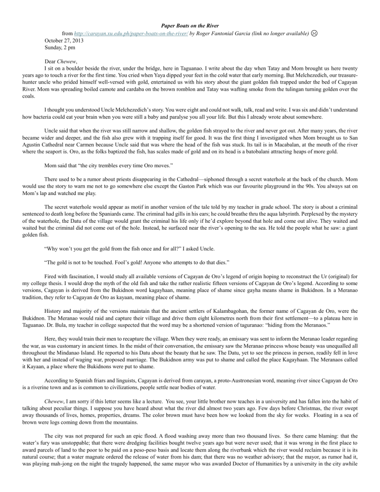 Paper Boats on the River from http://carayan.xu.edu.ph/paper-boats-on-the-river/ by Roger Fantonial Garcia (link no longer available) ☹ October 27, 2013 Sunday, 2 pm Dear Chewew, I sit on a boulder beside the river, under the bridge, here in Taguanao. I write about the day when Tatay and Mom brought us here twenty years ago to touch a river for the first time. You cried when Yaya dipped your feet in the cold water that early morning. But Melchezedich, our treasurehunter uncle who prided himself well-versed with gold, entertained us with his story about the giant golden fish trapped under the bed of Cagayan River. Mom was spreading boiled camote and cardaba on the brown romblon and Tatay was wafting smoke from the tulingan turning golden over the coals. I thought you understood Uncle Melchezedich’s story. You were eight and could not walk, talk, read and write. I was six and didn’t understand how bacteria could eat your brain when you were still a baby and paralyse you all your life. But this I already wrote about somewhere. Uncle said that when the river was still narrow and shallow, the golden fish strayed to the river and never got out. After many years, the river became wider and deeper, and the fish also grew with it trapping itself for good. It was the first thing I investigated when Mom brought us to San Agustin Cathedral near Carmen because Uncle said that was where the head of the fish was stuck. Its tail is in Macabalan, at the mouth of the river where the seaport is. Oro, as the folks baptized the fish, has scales made of gold and on its head is a batobalani attracting heaps of more gold. Mom said that “the city trembles every time Oro moves.” There used to be a rumor about priests disappearing in the Cathedral—siphoned through a secret waterhole at the back of the church. Mom would use the story to warn me not to go somewhere else except the Gaston Park which was our favourite playground in the 90s. You always sat on Mom’s lap and watched me play. The secret waterhole would appear as motif in another version of the tale told by my teacher in grade school. The story is about a criminal sentenced to death long before the Spaniards came. The criminal had gills in his ears; he could breathe thru the aqua labyrinth. Perplexed by the mystery of the waterhole, the Datu of the village would grant the criminal his life only if he’d explore beyond that hole and come out alive. They waited and waited but the criminal did not come out of the hole. Instead, he surfaced near the river’s opening to the sea. He told the people what he saw: a giant golden fish. “Why won’t you get the gold from the fish once and for all?” I asked Uncle. “The gold is not to be touched. Fool’s gold! Anyone who attempts to do that dies.” Fired with fascination, I would study all available versions of Cagayan de Oro’s legend of origin hoping to reconstruct the Ur (original) for my college thesis. I would drop the myth of the old fish and take the rather realistic fifteen versions of Cagayan de Oro’s legend. According to some versions, Cagayan is derived from the Bukidnon word kagayhaan, meaning place of shame since gayha means shame in Bukidnon. In a Meranao tradition, they refer to Cagayan de Oro as kayaan, meaning place of shame. History and majority of the versions maintain that the ancient settlers of Kalambagohan, the former name of Cagayan de Oro, were the Bukidnon. The Meranao would raid and capture their village and drive them eight kilometres north from their first settlement—to a plateau here in Taguanao. Dr. Bula, my teacher in college suspected that the word may be a shortened version of taguranao: “hiding from the Meranaos.” Here, they would train their men to recapture the village. When they were ready, an emissary was sent to inform the Meranao leader regarding the war, as was customary in ancient times. In the midst of their conversation, the emissary saw the Meranao princess whose beauty was unequalled all throughout the Mindanao Island. He reported to his Datu about the beauty that he saw. The Datu, yet to see the princess in person, readily fell in love with her and instead of waging war, proposed marriage. The Bukidnon army was put to shame and called the place Kagayhaan. The Meranaos called it Kayaan, a place where the Bukidnons were put to shame. According to Spanish friars and linguists, Cagayan is derived from carayan, a proto-Austronesian word, meaning river since Cagayan de Oro is a riverine town and as is common to civilizations, people settle near bodies of water. Chewew, I am sorry if this letter seems like a lecture. You see, your little brother now teaches in a university and has fallen into the habit of talking about peculiar things. I suppose you have heard about what the river did almost two years ago. Few days before Christmas, the river swept away thousands of lives, homes, properties, dreams. The color brown must have been how we looked from the sky for weeks. Floating in a sea of brown were logs coming down from the mountains. The city was not prepared for such an epic flood. A flood washing away more than two thousand lives. So there came blaming: that the water’s fury was unstoppable; that there were dredging facilities bought twelve years ago but were never used; that it was wrong in the first place to award parcels of land to the poor to be paid on a peso-peso basis and locate them along the riverbank which the river would reclaim because it is its natural course; that a water magnate ordered the release of water from his dam; that there was no weather advisory; that the mayor, as rumor had it, was playing mah-jong on the night the tragedy happened, the same mayor who was awarded Doctor of Humanities by a university in the city awhile after the Huluga Caves vicinity, former settlement of ancient Cagayanons, was destroyed to build this bridge in Taguanao; that the illegal logging and small-scale mining in the mountains… We belittle