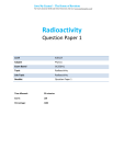 Save My Exams! – The Home of Revision For more awesome GCSE and A level resources, visit us at www.savemyexams.co.uk/ Radioactivity Question Paper 1 Level Edexcel Subject Physics Exam Board GCSE(9-1) Topic Radioactivity Sub Topic Radioactivity Booklet Question Paper 1 Time Allowed: 59 minutes Score: /49 Percentage: /100 Save My Exams! – The Home of Revision For more awesome GCSE and A level resources, visit us at www.savemyexams.co.uk/ Using radiation in hospitals 1 Hospitals use ionising radiation for many purposes. (a) State one use of ionising radiation in a hospital. (1) . . . . . . . ................................... . . . . . . . . . . . . . . . . . . . . . . . . . . . . . . . . . . . . . . . . . . . . . . . . . . . . . . . . . . . . . . . . . . . . ............................................................................................................................................ . . . . . . . . . . . . . . . . . . . . . . . . . . (b) An isotope of technicium, technicium-99, has a half-life of 6 hours. A hospital has a sample which contains 40 mg of technicium-99. Calculate how much technicium-99 will be in this sample after 12 hours. (2) amount remaining = .............................. . . . . . . . . . . . . . . . . mg (c) Every hospital radiographer who works with radiation wears a radiation badge. The badge is used to monitor the amount of radiation the radiographer absorbs each month. (i) Explain why it is important to monitor the amount of radiation a radiographer absorbs each month. (2) . . . . . . . ................................... . . . . . . . . . . . . . . . . . . . . . . . . . . . . . . . . . . . . . . . . . . . . . . . . . . . . . . . . . . . . . . . . . . . . ............................................................................................................................................ . . . . . . . . . . . . . . . . . . . . . . . . . . . . . . . . . ................................... . . . . . . . . . . . . . . . . . . . . . . . . . . . . . . . . . . . . . . . . . . . . . . . . . . . . . . . . . . . . . . . . . . . . ............................................................................................................................................ . . . . . . . . . . . . . . . . . . . . . . . . . . . . . . . . . ................................... . . . . . . . . . . . . . . . . . . . . . . . . . . . . . . . . . . . . . . . . . . . . . . . . . . . . . . . . . . . . . . . . . . . . ............................................................................................................................................ . . . . . . . . . . . . . . . . . . . . . . . . . . . . . . . . . ................................... . . . . . . . . . . . . . . . . . . . . . . . . . . . . . . . . . . . . . . . . . . . . . . . . . . . . . . . . . . . . . . . . . . . . ............................................................................................................................................ . . . . . . . . . . . . . . . . . . . . . . . . . . (ii) Radiographers are restricted to a smaller annual dose of radiation nowadays compared to 50 years ago. Complete the sentence by putting a cross ( ) in the box next to your answer. This is because nowadays, (1) A the radioactive sources have decayed B we can measure radiation more accurately C we have a better understanding of the risks from radiation D we have more effective ways of shielding against radiation Save My Exams! – The Home of Revision For more awesome GCSE and A level resources, visit us at www.savemyexams.co.uk/ *(iii) The radiation badge contains a photographic film which is sensitive to radiation. side view radiation photographic film in light-proof paper jacket radiation badge lead paper aluminium The radiation badge is sent to a laboratory after a month and the film is checked. Explain how the badge shows the amount of different types of radiation that the radiographer has been exposed to. (6) . . . . . . .................................... . . . . . . . . . . . . . . . . . . . . . . . . . . . . . . . . . . . . . . . . . . . . . . . . . . . . . . . . . . . . . . . . . . . . . ........................................................................................................................................... . . . . . . . . . . . . . . . . . . . . . . . . . . . . . . . . .................................... . . . . . . . . . . . . . . . . . . . . . . . . . . . . . . . . . . . . . . . . . . . . . . . . . . . . . . . . . . . . . . . . . . . . . ........................................................................................................................................... . . . . . . . . . . . . . . . . . . . . . . . . . . . . . . . . .................................... . . . . . . . . . . . . . . . . . . . . . . . . . . . . . . . . . . . . . . . . . . . . . . . . . . . . . . . . . . . . . . . . . . . . . ........................................................................................................................................... . . . . . . . . . . . . . . . . . . . . . . . . . . . . . . . . .................................... . . . . . . . . . . . . . . . . . . . . . . . . . . . . . . . . . . . . . . . . . . . . . . . . . . . . . . . . . . . . . . . . . . . . . ........................................................................................................................................... . . . . . . . . . . . . . . . . . . . . . . . . . . . . . . . . .................................... . . . . . . . . . . . . . . . . . . . . . . . . . . . . . . . . . . . . . . . . . . . . . . . . . . . . . . . . . . . . . . . . . . . . . ........................................................................................................................................... . . . . . . . . . . . . . . . . . . . . . . . . . . . . . . . . .................................... . . . . . . . . . . . . . . . . . . . . . . . . . . . . . . . . . . .