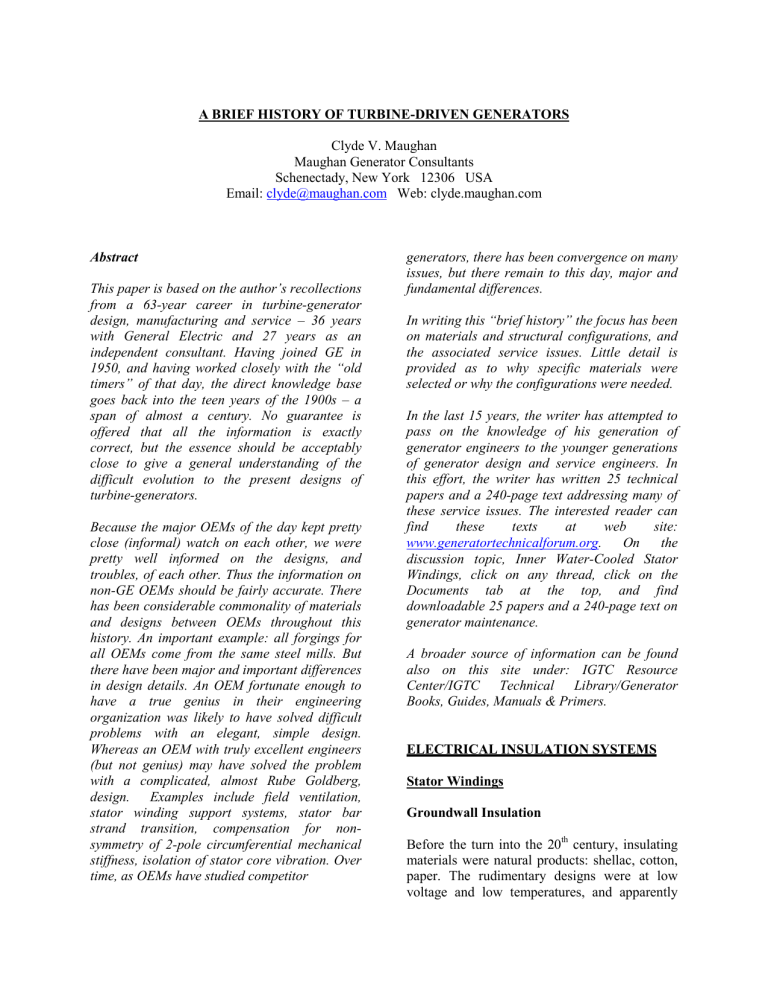 A BRIEF HISTORY OF TURBINE-DRIVEN GENERATORS Clyde V. Maughan Maughan Generator Consultants Schenectady, New York 12306 USA Email: clyde@maughan.com Web: clyde.maughan.com Abstract This paper is based on the author’s recollections from a 63-year career in turbine-generator design, manufacturing and service – 36 years with General Electric and 27 years as an independent consultant. Having joined GE in 1950, and having worked closely with the “old timers” of that day, the direct knowledge base goes back into the teen years of the 1900s – a span of almost a century. No guarantee is offered that all the information is exactly correct, but the essence should be acceptably close to give a general understanding of the difficult evolution to the present designs of turbine-generators. Because the major OEMs of the day kept pretty close (informal) watch on each other, we were pretty well informed on the designs, and troubles, of each other. Thus the information on non-GE OEMs should be fairly accurate. There has been considerable commonality of materials and designs between OEMs throughout this history. An important example: all forgings for all OEMs come from the same steel mills. But there have been major and important differences in design details. An OEM fortunate enough to have a true genius in their engineering organization was likely to have solved difficult problems with an elegant, simple design. Whereas an OEM with truly excellent engineers (but not genius) may have solved the problem with a complicated, almost Rube Goldberg, design. Examples include field ventilation, stator winding support systems, stator bar strand transition, compensation for nonsymmetry of 2-pole circumferential mechanical stiffness, isolation of stator core vibration. Over time, as OEMs have studied competitor generators, there has been convergence on many issues, but there remain to this day, major and fundamental differences. In writing this “brief history” the focus has been on materials and structural configurations, and the associated service issues. Little detail is provided as to why specific materials were selected or why the configurations were needed. In the last 15 years, the writer has attempted to pass on the knowledge of his generation of generator engineers to the younger generations of generator design and service engineers. In this effort, the writer has written 25 technical papers and a 240-page text addressing many of these service issues. The interested reader can find these texts at web site: www.generatortechnicalforum.org. On the discussion topic, Inner Water-Cooled Stator Windings, click on any thread, click on the Documents tab at the top, and find downloadable 25 papers and a 240-page text on generator maintenance. A broader source of information can be found also on this site under: IGTC Resource Center/IGTC Technical Library/Generator Books, Guides, Manuals & Primers. ELECTRICAL INSULATION SYSTEMS Stator Windings Groundwall Insulation Before the turn into the 20th century, insulating materials were natural products: shellac, cotton, paper. The rudimentary designs were at low voltage and low temperatures, and apparently placing in service, significant migration would not occur. functioned fairly well as long as duties were kept sufficiently low. With inevitable trends toward higher voltages and higher thermal and mechanical duties, much better materials were required. Somewhere around the turn of the century, 1899 to 1900, mica flake was discovered to have remarkable electrical and thermal properties. But still with shellac, cotton and other relatively primitive materials incorporated in the systems, troubles continued. By the mid-teen years, 1915, it was discovered that by using a vacuum-pressure cycle, mica/cotton tapes could be impregnated with a hot asphalt compound to obtain a major electrical duty improvement. The net result of these 2 changes (lowering of asphalt flow point and adding linseed oil) was that GE generators over about 40 MW had serious tape migration problems if load was cycled immediately on being placed in service. Otherwise, migration was minor or not at all. Of the ~400 large asphalt-insulated generators built by GE, about 1/3rd were rewound, the remainder is still in service without migration, or have been retired. Tape migration was difficult to reproduce under laboratory conditions because it was dependent on several variables: load cycling, core length, temperature of the bar copper vs. asphalt softening point, tightness of the bar in the slot, direction of tape application. The GE laboratory efforts were not successful, and GE continued to believe the deficiency was a cracking phenomenon (hence the on-going use of the term “girth crack”). Asphalt/mica systems served the industry well for 35 years, although by the late 1920s the tape migration phenomenon had surfaced. At General Electric, this occurred on 2 very long, very large 4-pole generators. The engineers mis-diagnosed the root cause of condition as cracking of the stator groundwall insulation (girth crack) due to too hard a system and lowered the softening point of the asphalt used in the groundwall. This was exactly the wrong change, since the “cracks” were actually resulting from the groundwall migrating in the slot toward the axial centerline of the core. (At operating temperatures the asphalt was basically a liquid.) Photo1. Westinghouse engineers understood the tape migration phenomenon well, but weren’t sufficiently lucky to have added linseed oil. By the mid-1940s, most of their stator windings on their larger generators were experiencing fatal migration. On a crash basis they developed the Thermalastic (an epoxy-like polyester) groundwall system. This was a remarkable accomplishment, particularly in view of the relatively primitive polyester resins available at that time. During the ensuing years, all OEMs developed improved groundwall systems: Micapal (a polyester-like ep