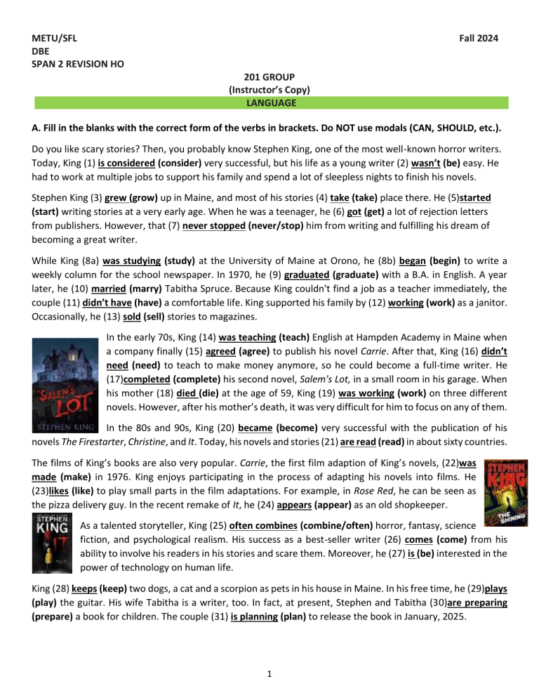 METU/SFL DBE SPAN 2 REVISION HO Fall 2024 201 GROUP (Instructor’s Copy) LANGUAGE A. Fill in the blanks with the correct form of the verbs in brackets. Do NOT use modals (CAN, SHOULD, etc.). Do you like scary stories? Then, you probably know Stephen King, one of the most well-known horror writers. Today, King (1) is considered (consider) very successful, but his life as a young writer (2) wasn’t (be) easy. He had to work at multiple jobs to support his family and spend a lot of sleepless nights to finish his novels. Stephen King (3) grew (grow) up in Maine, and most of his stories (4) take (take) place there. He (5)started (start) writing stories at a very early age. When he was a teenager, he (6) got (get) a lot of rejection letters from publishers. However, that (7) never stopped (never/stop) him from writing and fulfilling his dream of becoming a great writer. While King (8a) was studying (study) at the University of Maine at Orono, he (8b) began (begin) to write a weekly column for the school newspaper. In 1970, he (9) graduated (graduate) with a B.A. in English. A year later, he (10) married (marry) Tabitha Spruce. Because King couldn't find a job as a teacher immediately, the couple (11) didn’t have (have) a comfortable life. King supported his family by (12) working (work) as a janitor. Occasionally, he (13) sold (sell) stories to magazines. In the early 70s, King (14) was teaching (teach) English at Hampden Academy in Maine when a company finally (15) agreed (agree) to publish his novel Carrie. After that, King (16) didn’t need (need) to teach to make money anymore, so he could become a full-time writer. He (17)completed (complete) his second novel, Salem's Lot, in a small room in his garage. When his mother (18) died (die) at the age of 59, King (19) was working (work) on three different novels. However, after his mother’s death, it was very difficult for him to focus on any of them. In the 80s and 90s, King (20) became (become) very successful with the publication of his novels The Firestarter, Christine, and It. Today, his novels and stories (21) are read (read) in about sixty countries. The films of King’s books are also very popular. Carrie, the first film adaption of King’s novels, (22)was made (make) in 1976. King enjoys participating in the process of adapting his novels into films. He (23)likes (like) to play small parts in the film adaptations. For example, in Rose Red, he can be seen as the pizza delivery guy. In the recent remake of It, he (24) appears (appear) as an old shopkeeper. As a talented storyteller, King (25) often combines (combine/often) horror, fantasy, science fiction, and psychological realism. His success as a best-seller writer (26) comes (come) from his ability to involve his readers in his stories and scare them. Moreover, he (27) is (be) interested in the power of technology on human life. King (28) keeps (keep) two dogs, a cat and a scorpion as pets in his house in Maine. In his free time, he (29)plays (play) the guitar. His wife Tabitha is a writer, too. In fact, at present, Stephen and Tabitha (30)are preparing (prepare) a book for children. The couple (31) is planning (plan) to release the book in January, 2025. 1 B. Read the text below, and fill in the blanks with the statements below using RELATIVE/ADJECTIVE CLAUSES. Do NOT change the meaning. The statements are in the correct order. Manga Kissas are everywhere, all around Japan. Kissa is a Japanese word for café, and Manga are Japanese comic books. These Manga cafés are a good choice if you are looking for somewhere to have fun or spend your free time, or even the night if you can’t afford to stay at a hotel. In the past, people could go to these cafés and read Manga for a few hours and escape their busy lives. Now, they have become something different. It now attracts people (1) whose hobbies include video games and music. They offer computer facilities and places for karaoke as well as Manga books. The cafés have a lot of books (2) (that/which)people can read for free. They are open for 24 hours, and they sell food and drinks (3)that/which are affordable for everyone. People often use Manga Kissas as a cheap form of accommodation, too – you pay per hour for your time in the café, but it is much less expensive than a hotel. There are different rooms for teenagers and families. The rooms (4) where teenagers stay are small, and the beds are not very comfortable. On the other hand, the rooms for families are a little bigger. They are not exactly like five-star hotels, but people have their own private space. 1) Their hobbies include video games and music 2) People can read them for free 3) They are affordable for everyone 4) Teenagers stay there C. Mark the best choice for each blank. It is hard to imagine a life without the Internet today. Around 60% of people think that the Internet is one of the most important tools in their lives. When it started (1) _____ the second half of the twentieth century, only scientists and people in government knew how to use it. However, now, many people (2) ____ hours online every day. For example, the average Internet use was six hours and 37 minutes a day per person in 2022. We use it to entertain ourselves, to find information, and to communicate with people. Apart from this, the Internet (3)____ a lot to shop online. 1. a) in b) on c) at d) until 2. a) have been spent b) spend c) have spent d) are spent 3. a) was used b) used c) has used d) is used Amazon.com was one of the first companies (4)_____ products on the Internet. One day, Jeff Bezos made a prediction about the future. He saw that Internet use was growing (5)____, and he thought that people would like to shop on the Internet. He decided to leave his high paying good job and go to Seattle, Washington. At that time, one of his best friends told him, “You shouldn’t leave this job (6)_____ you find a better one. The economy is bad, so you (7) _____ be very careful.” Howeve