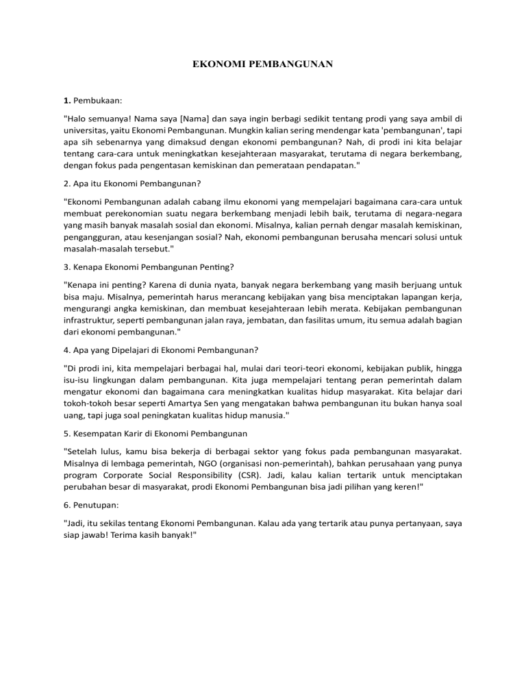 EKONOMI PEMBANGUNAN 1. Pembukaan: "Halo semuanya! Nama saya [Nama] dan saya ingin berbagi sedikit tentang prodi yang saya ambil di universitas, yaitu Ekonomi Pembangunan. Mungkin kalian sering mendengar kata 'pembangunan', tapi apa sih sebenarnya yang dimaksud dengan ekonomi pembangunan? Nah, di prodi ini kita belajar tentang cara-cara untuk meningkatkan kesejahteraan masyarakat, terutama di negara berkembang, dengan fokus pada pengentasan kemiskinan dan pemerataan pendapatan." 2. Apa itu Ekonomi Pembangunan? "Ekonomi Pembangunan adalah cabang ilmu ekonomi yang mempelajari bagaimana cara-cara untuk membuat perekonomian suatu negara berkembang menjadi lebih baik, terutama di negara-negara yang masih banyak masalah sosial dan ekonomi. Misalnya, kalian pernah dengar masalah kemiskinan, pengangguran, atau kesenjangan sosial? Nah, ekonomi pembangunan berusaha mencari solusi untuk masalah-masalah tersebut." 3. Kenapa Ekonomi Pembangunan Penting? "Kenapa ini penting? Karena di dunia nyata, banyak negara berkembang yang masih berjuang untuk bisa maju. Misalnya, pemerintah harus merancang kebijakan yang bisa menciptakan lapangan kerja, mengurangi angka kemiskinan, dan membuat kesejahteraan lebih merata. Kebijakan pembangunan infrastruktur, seperti pembangunan jalan raya, jembatan, dan fasilitas umum, itu semua adalah bagian dari ekonomi pembangunan." 4. Apa yang Dipelajari di Ekonomi Pembangunan? "Di prodi ini, kita mempelajari berbagai hal, mulai dari teori-teori ekonomi, kebijakan publik, hingga isu-isu lingkungan dalam pembangunan. Kita juga mempelajari tentang peran pemerintah dalam mengatur ekonomi dan bagaimana cara meningkatkan kualitas hidup masyarakat. Kita belajar dari tokoh-tokoh besar seperti Amartya Sen yang mengatakan bahwa pembangunan itu bukan hanya soal uang, tapi juga soal peningkatan kualitas hidup manusia." 5. Kesempatan Karir di Ekonomi Pembangunan "Setelah lulus, kamu bisa bekerja di berbagai sektor yang fokus pada pembangunan masyarakat. Misalnya di lembaga pemerintah, NGO (organisasi non-pemerintah), bahkan perusahaan yang punya program Corporate Social Responsibility (CSR). Jadi, kalau kalian tertarik untuk menciptakan perubahan besar di masyarakat, prodi Ekonomi Pembangunan bisa jadi pilihan yang keren!" 6. Penutupan: "Jadi, itu sekilas tentang Ekonomi Pembangunan. Kalau ada yang tertarik atau punya pertanyaan, saya siap jawab! Terima kasih banyak!"
