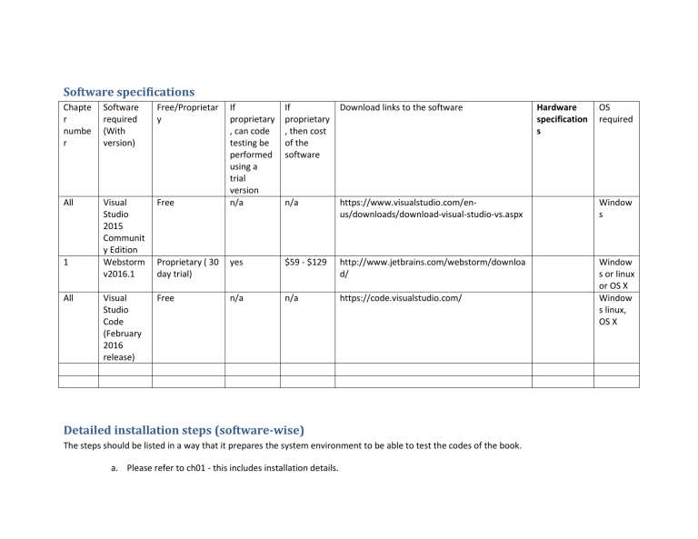 Software specifications Chapte r numbe r Software required (With version) Free/Proprietar y All Visual Studio 2015 Communit y Edition Webstorm v2016.1 Free Visual Studio Code (February 2016 release) 1 All If proprietary , can code testing be performed using a trial version n/a If proprietary , then cost of the software Download links to the software n/a https://www.visualstudio.com/enus/downloads/download-visual-studio-vs.aspx Window s Proprietary ( 30 day trial) yes $59 - $129 http://www.jetbrains.com/webstorm/downloa d/ Free n/a n/a https://code.visualstudio.com/ Window s or linux or OS X Window s linux, OS X Detailed installation steps (software-wise) The steps should be listed in a way that it prepares the system environment to be able to test the codes of the book. a. Please refer to ch01 - this includes installation details. Hardware specification s OS required