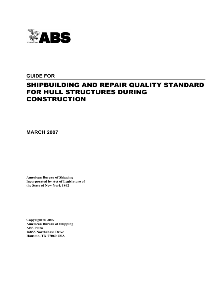 GUIDE FOR SHIPBUILDING AND REPAIR QUALITY STANDARD FOR HULL STRUCTURES DURING CONSTRUCTION MARCH 2007 American Bureau of Shipping Incorporated by Act of Legislature of the State of New York 1862 Copyright © 2007 American Bureau of Shipping ABS Plaza 16855 Northchase Drive Houston, TX 77060 USA This Page Intentionally Left Blank Foreword This Guide contains information obtained from IACS Recommendation No. 47 “Shipbuilding and Repair Quality Standard”. In order to be consistent with ABS requirements, some specific standards have been modified from the original. The modified standards are indicated in the “Remarks” column of the tables, along with the Rule reference. This second edition of the Guide, developed based on IACS Recommendation No. 47 (Rev. 3, Nov. 2006), supersedes the first edition published in July 1998. ABS GUIDE FOR SHIPBUILDING AND REPAIR QUALITY STANDARD FOR HULL STRUCTURES DURING CONSTRUCTION . 2007 iii This Page Intentionally Left Blank GUIDE FOR SHIPBUILDING AND REPAIR QUALITY STANDARD FOR HULL STRUCTURES DURING CONSTRUCTION CONTENTS 1 Applicability............................................................................1 2 Scope ......................................................................................1 3 General Requirements...........................................................2 4 Qualification of Personnel and Procedures ........................2 5 4.1 Qualification of Welders .........................................................2 4.2 Qualification of Welding Procedures......................................2 4.3 Qualifications of NDE Operators............................................2 Materials..................................................................................2 5.1 Materials for Structural Members...........................................2 5.2 Details, Standards and Tolerance Limits ...............................2 TABLE 1 Flanged Longitudinals and Flanged Brackets..............4 TABLE 2 Built-up Sections ..........................................................5 TABLE 3 Corrugated Bulkheads .................................................6 TABLE 4 Pillars, Brackets and Stiffeners ....................................7 TABLE 5 Maximum Heating Temperature on Surface for Line Heating.........................................................................8 TABLE 6 Block Assembly............................................................9 TABLE 7 Special Sub-Assembly ...............................................10 TABLE 8 Shape.........................................................................11 TABLE 9 Shape.........................................................................12 TABLE 10 Fairness of Plating Between Frames.........................13 TABLE 11 Fairness of Plating with Frames.................................14 TABLE 12 Alignment ...................................................................15 TABLE 13 Alignment ...................................................................16 TABLE 14 Alignment ...................................................................17 TABLE 15 Typical Butt Plate Edge Preparation (Manual Welding).......................................................18 TABLE 16 Typical Butt Plate Edge Preparation (Manual Welding).......................................................19 ABS GUIDE FOR SHIPBUILDING AND REPAIR QUALITY STANDARD FOR HULL STRUCTURES DURING CONSTRUCTION . 2007 v vi TABLE 17 Typical Fillet Weld Plate Edge Preparation (Manual Welding) .......................................................20 TABLE 18 Typical Fillet Weld Plate Edge Preparation (Manual Welding) .......................................................21 TABLE 19 Typical Butt and Fillet Weld Profile (Manual Welding) .......................................................22 TABLE 20 Distance Between Welds ...........................................23 TABLE 21 Automatic Welding .....................................................24 TABLE 22 Typical Misalignment Repair......................................25 TABLE 23 Typical Misalignment Repair......................................26 TABLE 24 Typical Misalignment Repair......................................27 TABLE 25 Typical Butt Weld Plate Edge Preparation Repair (Manual Welding) .......................................................28 TABLE 26 Typical Butt Weld Plate Edge Preparation Repair (Manual Welding) .......................................................29 TABLE 27 Typical Fillet Weld Plate Edge Preparation Repair (Manual Welding) .......................................................30 TABLE 28 Typical Fillet Weld Plate Edge Preparation Repair (Manual Welding) .......................................................31 TABLE 29 Typical Fillet Weld Plate Edge Preparation Repair (Manual Welding) .......................................................32 TABLE 30 Typical Fillet and Butt Weld Plate Edge Preparation Repair (Manual Welding) ...........................................33 TABLE 31 Distance Between Welds Repair ...............................34 TABLE 32 Erroneous Hole Repair ..............................................35 TABLE 33 Repair by Insert Plate ................................................36 TABLE 34 Weld Surface Repair..................................................37 ABS GUIDE FOR SHIPBUILDING AND REPAIR QUALITY STANDARD FOR HULL STRUCTURES DURING CONSTRUCTION . 2007 1 Applicability This Guide provides guidance on shipbuilding quality standards for the hull structure during construction. Whereas the standard generally applies to: • Conventional ship types • Hull structures constructed from normal and higher strength hull structural steel, the applicability of the standard is in each case to be agreed upon by the Bureau The standard generally does not apply to the new construction of: • Special types of ships as, e.g., gas tankers • Structures fabricated from stainless steel or other, special type