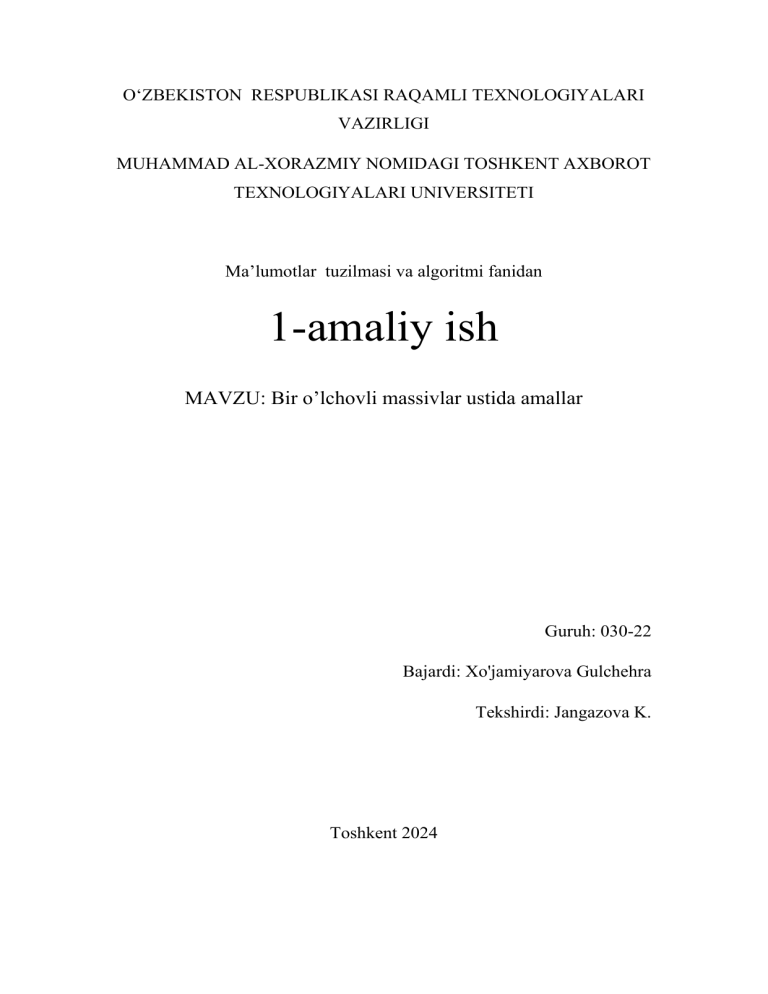 O‘ZBEKISTON RESPUBLIKASI RAQAMLI TEXNOLOGIYALARI VAZIRLIGI MUHAMMAD AL-XORAZMIY NOMIDAGI TOSHKENT AXBOROT TEXNOLOGIYALARI UNIVERSITETI Ma’lumotlar tuzilmasi va algoritmi fanidan 1-amaliy ish MAVZU: Bir o’lchovli massivlar ustida amallar Guruh: 030-22 Bajardi: Xo'jamiyarova Gulchehra Tekshirdi: Jangazova K. Toshkent 2024 19. Massiv elementlarini yig'indisi 100 dan oshmaguncha qo'shish. Python dasturlash tilida : Massivni aniqlaymiz elements = [10, 20, 30, 25, 15] # O'zingiz xohlagan elementlarni qo'shishingiz mumkin # Yig'indini saqlash uchun o'zgaruvchi total_sum = 0 # Elementlarni qo'shish for element in elements: if total_sum + element > 100: break # Yig'indi 100 dan oshsa, to'xtaymiz total_sum += element print("Yig'indi:", total_sum) Dastruning ishlash tartibi : Massiv elements belgilangan raqamlar bilan to'ldiriladi. total_sum o'zgaruvchisi yig'indini saqlash uchun ishlatiladi va dastlab 0 ga teng. Massivdagi har bir element ustida aylanamiz: Agar yig'indi 100 dan oshsa, siklni to'xtatamiz. Aks holda, elementni yig'indiga qo'shamiz. Yakuniy yig'indini chiqaramiz. Natijasi esa : elements = [10, 20, 30, 25, 15] # Yig'indini saqlash uchun o'zgaruvchi total_sum = 0 # Elementlarni qo'shish for element in elements: if total_sum + element > 100: break # Yig'indi 100 dan oshsa, to'xtaymiz total_sum += element print("Yig'indi:", total_sum) Dastur ishlashi total_sum dastlab 0 ga teng. Birinchi element (10) qo'shiladi: 0 + 10 = 10. Ikkinchi element (20) qo'shiladi: 10 + 20 = 30. Uchinchi element (30) qo'shiladi: 30 + 30 = 60. To'rtinchi element (25) qo'shiladi: 60 + 25 = 85. Beshinchi element (15) qo'shilganda: 85 + 15 = 100, lekin bu 100 dan oshadi, shuning uchun to'xtaydi. Natijada, yig'indisi 85 bo'ladi. Yakuniy jabov esa 85.