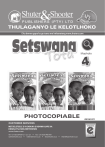 THULAGANYO LE KELOTLHOKO E ka bonwa gape ka go tsena mo inthaneteng www.shuters.com Mophato 4 PHOTOCOPIABLE OS1001271 CUSTOMER SERVICES METSELETSELE E YA DIBUKA E BONWA GAPE KA DIBUKA TSA SEELEKETERONIKI www.shuters.com Tel: +27 (0)33 846 8721 / 22 / 23 • Fax: +27 (0)33 846 8701 sylvie@shuter.co.za • robert@shuter.co.za • tiny@shuter.co.za • thandeka@shuter.co.za 1 Grade 4 KGWEDITHARO 1 Beke Beke 1 le Beke 2 Beke 3 le Beke 4 2 Kgaolo 1. BOMEFUTAFUTA Matseno • Thuto ya kgaolo • Se se itseweng THUTO 1 Go reetsa le go bua Dikgato tsa theetso Go reetsa puiso ya kgangkhutshwe Tirogae Patlisiso le pegelo Go araba dipotso ka molomo Tlotlofoko THUTO 2 Go buisa le go lebelela Dikgato tsa puiso Go buisa kgangkhutshwe Go araba dipotso ka kgangkhutshwe THUTO 3 Go kwala le go tlhagisa Dikgato tsa go kwala (Letlhomeso) Go kwala tlhamo THUTO 4 Popego ya puo le melawana ya tiriso Kgato ya go dira ka dipolelo: Polelonolo Pakajaanong Pakapheti Kgato ya go dira ka mafoko: Madirimafetedi Maina Mopeleto Matshwao a puiso (. le ,) khutlo le phegelwana THUTO 5 Tekanyetso Go buisa kgangkhutshwe Go araba dipotso ka kgangkhutshwe Go kwala tlhamo Dipolelonolo Pakajaanong Pakapheti Itekanyetso 2. BOTSHELO JO BO ITEKANETSENG Matseno • Thuto ya kgaolo • Se se itseweng Tsebe 1 2-6 6-12 12-14 15-17 18-19 19 Dikaelo go Morutabana THUTO 1 Go reetsa le go bua Dikgato tsa theetso Go buisa ditshwantsho Go ranola ditshwantsho Go neela motlotlo o o ipaakanyeditsweng THUTO 2 Go buisa le go lebelela Dikgato tsa puiso Go buisa ditshwantsho Go araba dipotso gape ka setshwantsho Tlotlofoko THUTO 3 Go kwala le go tlhagisa Dikgato tsa go kwala (Letlhomeso) Go kwala athikele Tlotlofoko THUTO 4 Popego ya puo le melawana ya tiriso Kgato ya go dira ka dipolelo: Pakajaanong Pakatlang Matshwao a puiso Tlotlofoko THUTO 5 Itekanyetso Beke 5 le 3. LE NNA KE ARABILWE Matseno Beke 6 • Thuto ya kgaolo • Se se itseweng THUTO 1 Go reetsa le go bua Dikgato tsa theetso Go reetsa puiso ya naane Tlotlofoko Go araba dipotso ka molomo THUTO 2 Go buisa le go lebelela Dikgato tsa go buisa Go buisa athikele ya naane Go tlhomaganya ditiragalo tsa naane ka tshwanelo Go araba dipotso ka naane Tlotlofoko THUTO 3 Go kwala le go tlhagisa Dikgato tsa go kwala (Letlhomeso) Go kwala naane Tlotlofoko 20-23 23-24 25-26 26-28 28 29 30-34 34-36 36 3 THUTO 4 Popego ya puo le melawana ya tiriso Kgato ya go dira ka dipolelo: Leina: sediri, lediri Kgato ya go dira ka mafoko: Maemedi Tlotlofoko Matswao a puiso THUTO 5 Itekanyetso Beke 7 le 4. GO TSAYA DITAELO Matseno Beke 8 • Thuto ya kgaolo Beke 9 le Beke 10 4 • Se se itseweng THUTO 1 Go reetsa le go bua Dikgato tsa theetso Go reetsa ditaelo Go buisana le go diragatsa temana ya ditaelo Go araba dipotso tsa molomo Tlotlofoko THUTO 2 Go buisa le go lebelela Go buisa temana Tirogae Go araba dipotso ka ga ditaelo Tlotlofoko THUTO 3 Go kwala le go tlhagisa Dikgato tsa go kwala (Letlhomeso) Go kwala tatelano ya dintlha tsa ditaelo Go kwala ditaelo Tlotlofoko THUTO 4 Popego ya puo le melawana ya tiriso Kgato ya go dira ka dipolelo: Tirwa Kgato ya go dira ka mafoko: Maemedi Bongwe le bontsi jwa maina Tlotlofoko THUTO 5 Itekanyetso 5. ITSE GO BOKA Matseno • Thuto ya kgaolo • Se se itseweng 37-40 40 41 42-46 47-51 51-55 55-58 58 59 THUTO 1 Go reetsa le go bua Dikgato tsa theetso Go reetsa puiso ya leboko Go araba dipotso tsa molomo ka ga theetso Go ipuisetsa leboko Tlotlofoko THUTO 2 Go buisa le go lebelela Dikgato tsa puiso Puiso ya leboko Go araba dipotso ka leboko Go lemoga diponagalo tsa leboko Tlotlofoko THUTO 3 Go kwala le go tlhagisa Dikgato tsa go kwala (Letlhomeso) Go kwala leboko Tlotlofoko THUTO 4 Popego ya puo le melawana ya tiriso Kgato ya go dira ka dipolelo: Go dirisa dikarolo tsa puo mo dipolelong Pakajaanong le pakapheti Kgato ya go dira ka mafoko: Mainagoboka Mainagotlhe Mainakgopolo Mainatswako Maemedi Marui Makaelagongwe Malatodi Tlotlofoko THUTO 5 Itekanyetso 60-63 63-65 65-67 68-72 72 KGWEDITHARO 2 Beke Beke 1 le Beke 2 Kgaolo 6. JAANONG O TLA ITSE Matseno • Thuto ya kgaolo • Se se itseweng THUTO 1 Go reetsa le go bua Dikgato tsa theetso Go reetsa pegelo ka maemo a bosa Go tlotla ka maemo a bosa Go araba dipotso ka maemo a bosa Tlotlofoko Tsebe Dikaelo go Morutabana 73 74-77 5 Beke 3 le Beke 4 6 THUTO 2 Go buisa le go lebelela Dikgato tsa puiso Go buisa le go bapisa ditlhangwa tse di buisitsweng THUTO 3 Go kwala le go tlhagisa Dikgato tsa go kwala (Letlhomeso) Go kwala le go itlhamela setlhangwa sa pono THUTO 4 Popego ya puo le melawana ya tiriso Kgato ya go dira ka dipolelo: Pakapheti le pakajaanong Kgato ya go dira ka mafoko: Matlhaodi Puo ya papiso Tlotlofoko THUTO 5 Tekanyetso Go kwala setlhangwa sa pono Go araba dipotso ka temana ya tshedimosetso Itekanyetso 7. MPOLELELE DILO O MPOLELELE Matseno • Thuto ya kgaolo • Se se itseweng THUTO 1 Go reetsa le go bua Dikgato tsa theetso Go reetsa kgangkhutshwe Go buisana ka kgangkhutshwe Tirogae: Go itlhamela kgangkhutshwe THUTO 2 Go buisa le go lebelela Dikgato tsa puiso Go buisa kgangkhutshwe Go araba dipotso ka ga kgangkhutshwe Tlotlofoko THUTO 3 Go kwala le go tlhagisa Dikgato tsa go kwala (Letlhomeso) Go araba dipotso morago ga go buisa ditshwantsho. Tlotlofoko 77-78 78-79 79 80 81 82-84 84-85 86-88 Beke 5 le Beke 6 THUTO 4 Popego ya puo le melawana ya tiriso Kgato ya go dira ka dipolelo: Pakajaanong Kgato ya go dira ka mafoko: Maina: bongwe le bontsi Mopeleto Matshwao a puiso THUTO 5 Tekanyetso Go tlotla ka kgangkhutshwe Go buisa kgangkhutshwe Go kwala tlhamo ka setlhogo se o se filweng Go dirisa maina mo bongweng le mo bontsing. Itekanyetso 8. KE SA NTSE KE REEDITSE Matseno • Thuto ya kgaolo • Se se itseweng THUTO 1 Go reetsa le go bua Dikgato tsa theetso Go reetsa kgangkhutshwe ya dianelwaphologolo Go buisana ka kgangkhutshwe la dianelwaphologolo THUTO 2 Go buisa le go lebelela Dikgato tsa puiso Go buisa kgangkhutshwe Go araba dipotso ka se se buisitsweng. THUTO 3 Go kwala le go tlhagisa Dikgato tsa go kwala (Letlhomes