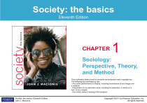 Society: the basics Eleventh Edition CHAPTER 1 Sociology: Perspective, Theory, and Method This multimedia product and its contents are protected under copyright law. The following are prohibited by law: - Any public performance or display, including transmission of any image over a network; - Preparation of any derivative work, including the extraction, in whole or in part, of any images; - Any rental, lease or lending of the program. Society: the basics, Eleventh Edition John J. Macionis Copyright ©2011 by Pearson Education, Inc. All rights reserved. The Sociological Perspective • Sociology – The systematic study of human society At the heart of the discipline is a distinctive point of view called the sociological perspective Society: the basics, Eleventh Edition John J. Macionis Copyright ©2011 by Pearson Education, Inc. All rights reserved. The Sociological Perspective: Seeing the General in the Particular • Seeing general patterns in the behavior of particular individuals. • The general categories which we fall into shape our particular life experiences. • Question: – How are your life experiences shaped by the general categories into which you happen to fall (or have been placed) into? List the categories and give examples. Society: the basics, Eleventh Edition John J. Macionis Copyright ©2011 by Pearson Education, Inc. All rights reserved. The Sociological Perspective: Seeing the Strange in the Familiar • Looking sociologically requires us to give up the familiar idea that human behavior is simply a matter of what people decide to do in favor of the initially strange notion that society guides our thoughts and deeds. Society: the basics, Eleventh Edition John J. Macionis Copyright ©2011 by Pearson Education, Inc. All rights reserved. The Sociological Perspective: Seeing the Strange in the Familiar • Brainstorm about three “familiar” practices in the United States. – Now find something “strange” about each of the practices. Discuss why they seem strange, now that you are using the sociological perspective. Society: the basics, Eleventh Edition John J. Macionis Copyright ©2011 by Pearson Education, Inc. All rights reserved. Image Bank Society: the basics, Eleventh Edition John J. Macionis Copyright ©2011 by Pearson Education, Inc. All rights reserved. The Sociological Perspective: Seeing Personal Choice in Social Context • Human behavior is not as individualistic as we may think. • Why do people resist the idea that they act in socially patterned ways? Society: the basics, Eleventh Edition John J. Macionis Copyright ©2011 by Pearson Education, Inc. All rights reserved. The Sociological Perspective: Seeing Personal Choice in Social Context • Durkheim’s Study of Suicide – Higher suicide among whites and men reflect greater wealth and freedom – Lower rate among women and people of color reflect limited social choices – Social Integration – the degree to which people are tied to their social group. Society: the basics, Eleventh Edition John J. Macionis Copyright ©2011 by Pearson Education, Inc. All rights reserved. Image Bank Society: the basics, Eleventh Edition John J. Macionis Copyright ©2011 by Pearson Education, Inc. All rights reserved. Seeing Sociologically: Marginality • Social Marginality – being excluded from social activity as an “outsider.” • TAKE A STEP BACK… – Have you ever been treated as an outsider? Why? Society: the basics, Eleventh Edition John J. Macionis Copyright ©2011 by Pearson Education, Inc. All rights reserved. Seeing Sociologically: Marginality • The greater a person’s marginality, the better able they are to use the sociological perspective • To become better at using the sociological perspective, step back from familiar routines Society: the basics, Eleventh Edition John J. Macionis Copyright ©2011 by Pearson Education, Inc. All rights reserved. Seeing Sociologically: Social Crisis • Periods of change or crisis makes everyone feel off balance, encouraging the use of the sociological perspective • How did the Great Depression (1930s) and the events taking place in the 1960s spark sociological thinking? – C. Wright Mills (1959) Using the sociological imagination helps people understand their society and how it affects their own lives Society: the basics, Eleventh Edition John J. Macionis Copyright ©2011 by Pearson Education, Inc. All rights reserved. The Importance of a Global Perspective • Global Perspective – The study of the larger world and our society’s place in it. Society: the basics, Eleventh Edition John J. Macionis Copyright ©2011 by Pearson Education, Inc. All rights reserved. The Importance of a Global Perspective • What is the importance of a global perspective for sociology? – Sociology shows that our place in society profoundly affects our life experiences. – How would your life be different if you would have been born and raised in a low-income country verse that of a middle- or high-income nation? Society: the basics, Eleventh Edition John J. Macionis Copyright ©2011 by Pearson Education, Inc. All rights reserved. Benefits of Global Thinking • Thinking globally helps us learn more about ourselves. • In an increasingly interconnected world, we can understand ourselves to the extent that we understand others • Sociology is an invitation to learn a new way of looking at the world around us Society: the basics, Eleventh Edition John J. Macionis Copyright ©2011 by Pearson Education, Inc. All rights reserved. Applying the Sociological Perspective • Sociology is at work guiding many of the laws and policies that shape our lives. • On an individual level, making use of the sociological perspective leads to important personal growth and expanded awareness • Studying sociology is excellent preparation for the world of work Society: the basics, Eleventh Edition John J. Macionis Copyright ©2011 by Pearson Education, Inc. All rights reserved. Sociolo
